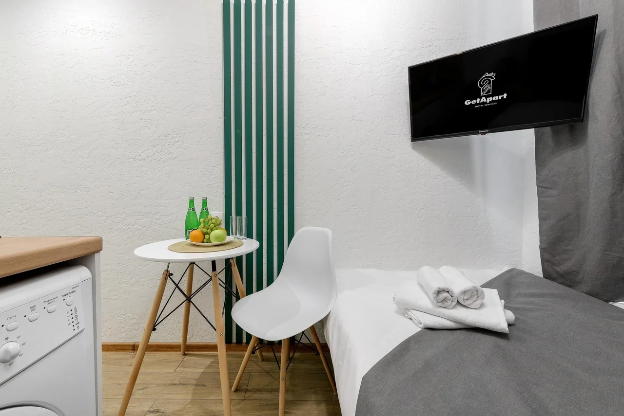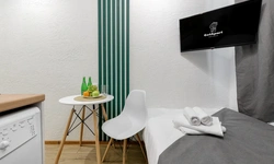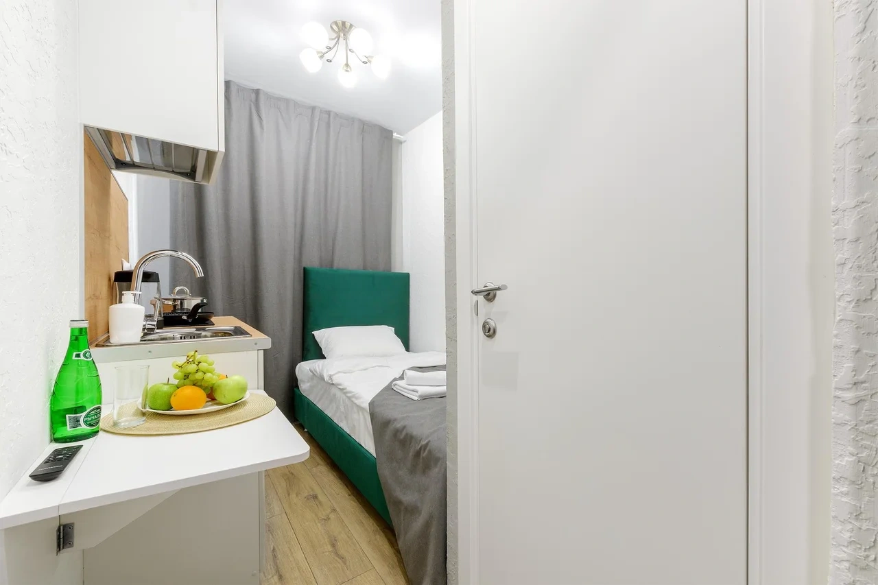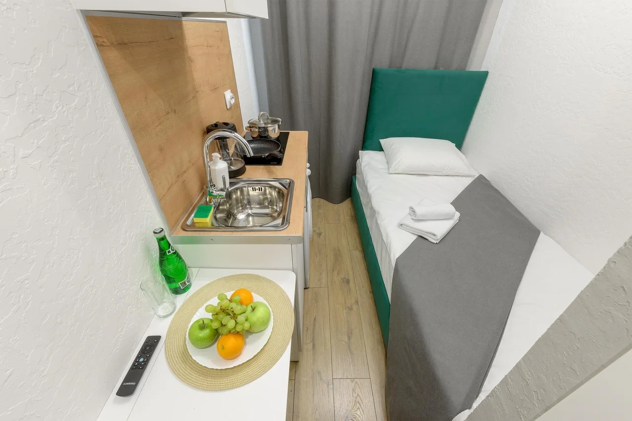 Апартаменты оснащены всем необходимым для комфортного и уютного проживания. В Вашем распоряжении: односпальная кровать 90х200 (постельное белье и полотенце входят в стоимость проживания), телевизор, беспроводной WIFI, стиральная машина, фен для волос, персональная мини кухня укомплектована всей кухонной утварью (варочная панель, электрочайник, посуда и средство для мытья посуды), собственный душ и санузел.