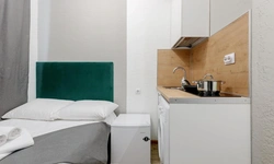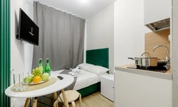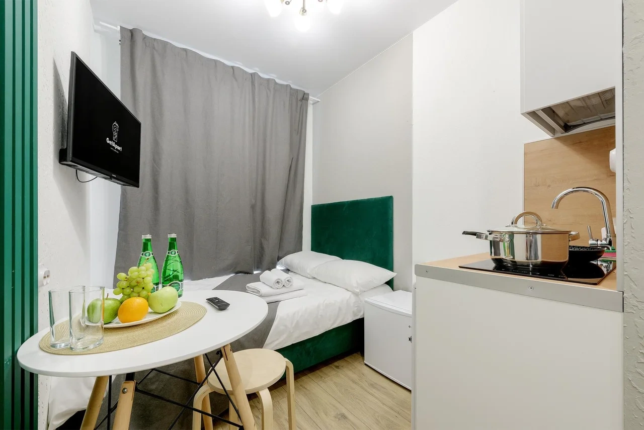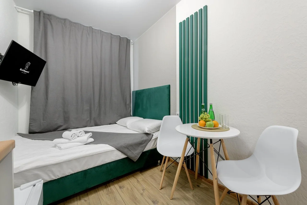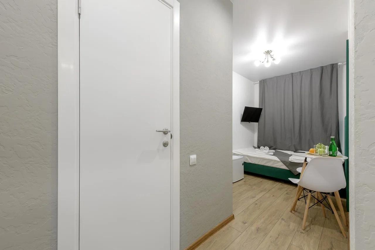 Апартаменты оснащены всем необходимым для комфортного и уютного проживания. В Вашем распоряжении: односпальная кровать 90х200 (постельное белье и полотенце входят в стоимость проживания), телевизор, беспроводной WIFI, стиральная машина, фен для волос, персональная мини кухня укомплектована всей кухонной утварью (варочная панель, электрочайник, посуда и средство для мытья посуды), собственный душ и санузел.