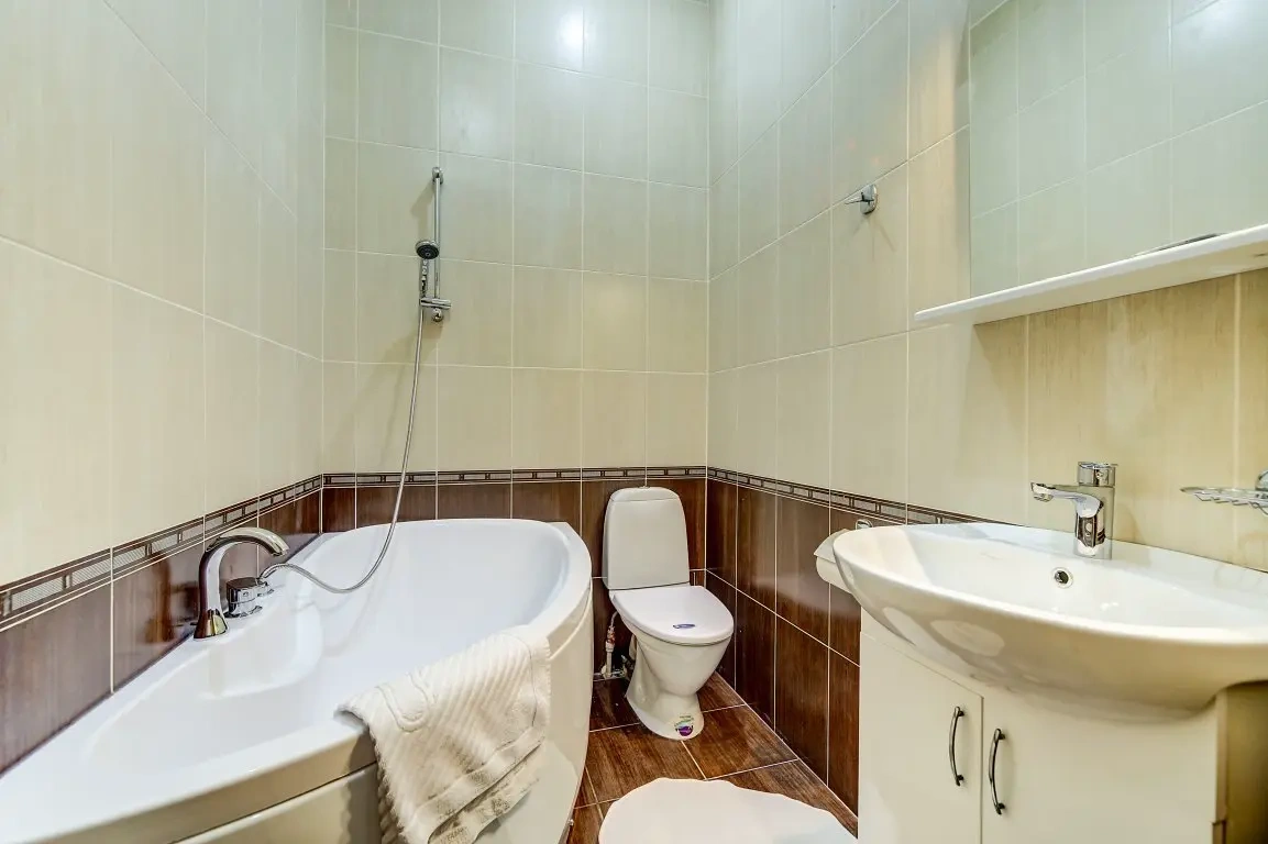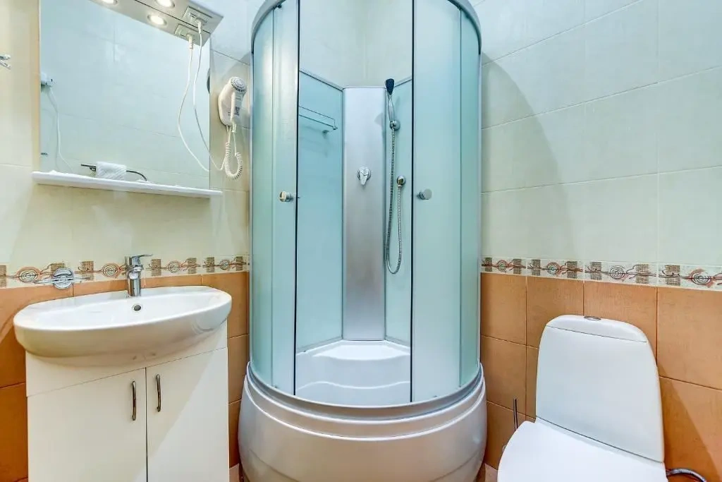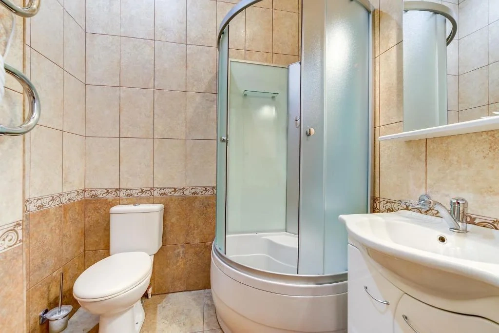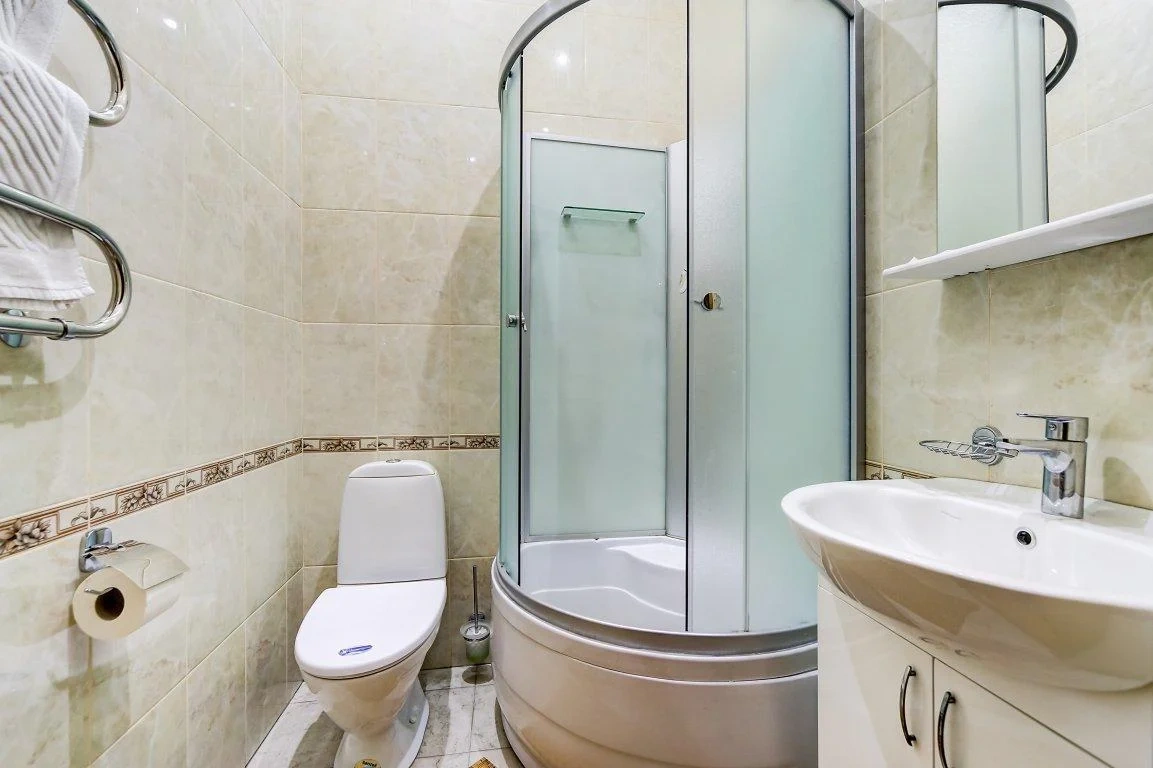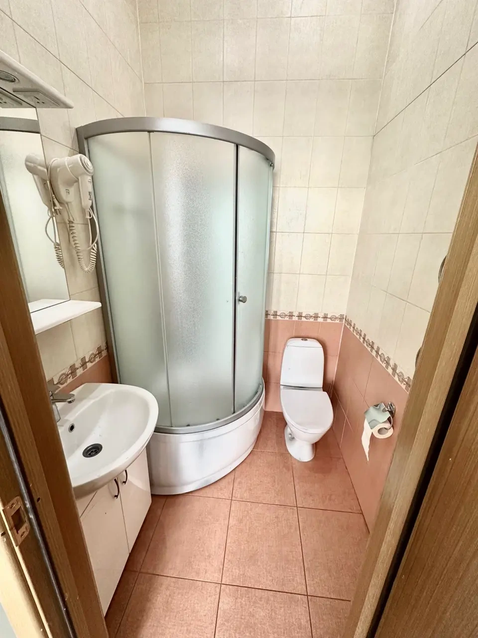Ванных принадлежностей нет кроме полотенец, душевая кабина ушатанная, в парадной и лифте грязно как в общаге