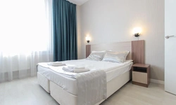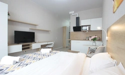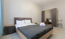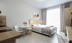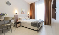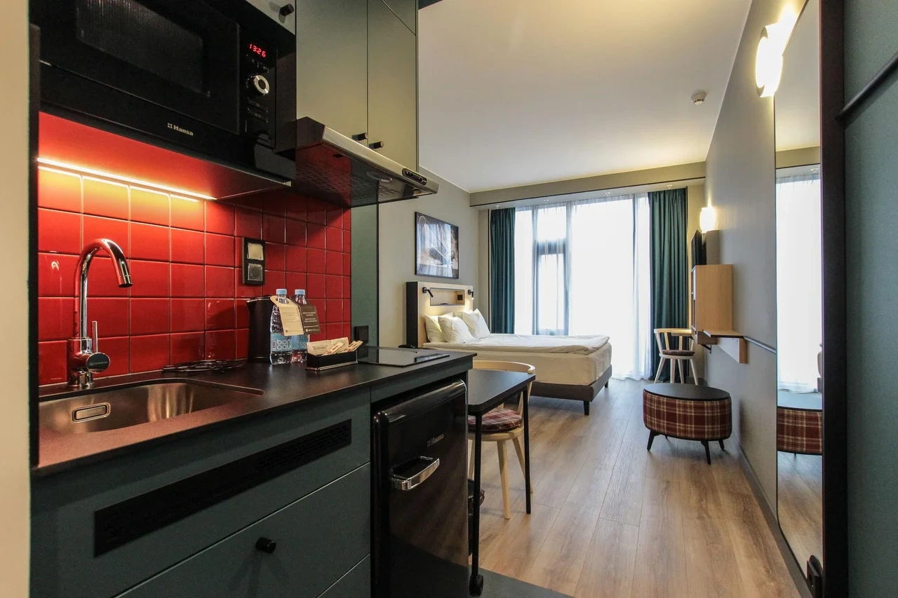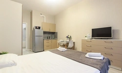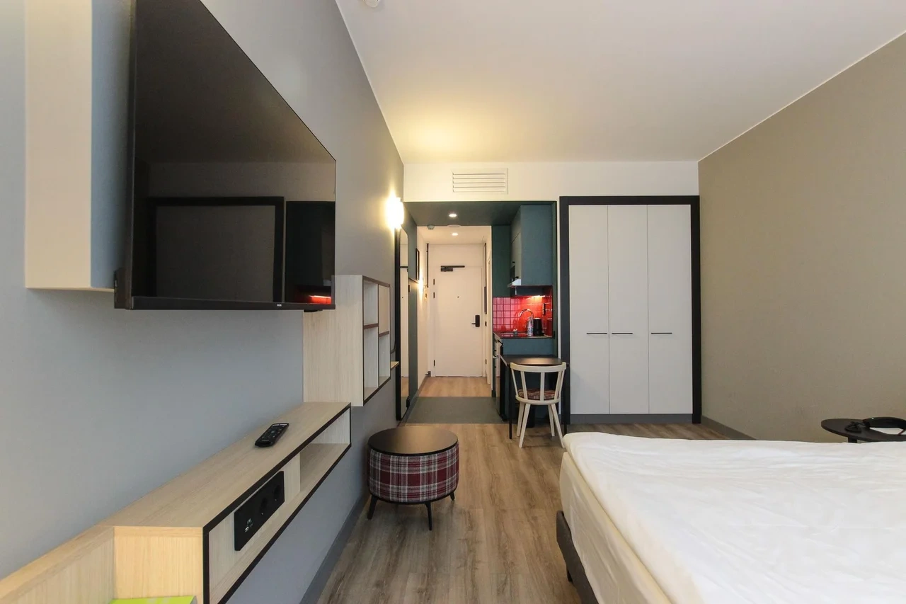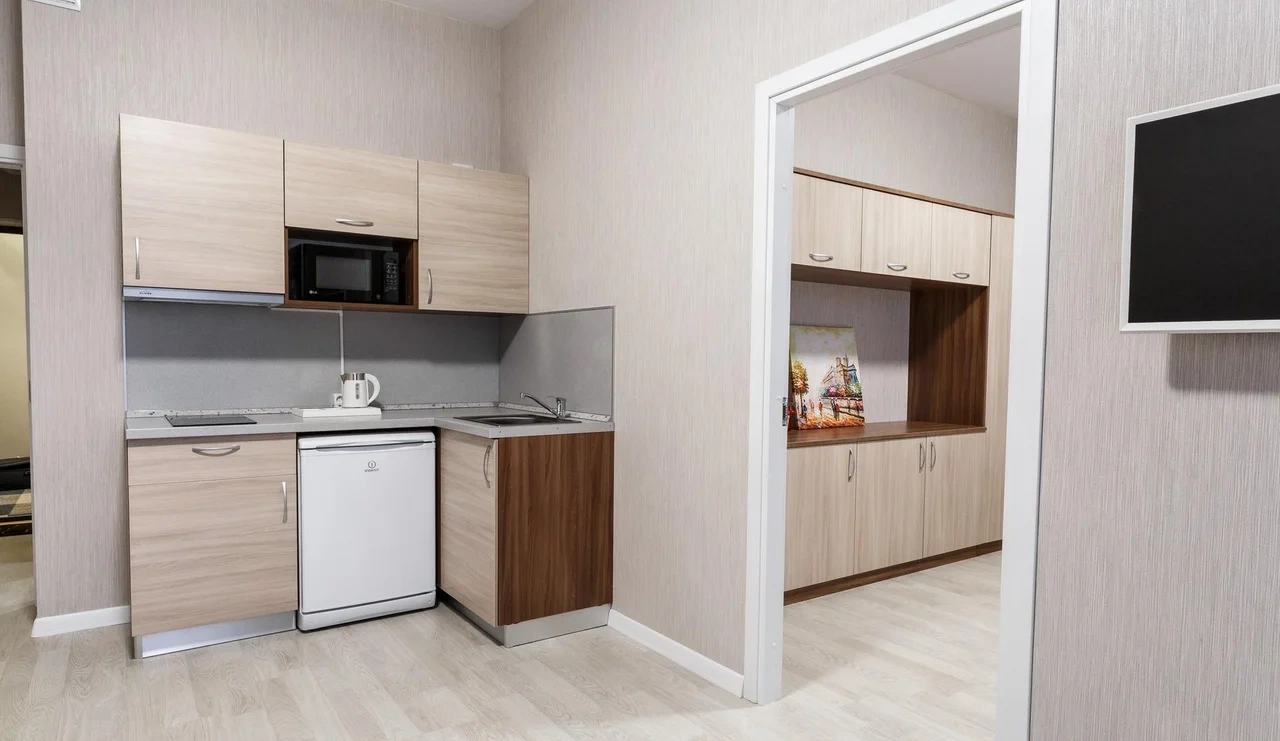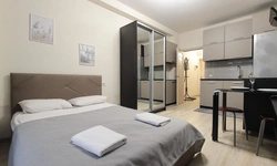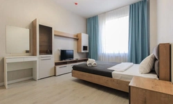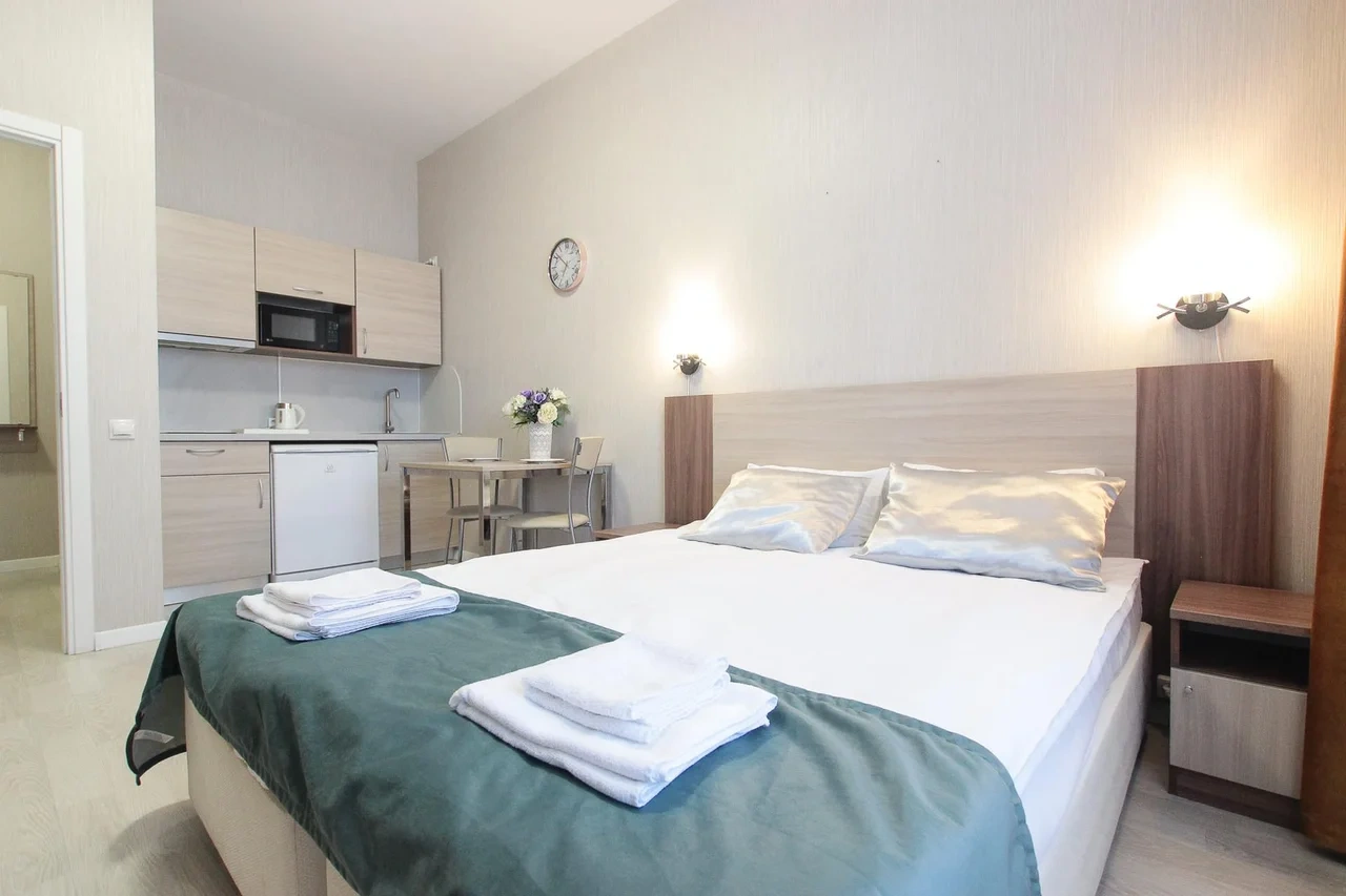 Просторный номер площадью 30 кв.м. с одной двуспальной кроватью. Стильный интерьер и функциональная мини-кухня обеспечивает максимальный комфорт пребывания. Каждый номер оснащен мини-кухней с холодильником, варочной поверхностью и набором посуды, рабочей зоной, беспроводным интернетом и ЖК-телевизором. Ванная комната с душевой кабиной, набором необходимых принадлежностей, включая фен.