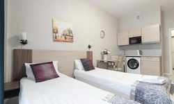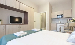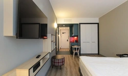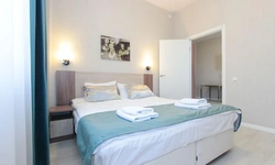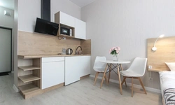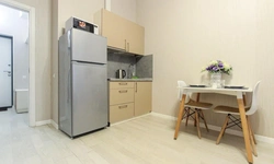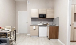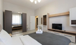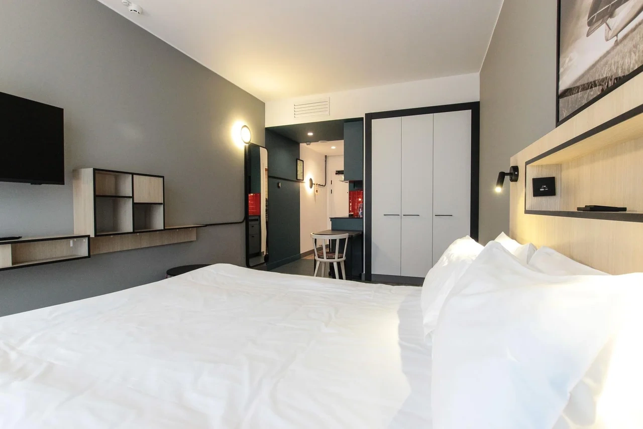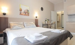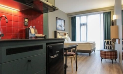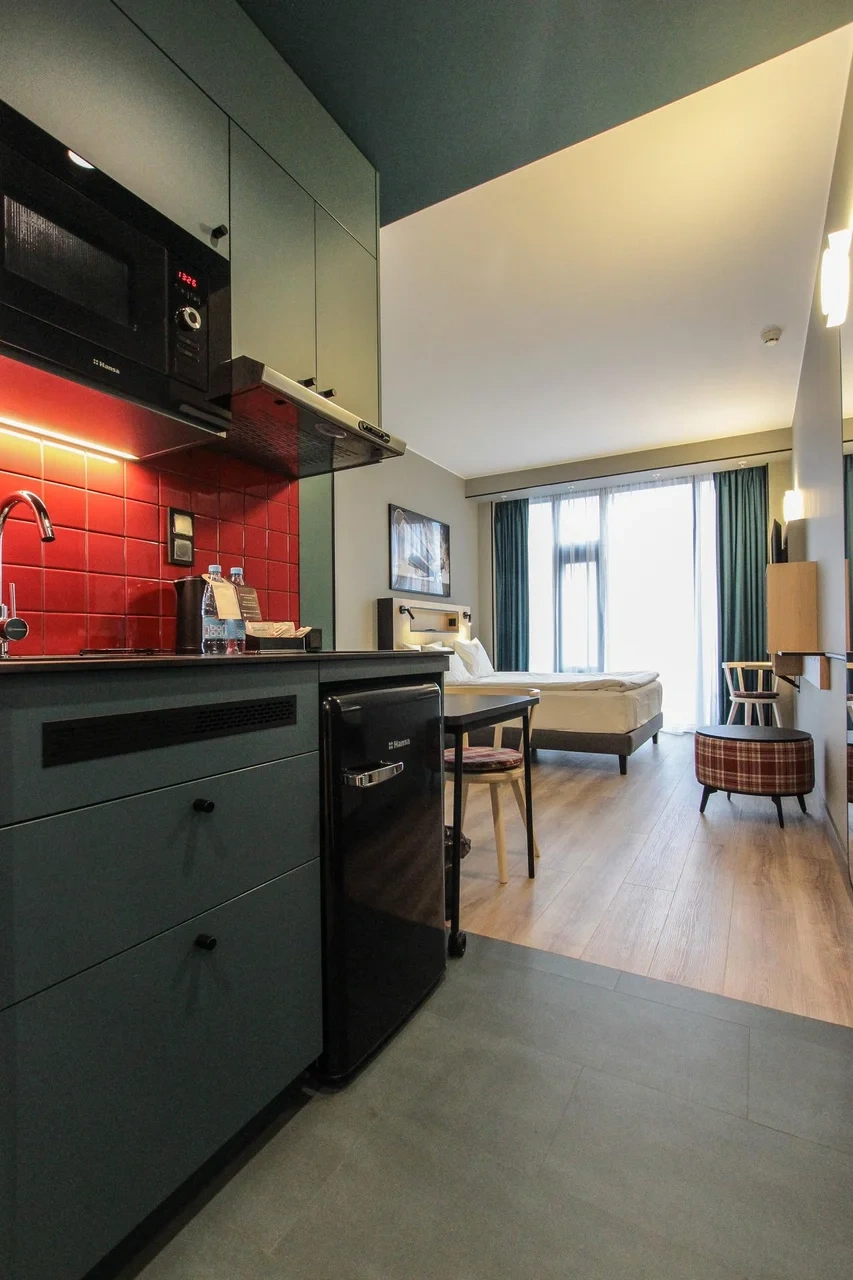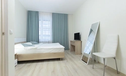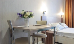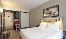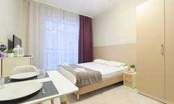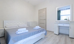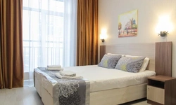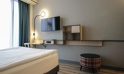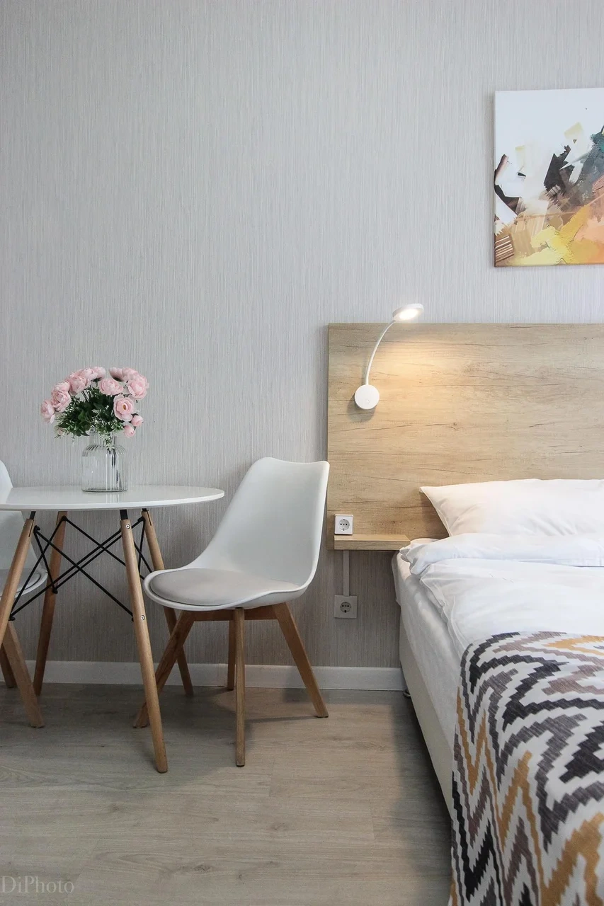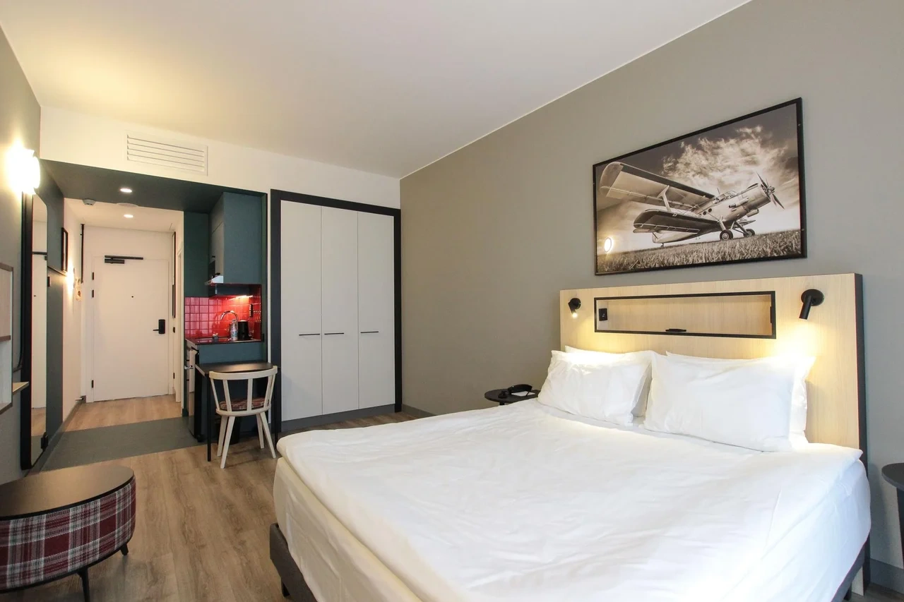 Просторный номер площадью 30 кв.м. с одной двуспальной кроватью. Стильный интерьер и функциональная мини-кухня обеспечивает максимальный комфорт пребывания. Каждый номер оснащен мини-кухней с холодильником, варочной поверхностью и набором посуды, рабочей зоной, беспроводным интернетом и ЖК-телевизором. Ванная комната с душевой кабиной, набором необходимых принадлежностей, включая фен.