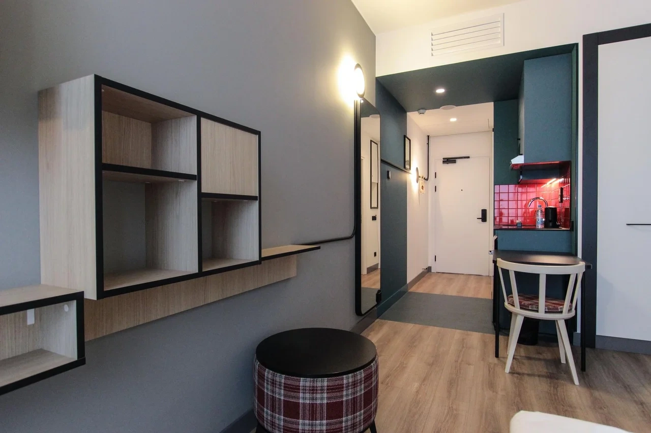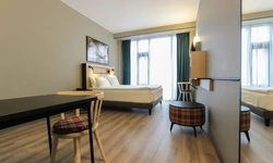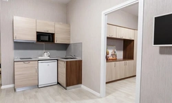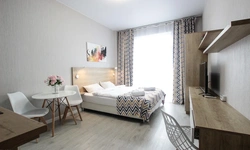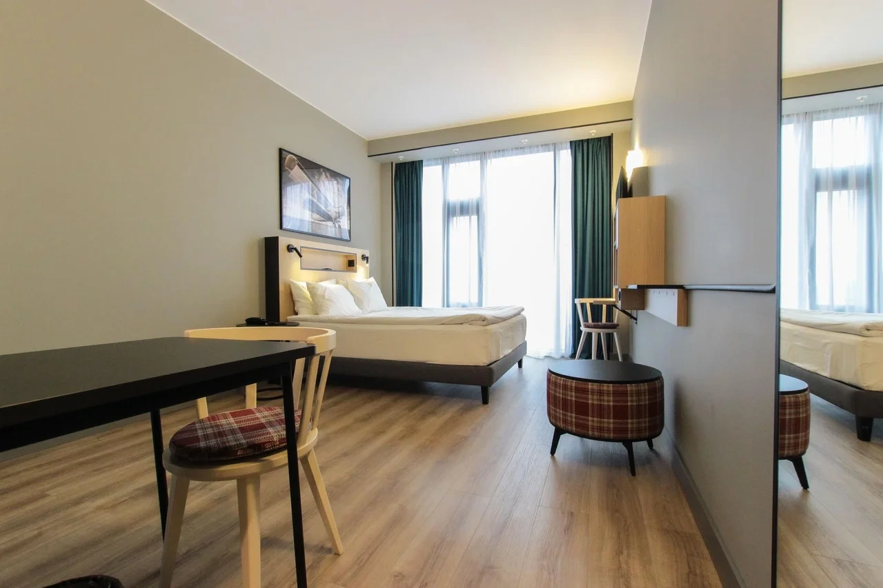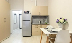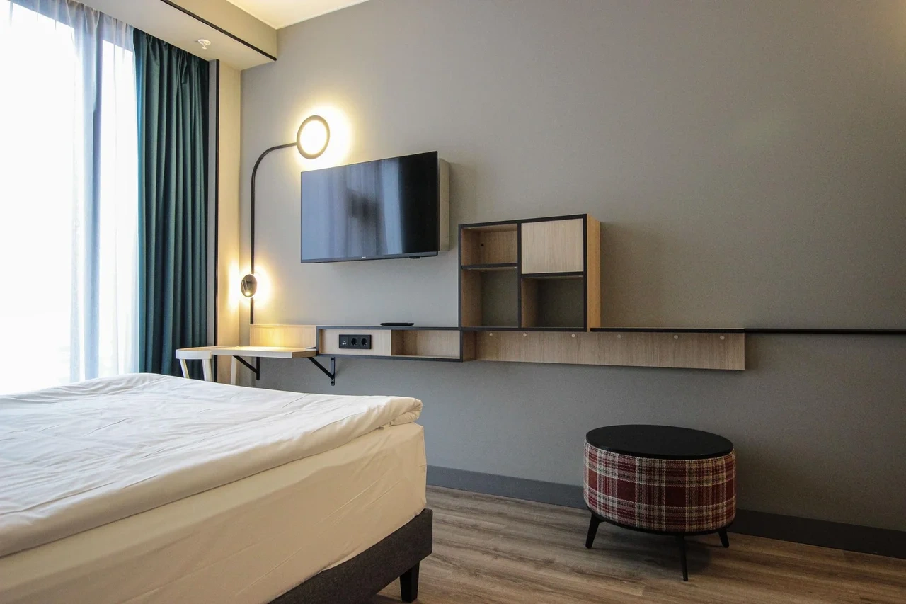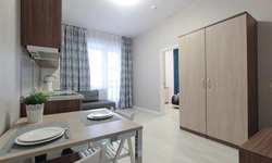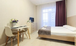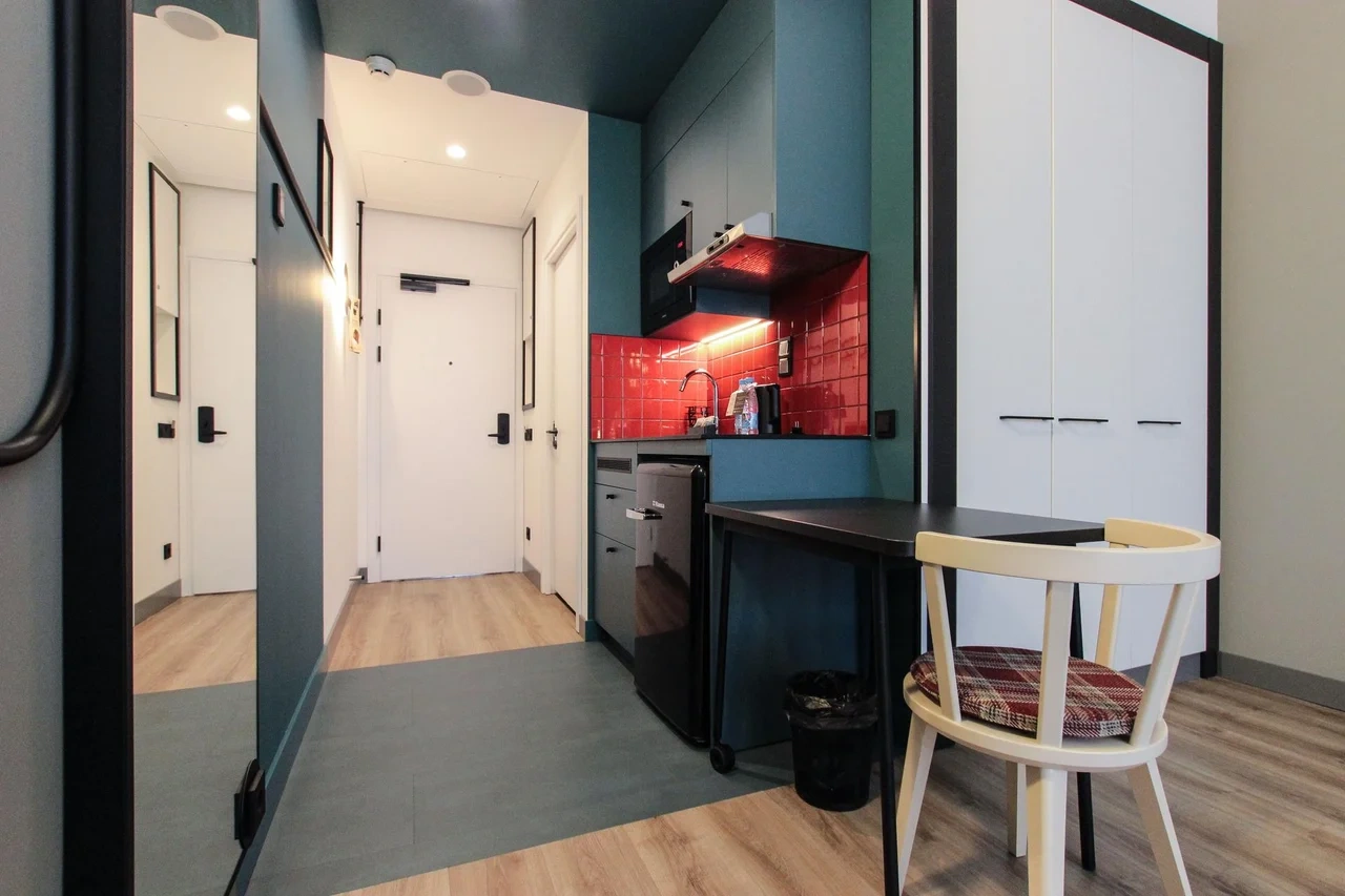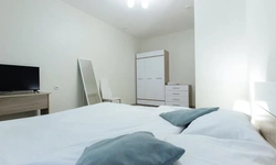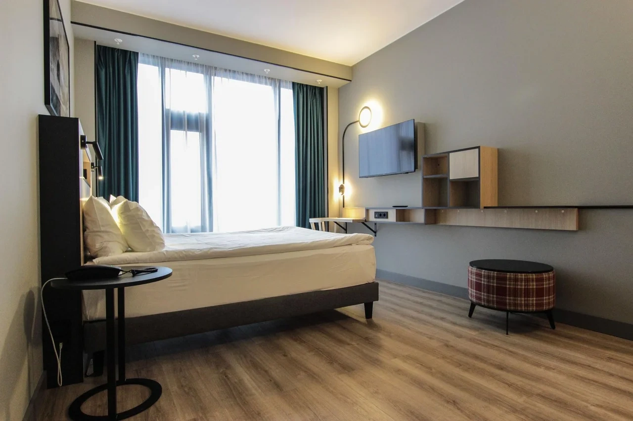 Просторный номер площадью 30 кв.м. с одной двуспальной кроватью. Стильный интерьер и функциональная мини-кухня обеспечивает максимальный комфорт пребывания. Каждый номер оснащен мини-кухней с холодильником, варочной поверхностью и набором посуды, рабочей зоной, беспроводным интернетом и ЖК-телевизором. Ванная комната с душевой кабиной, набором необходимых принадлежностей, включая фен.