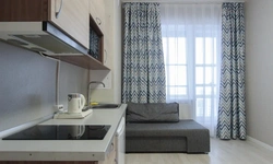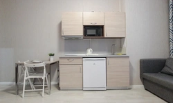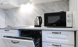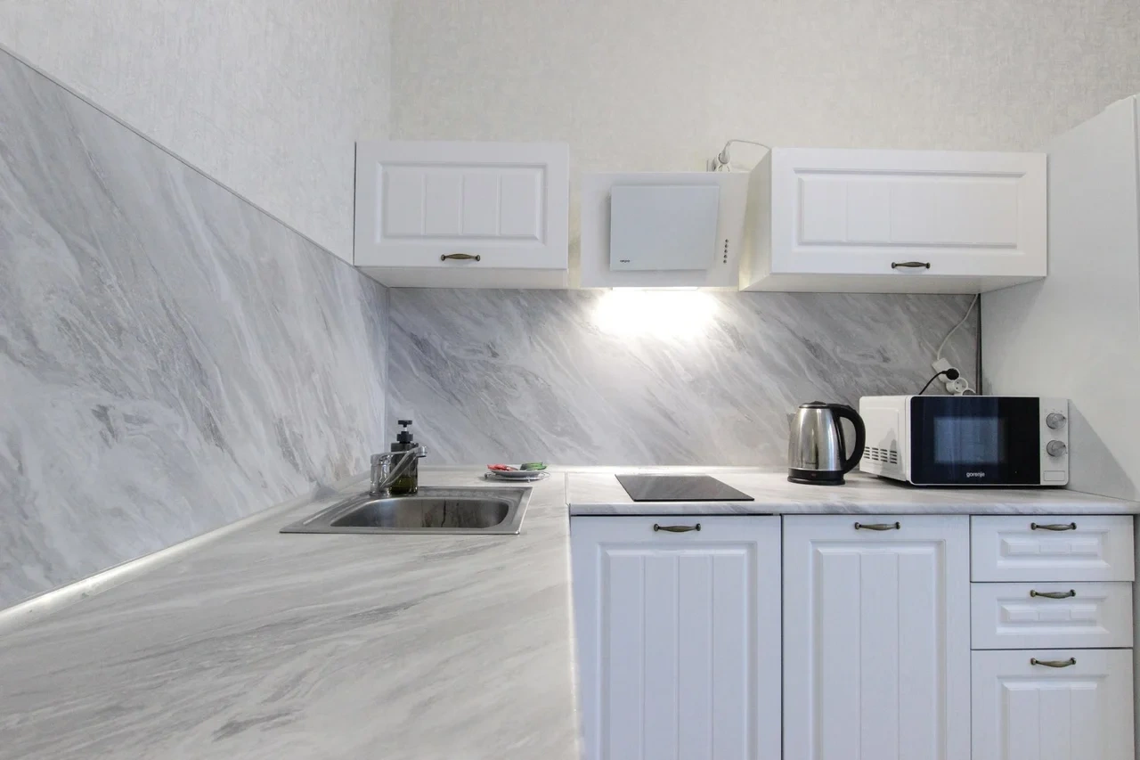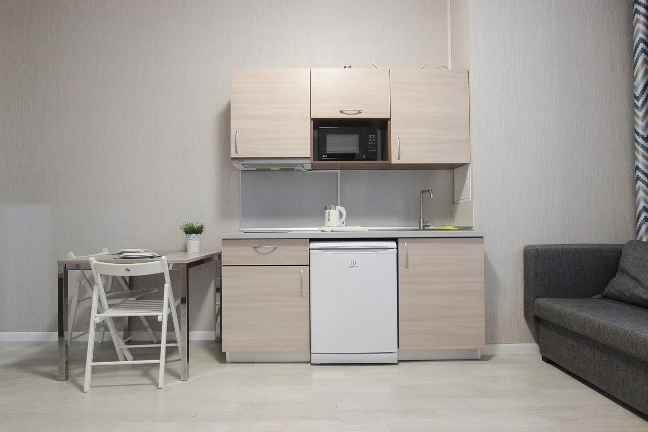 - Кухонный гарнитур с варочной поверхностью, холодильником, микроволновкой, чайником, набором посуды для готовки и сервировки.