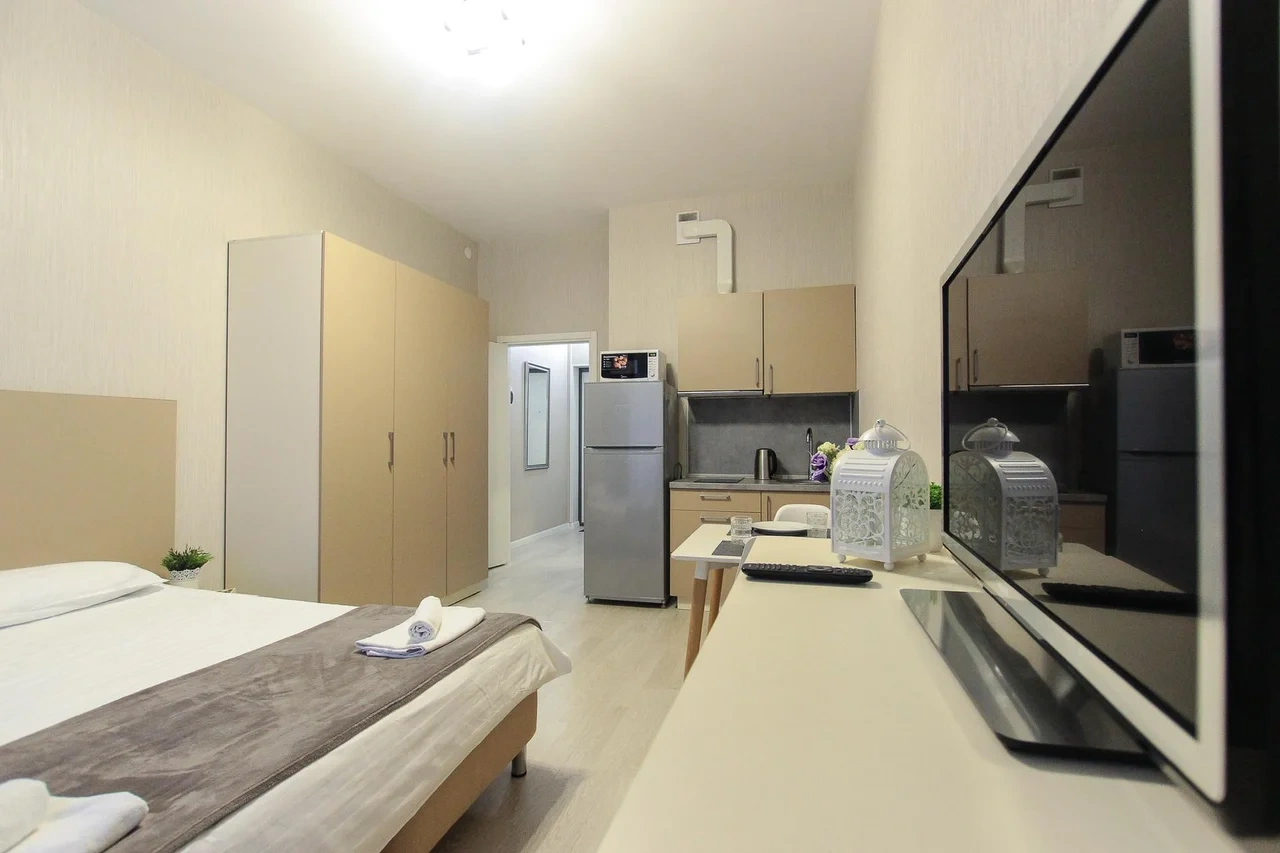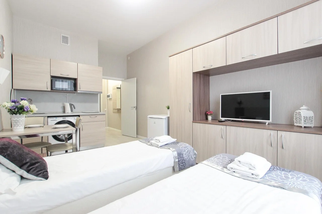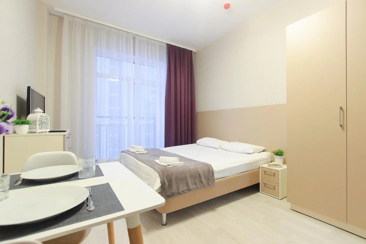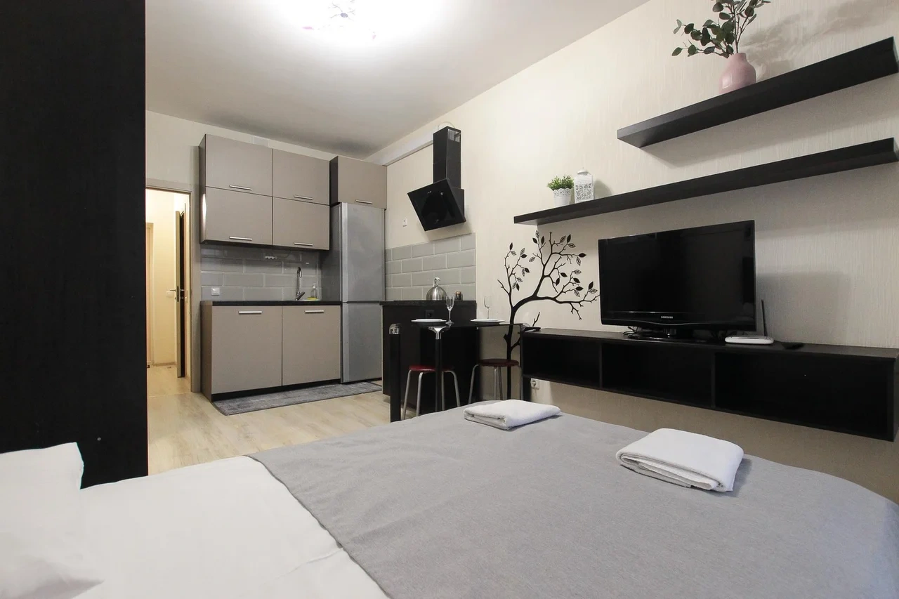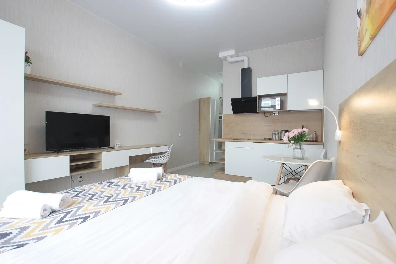 предлагает комфортабельную, современную студию - уютное место для Вашего отдыха . В квартире есть все необходимое для комфортного проживания: — кровать с ортопедическим матрасом; — постельное белье и полотенца; — гигиенические принадлежности, косметические средства и тапочки; — холодильник, электрическая плита, электрочайник, микроволновая печь; — водонагреватель; — телевизор; — кондиционер; — стиральная машина; — утюг с гладильной доской, фен, сушилка для белья; — электроплита; — посуда, моющие средства; — чай, кофе, сахар; — скоростной Wi-Fi. Финишная уборка включена в стоимость (при длительном проживании обязательна еженедельная уборка с заменой белья). Будем ждать вас в гости! Вам понравится.