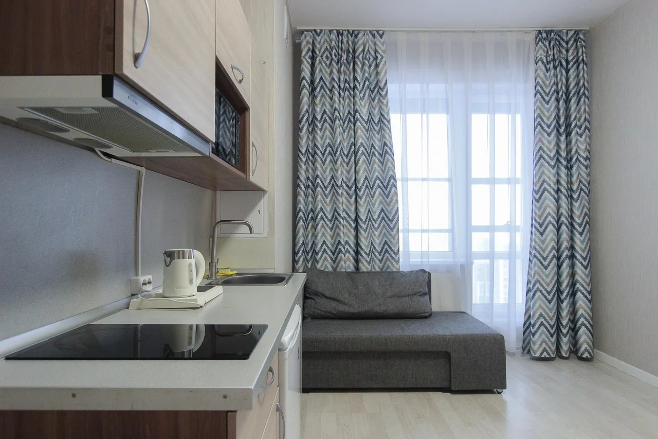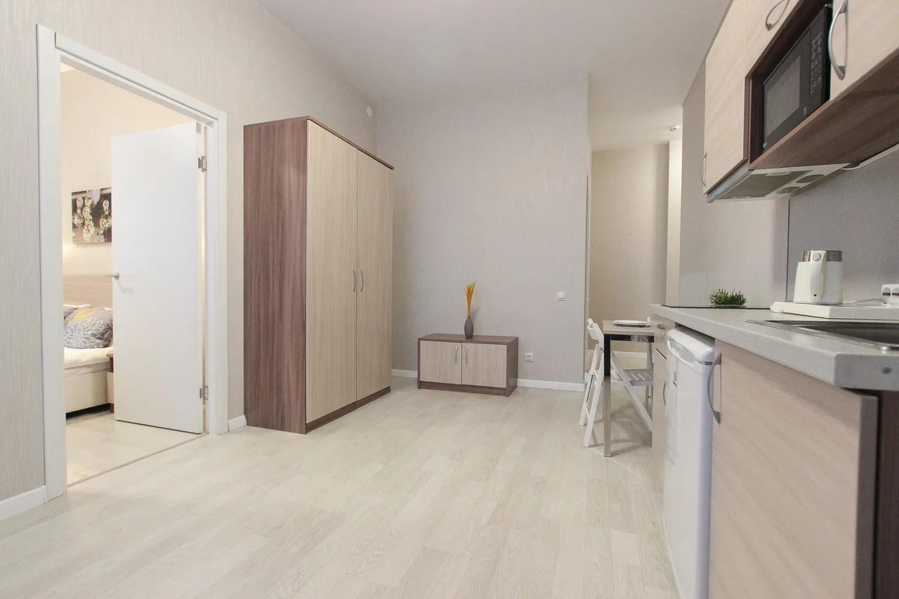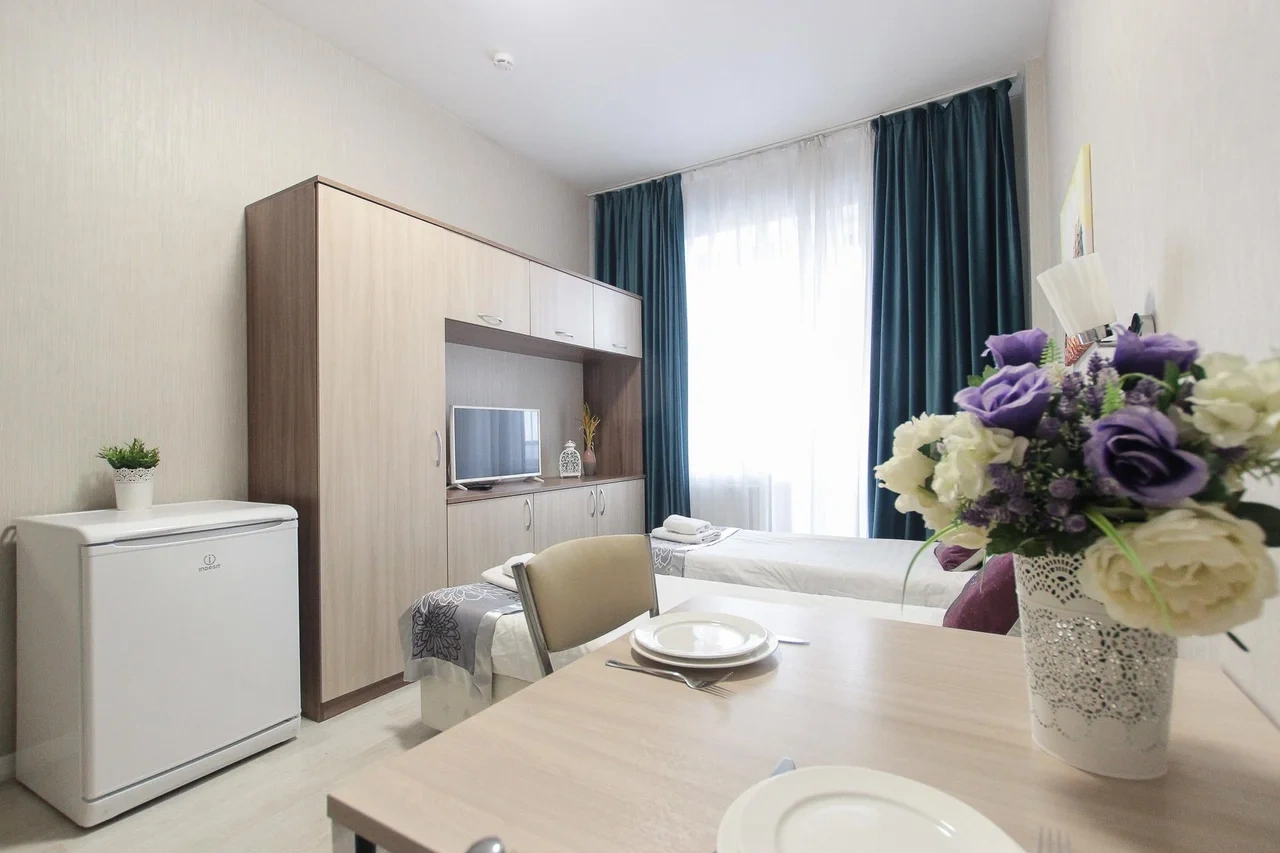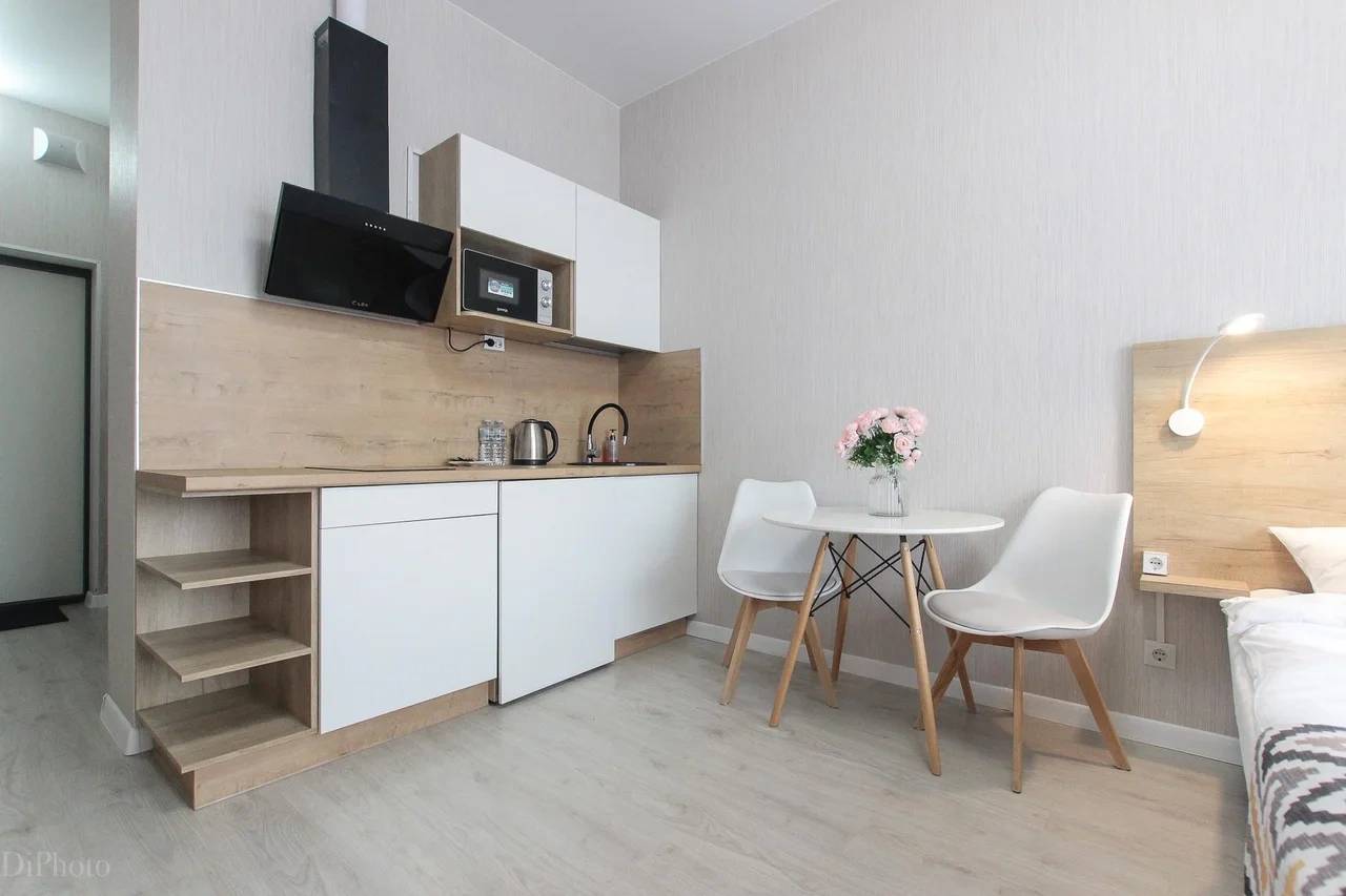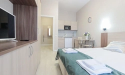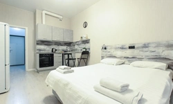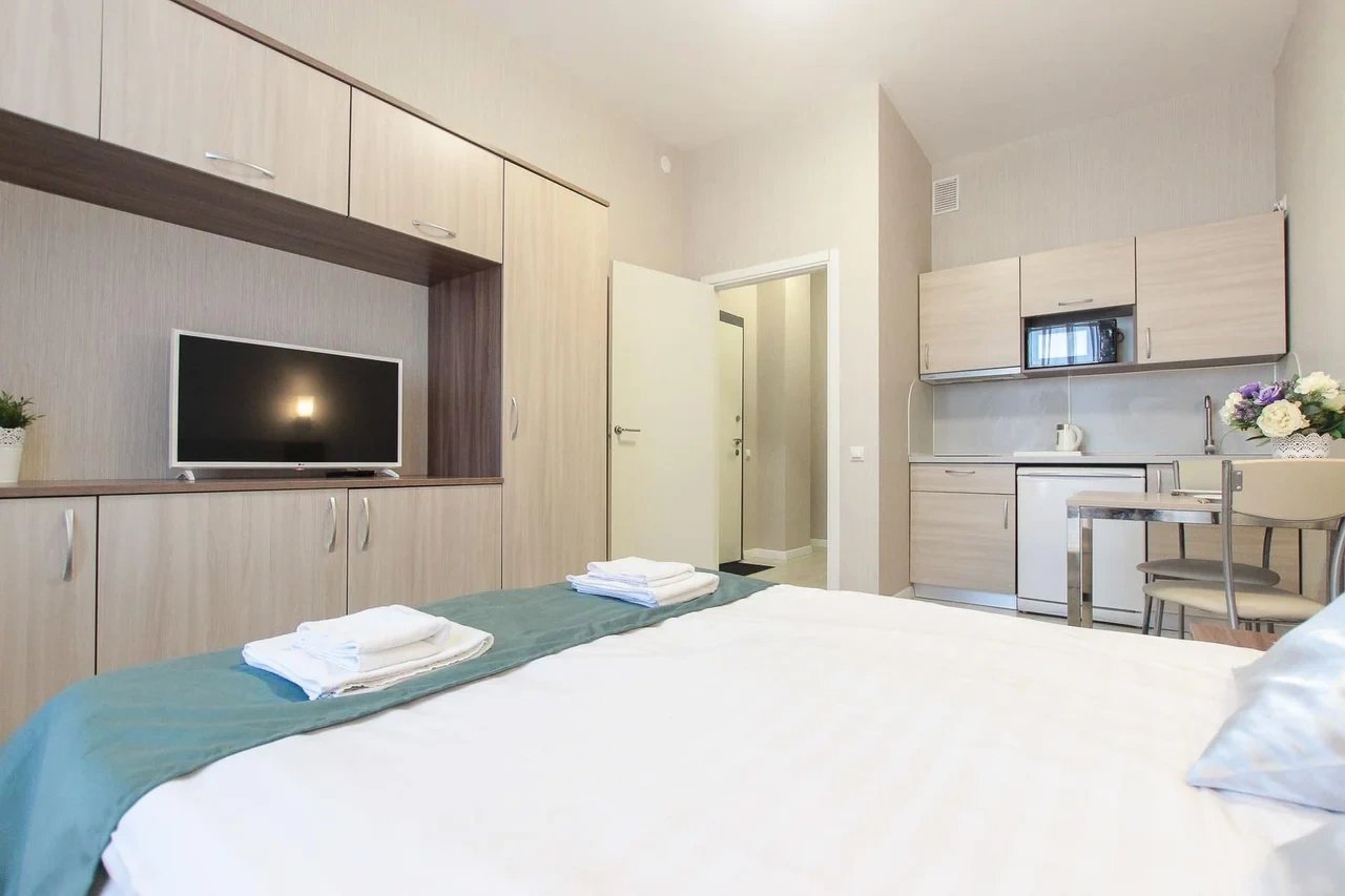 предлагает комфортабельную, современную студию - уютное место для Вашего отдыха . В квартире есть все необходимое для комфортного проживания: — кровать с ортопедическим матрасом; — постельное белье и полотенца; — гигиенические принадлежности, косметические средства и тапочки; — холодильник, электрическая плита, электрочайник, микроволновая печь; — водонагреватель; — телевизор; — кондиционер; — стиральная машина; — утюг с гладильной доской, фен, сушилка для белья; — электроплита; — посуда, моющие средства; — чай, кофе, сахар; — скоростной Wi-Fi. Финишная уборка включена в стоимость (при длительном проживании обязательна еженедельная уборка с заменой белья). Будем ждать вас в гости! Вам понравится.