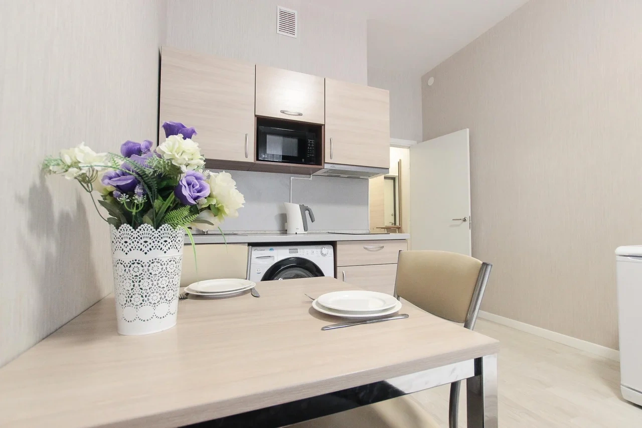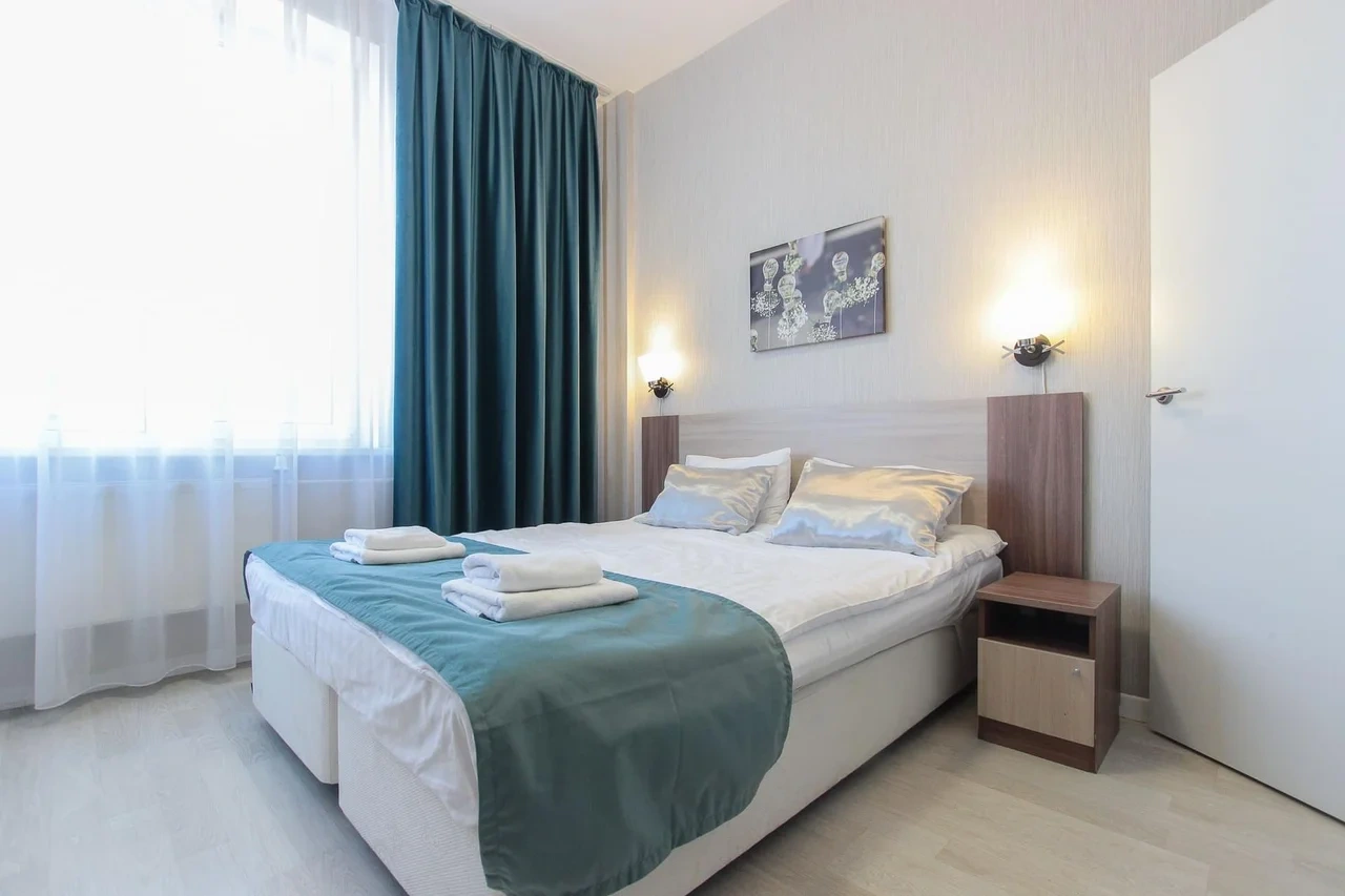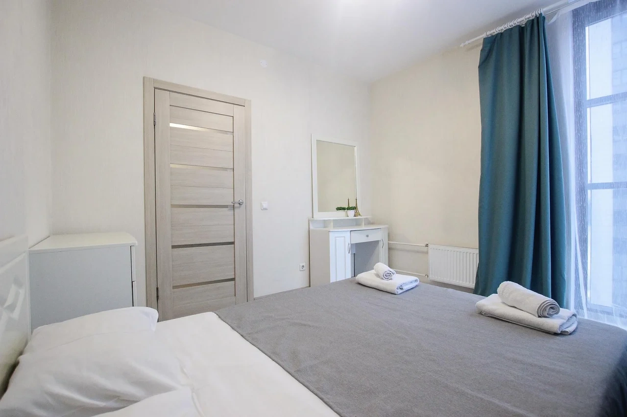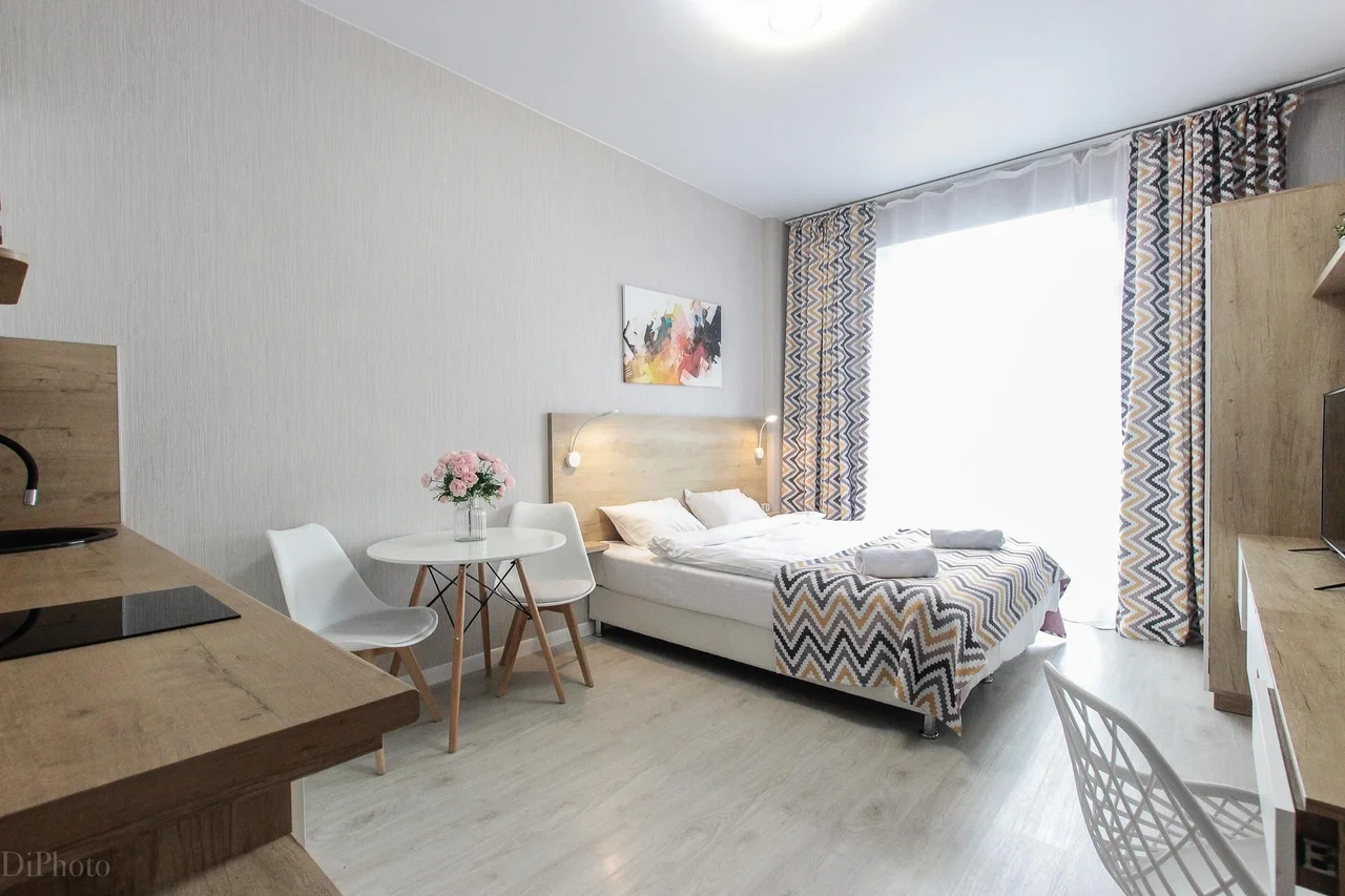 ОБ АПАРТАМЕНТЕ: - Двуспальная кровать 160*200 - Свежее и приятное постельное белье - Шторы blackout для крепкого сна в дневное время и в период белых ночей. - Безлимитный WI-FI. - Телевизор. - Стиральная машинка. - Сушилка. - Утюг с доской. - Фен. - Кухонный гарнитур с варочной поверхностью, холодильником, микроволновкой, чайником, набором посуды для готовки и сервировки. - Удобная обеденная зона. - Чай/кофе, сахар. - Комплект свежих полотенец, одноразовые тапочки, зубные наборы, гигиенические принадлежности.