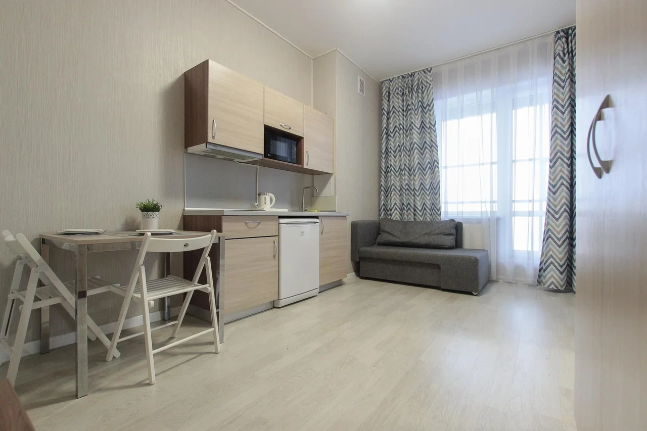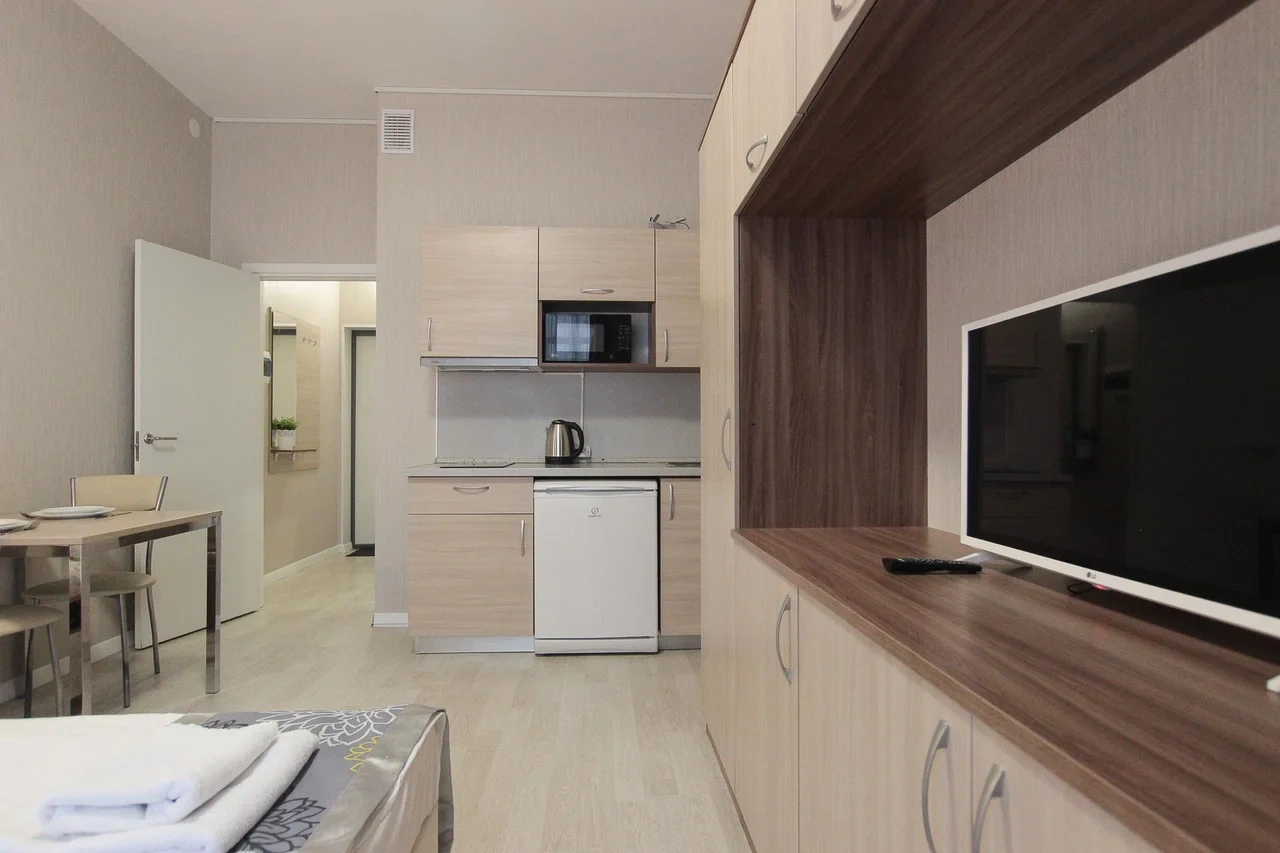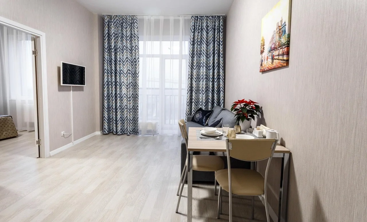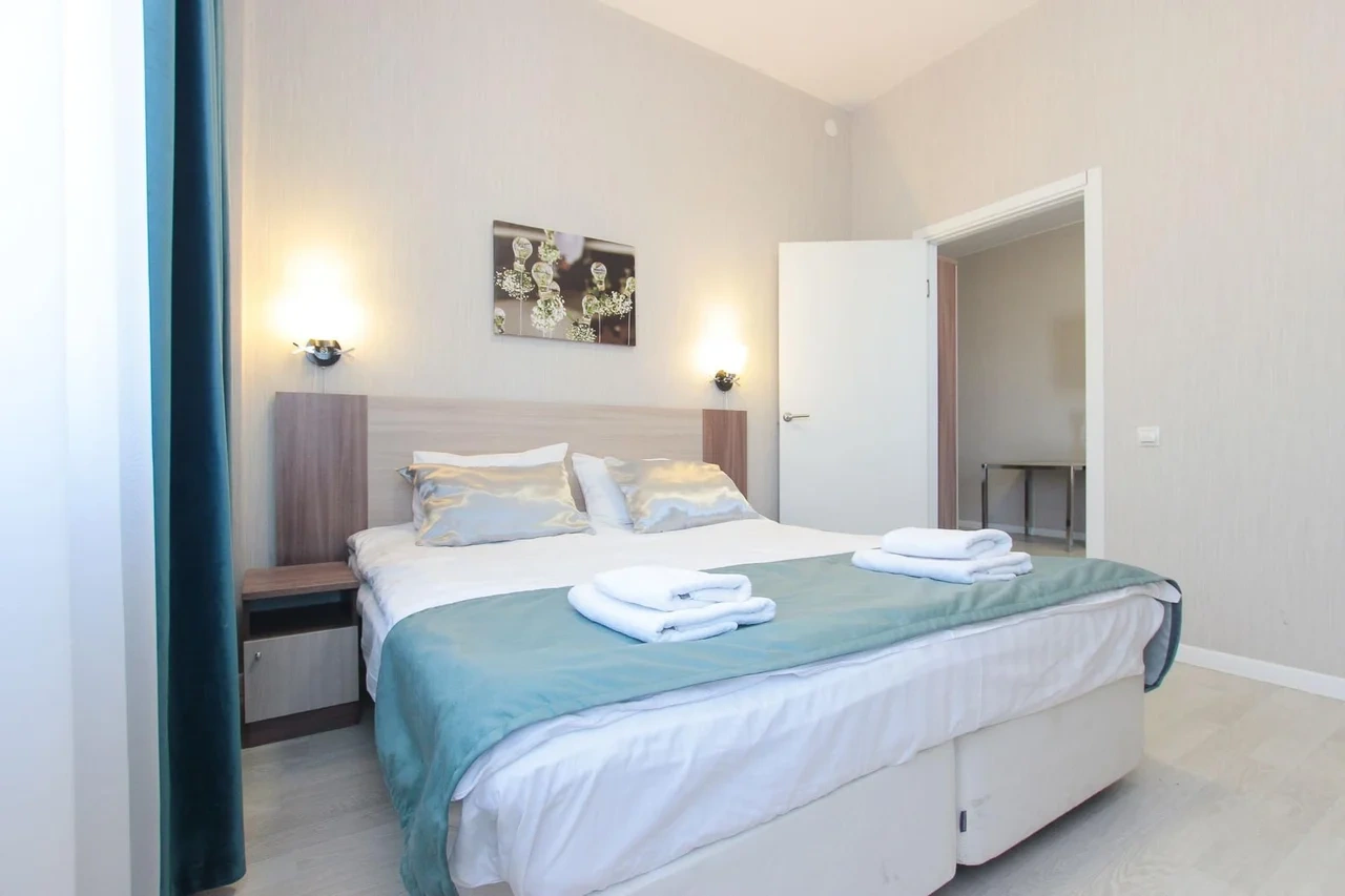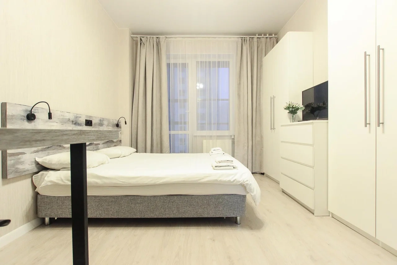 ОБ АПАРТАМЕНТЕ: - Двуспальная кровать 160*200 - Свежее и приятное постельное белье - Шторы blackout для крепкого сна в дневное время и в период белых ночей. - Безлимитный WI-FI. - Телевизор. - Стиральная машинка. - Сушилка. - Утюг с доской. - Фен. - Кухонный гарнитур с варочной поверхностью, холодильником, микроволновкой, чайником, набором посуды для готовки и сервировки. - Удобная обеденная зона. - Чай/кофе, сахар. - Комплект свежих полотенец, одноразовые тапочки, зубные наборы, гигиенические принадлежности.