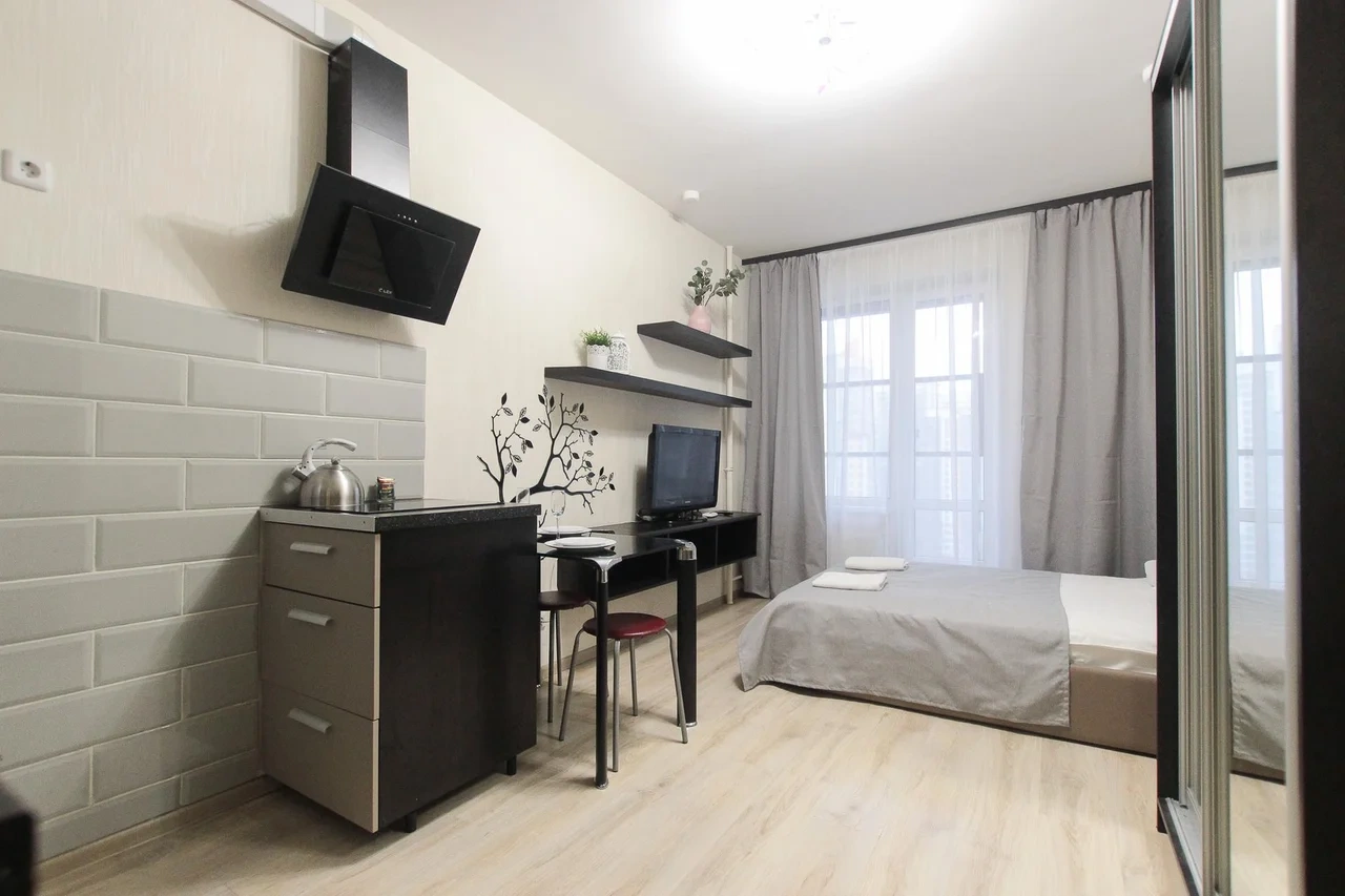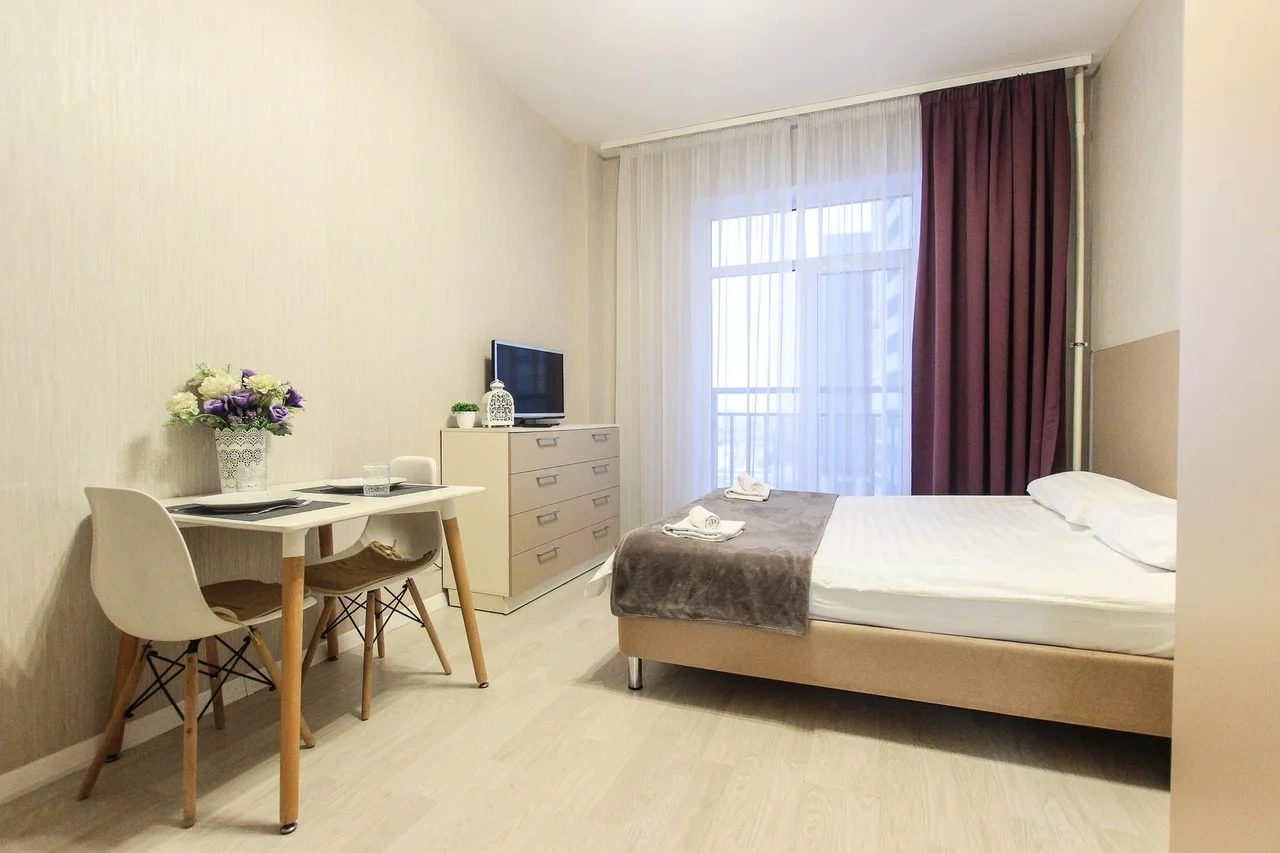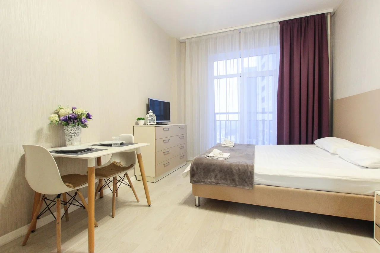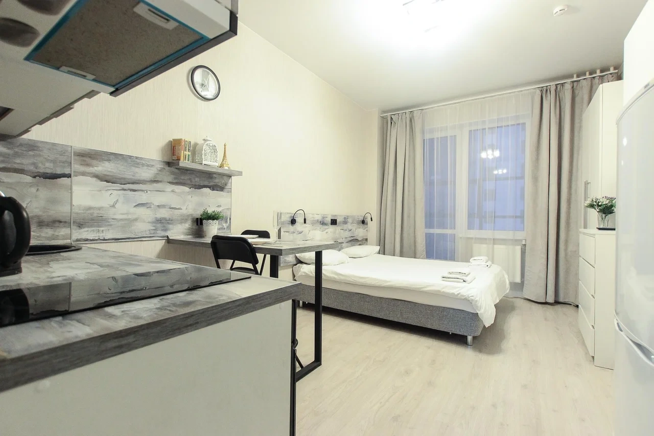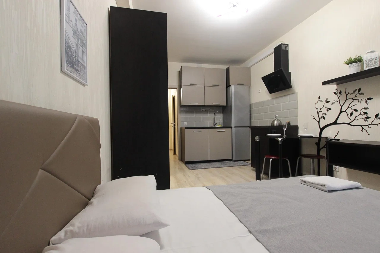 предлагает комфортабельную, современную студию - уютное место для Вашего отдыха . В квартире есть все необходимое для комфортного проживания: — кровать с ортопедическим матрасом; — постельное белье и полотенца; — гигиенические принадлежности, косметические средства и тапочки; — холодильник, электрическая плита, электрочайник, микроволновая печь; — водонагреватель; — телевизор; — кондиционер; — стиральная машина; — утюг с гладильной доской, фен, сушилка для белья; — электроплита; — посуда, моющие средства; — чай, кофе, сахар; — скоростной Wi-Fi. Комплекс с развитой и комфортной инфраструктурой: имеется все необходимое для комфортного и безопасного проживания. Круглосуточные магазины, пешеходные зоны для отдыха и прогулок (оборудованные фонарями и скамейками), аптеки, кафе, рестораны и кальянные. Рядом с домом есть места для парковки авто, а при необходимости, на нулевом этаже, расположена охраняемая подземная платная парковка. Финишная уборка включена в стоимость (при длительном проживании обязательна еженедельная уборка с заменой белья). Будем ждать вас в гости! Вам понравится.