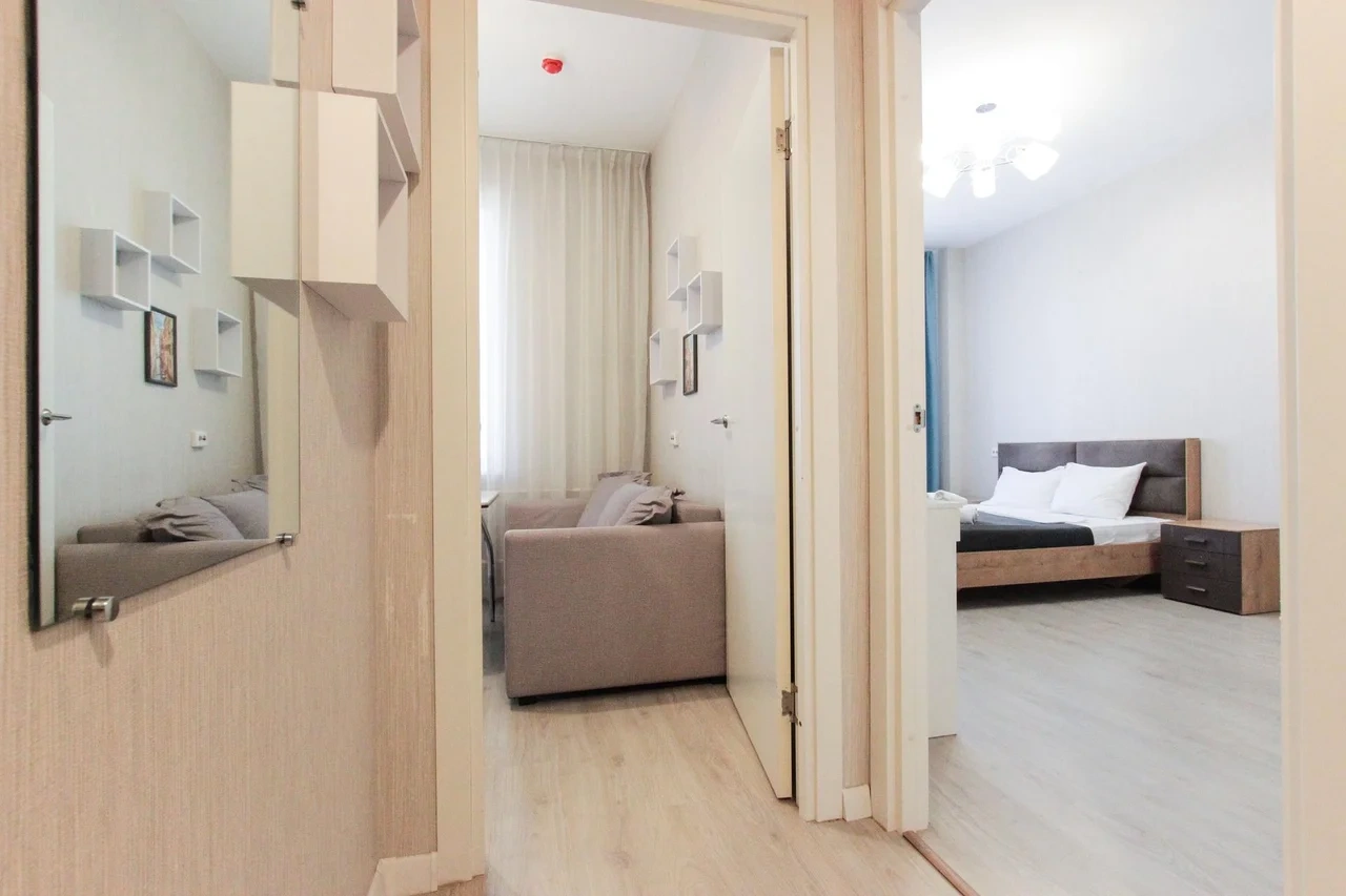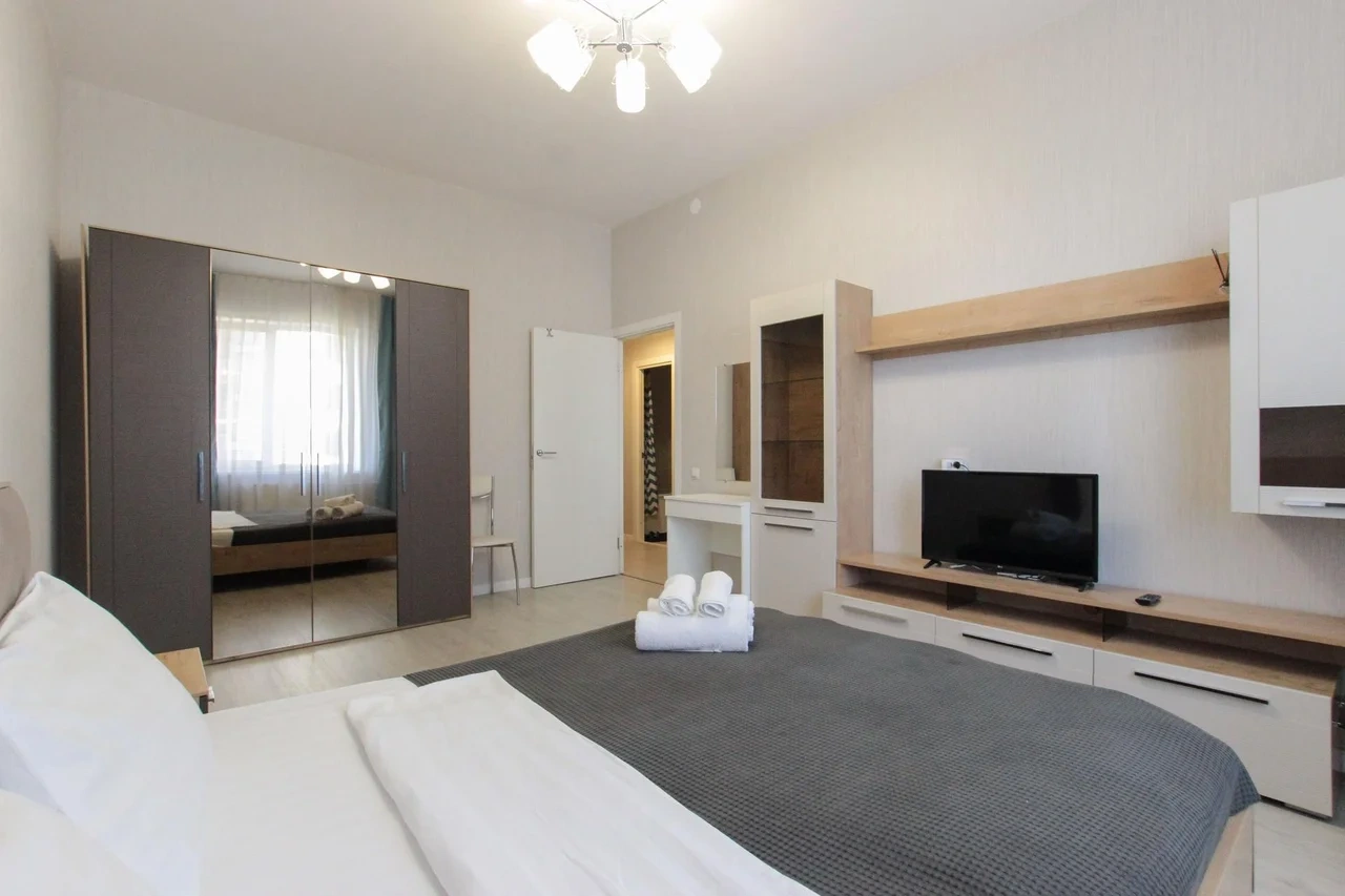 предлагает комфортабельный, современный двухкомнатный номер- уютное место для Вашего отдыха . В квартире есть все необходимое для комфортного проживания: — кровать с ортопедическим матрасом; — разборный диван; — постельное белье и полотенца; — гигиенические принадлежности, косметические средства и тапочки; — холодильник, электрическая плита, электрочайник, микроволновая печь; — водонагреватель; — телевизор; — кондиционер; — стиральная машина; — утюг с гладильной доской, фен, сушилка для белья; — электроплита; — посуда, моющие средства; — чай, кофе, сахар; — скоростной Wi-Fi. Комплекс с развитой и комфортной инфраструктурой: имеется все необходимое для комфортного и безопасного проживания. Круглосуточные магазины, пешеходные зоны для отдыха и прогулок (оборудованные фонарями и скамейками), аптеки, кафе, рестораны и кальянные. Рядом с домом есть места для парковки авто, а при необходимости, на нулевом этаже, расположена охраняемая подземная платная парковка. Финишная уборка включена в стоимость (при длительном проживании обязательна еженедельная уборка с заменой белья). Будем ждать вас в гости! Вам понравится.