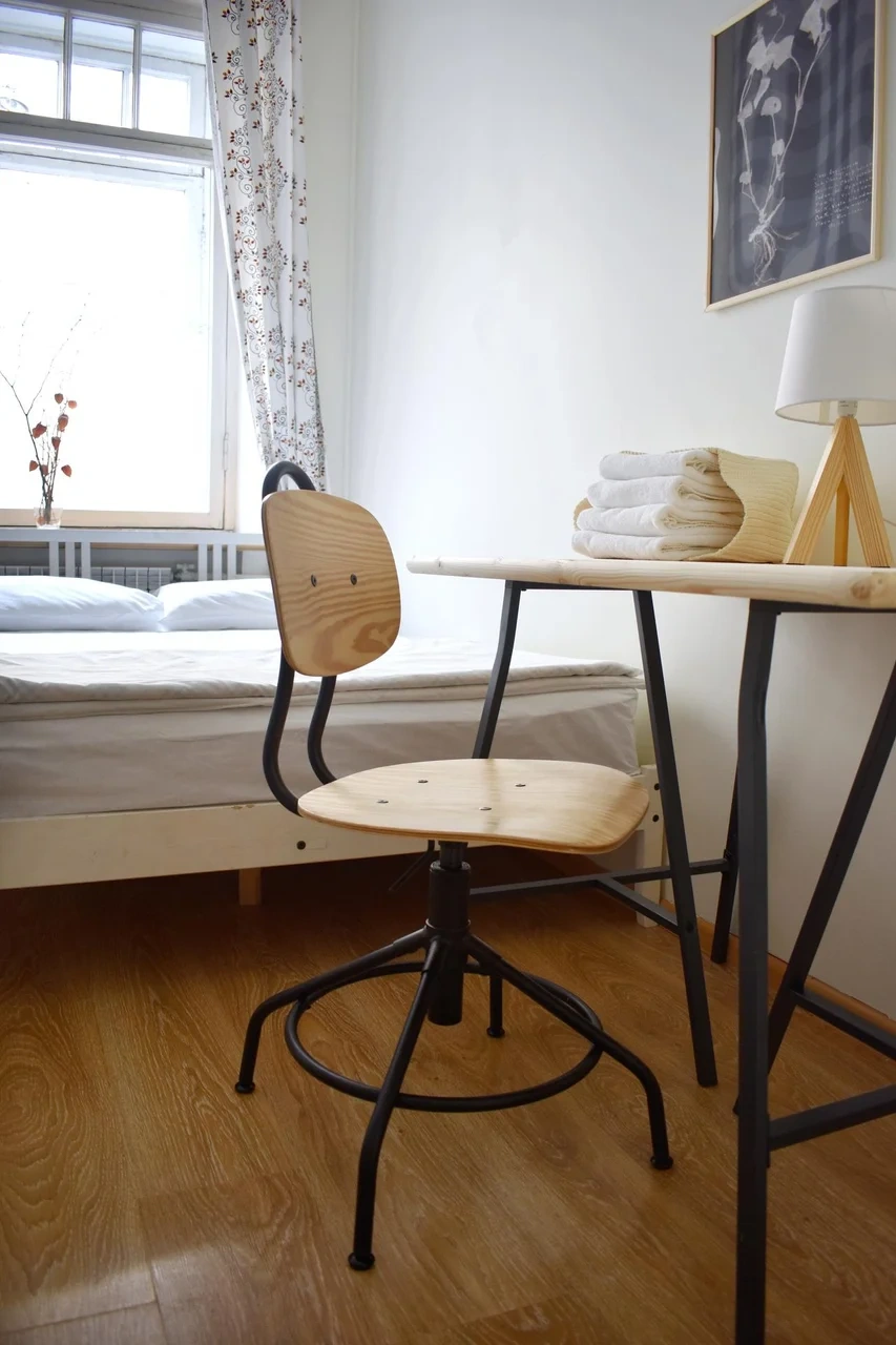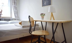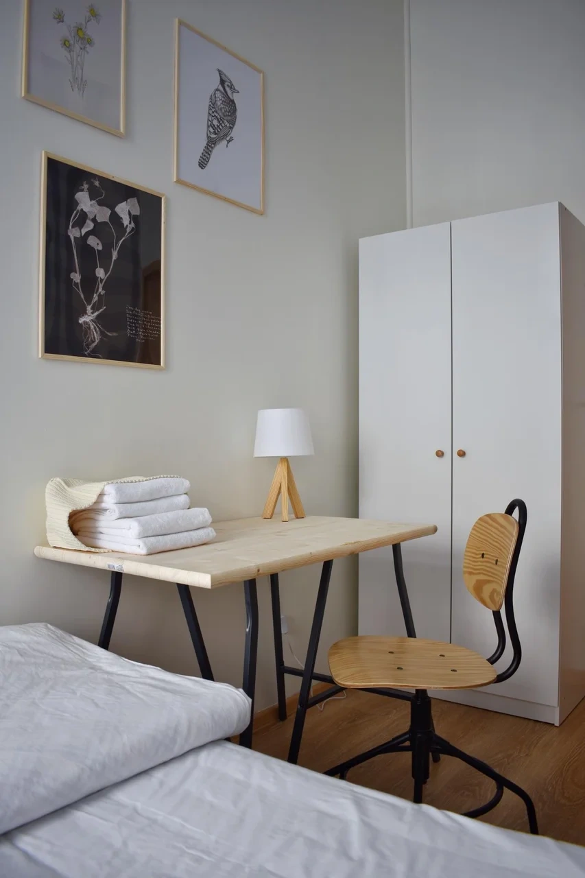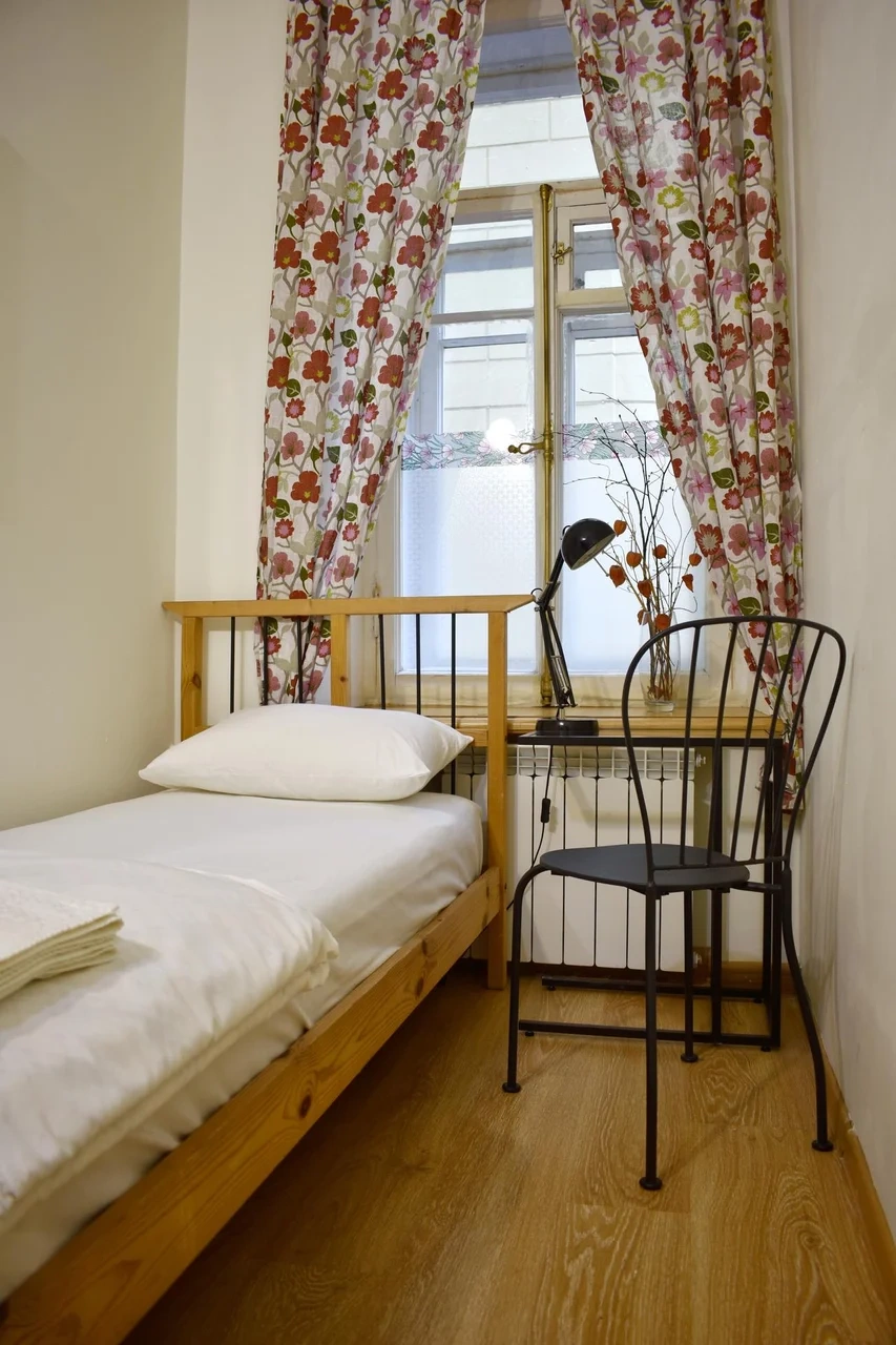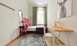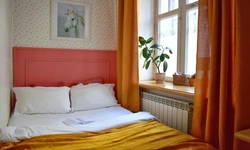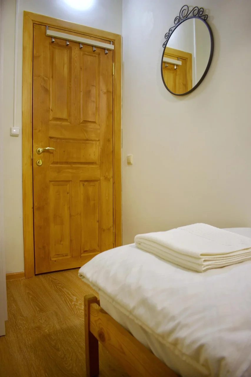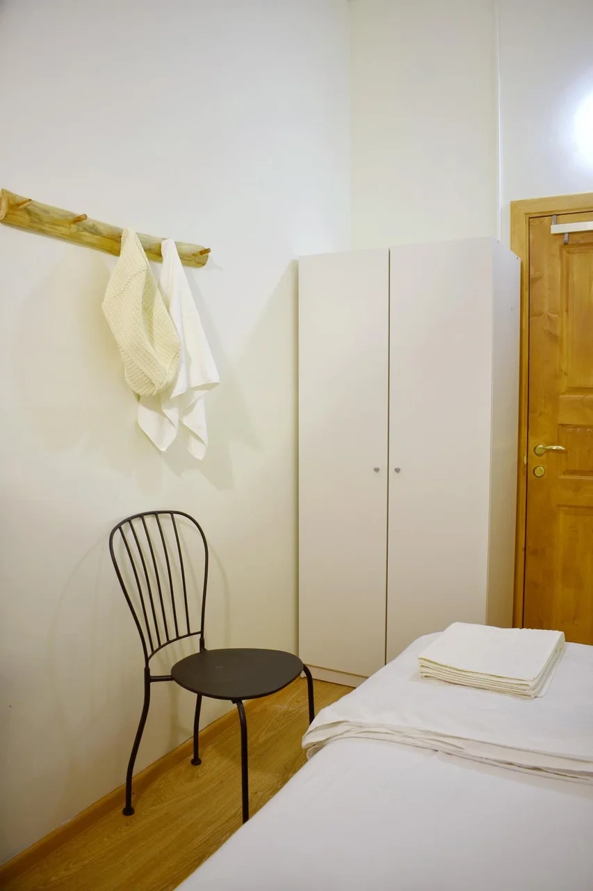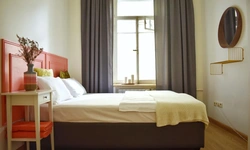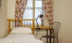 Уютный номер отличается воздушным дизайном и функциональностью. В номере есть двуспальная кровать, стол, стул, кровать. Номер оборудован зеркалом и вешалкой с плечиками для одежды. Освещение включает: основной свет и настольную лампу. Гостям предоставляется бесплатный WI-FI, тапочки, постельное белье и полотенца. Душ и туалет в общем доступе. Огромное окно делает номер очень воздушным и светлым.