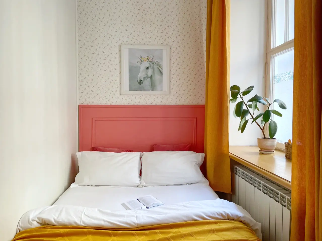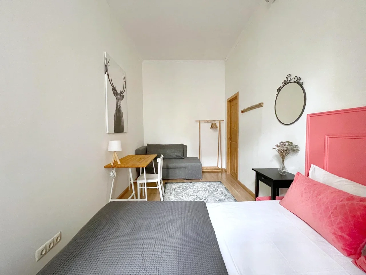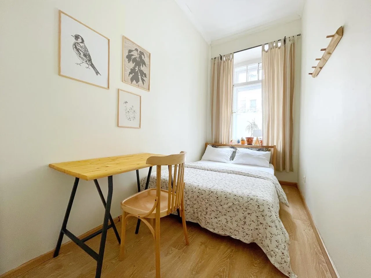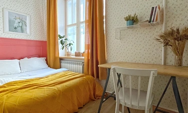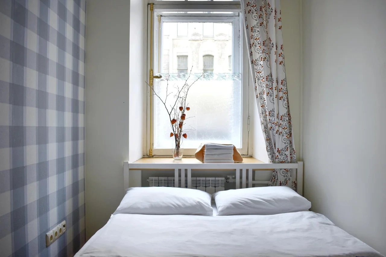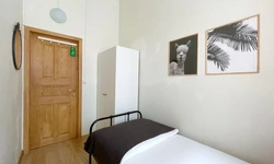 Уютный номер отличается воздушным дизайном и функциональностью. В номере есть двуспальная кровать, стол, стул, кровать. Номер оборудован зеркалом и вешалкой с плечиками для одежды. Освещение включает: основной свет и настольную лампу. Гостям предоставляется бесплатный WI-FI, тапочки, постельное белье и полотенца. Душ и туалет в общем доступе. Огромное окно делает номер очень воздушным и светлым.