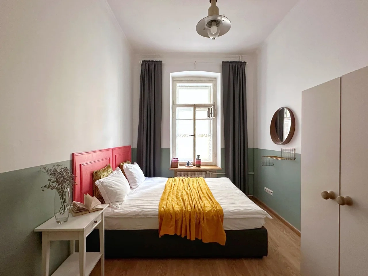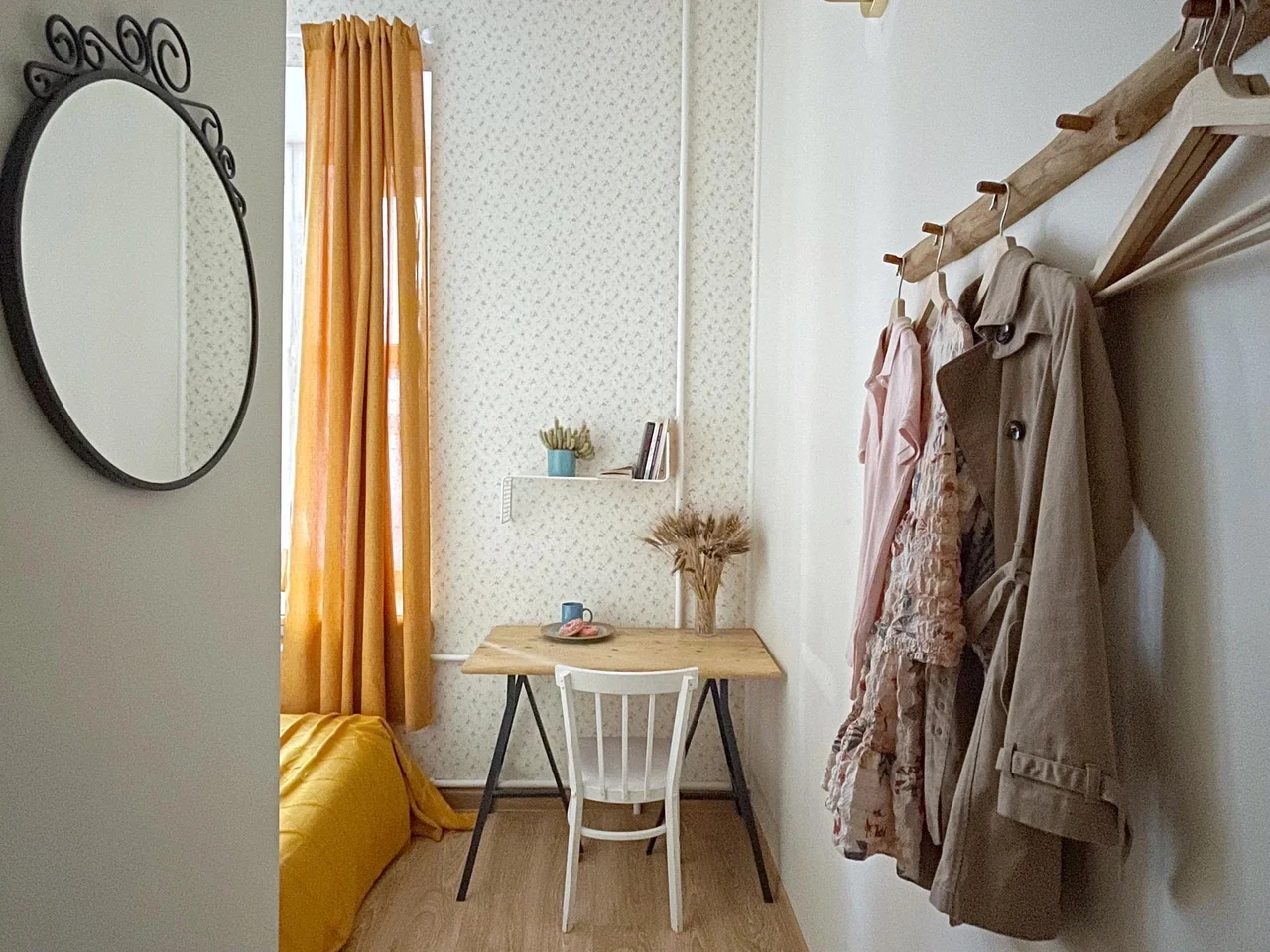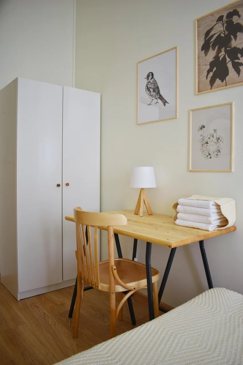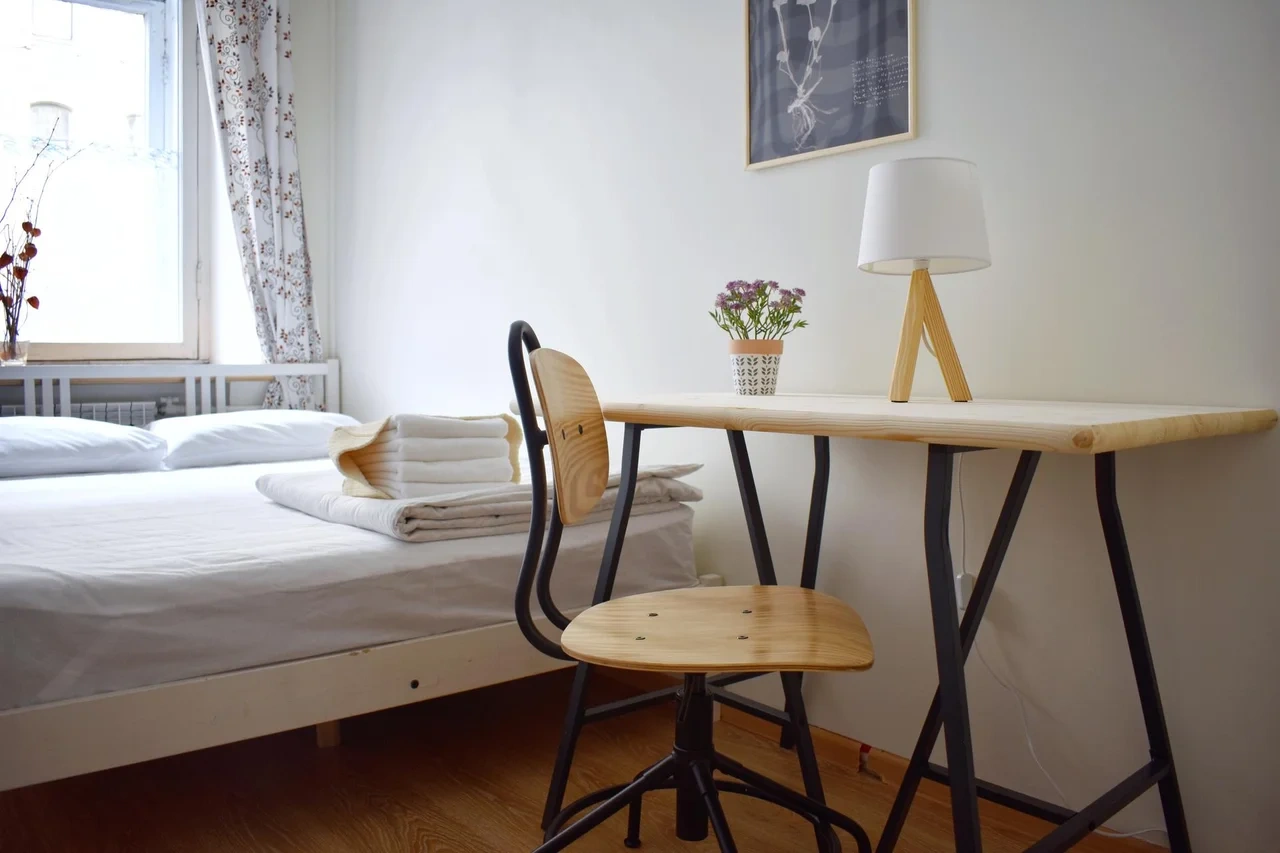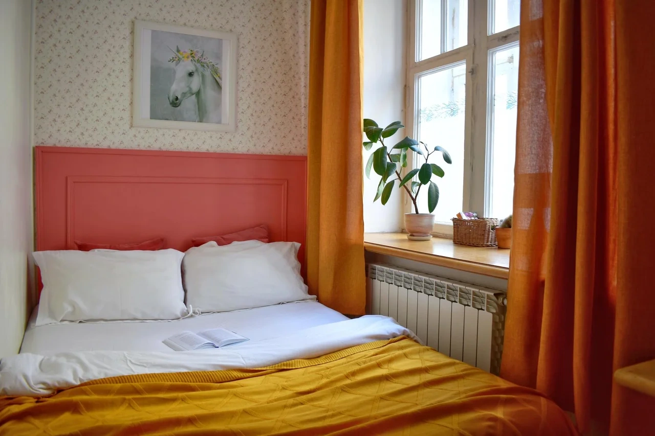 Уютный номер отличается воздушным дизайном и функциональностью. В номере есть двуспальная кровать, стол, стул, кровать. Номер оборудован зеркалом и вешалкой с плечиками для одежды. Освещение включает: основной свет и настольную лампу. Гостям предоставляется бесплатный WI-FI, тапочки, постельное белье и полотенца. Душ и туалет в общем доступе. Огромное окно делает номер очень воздушным и светлым.