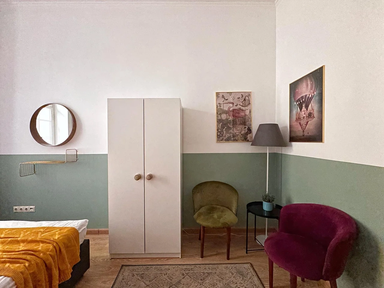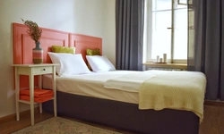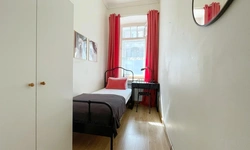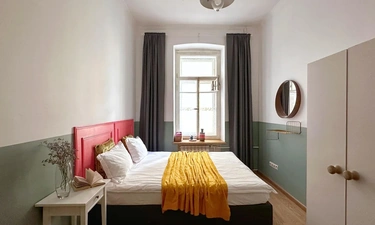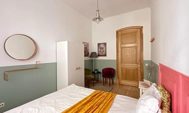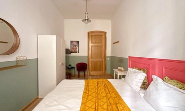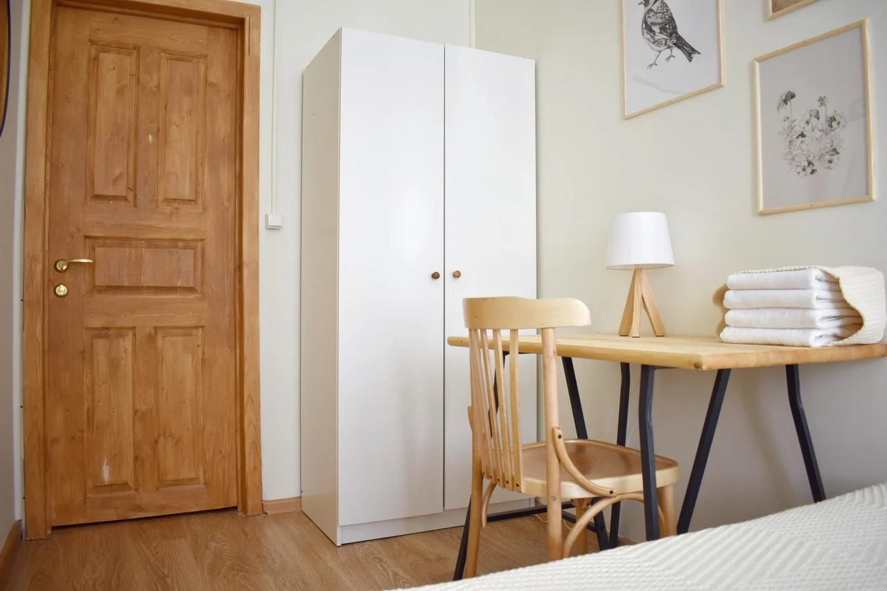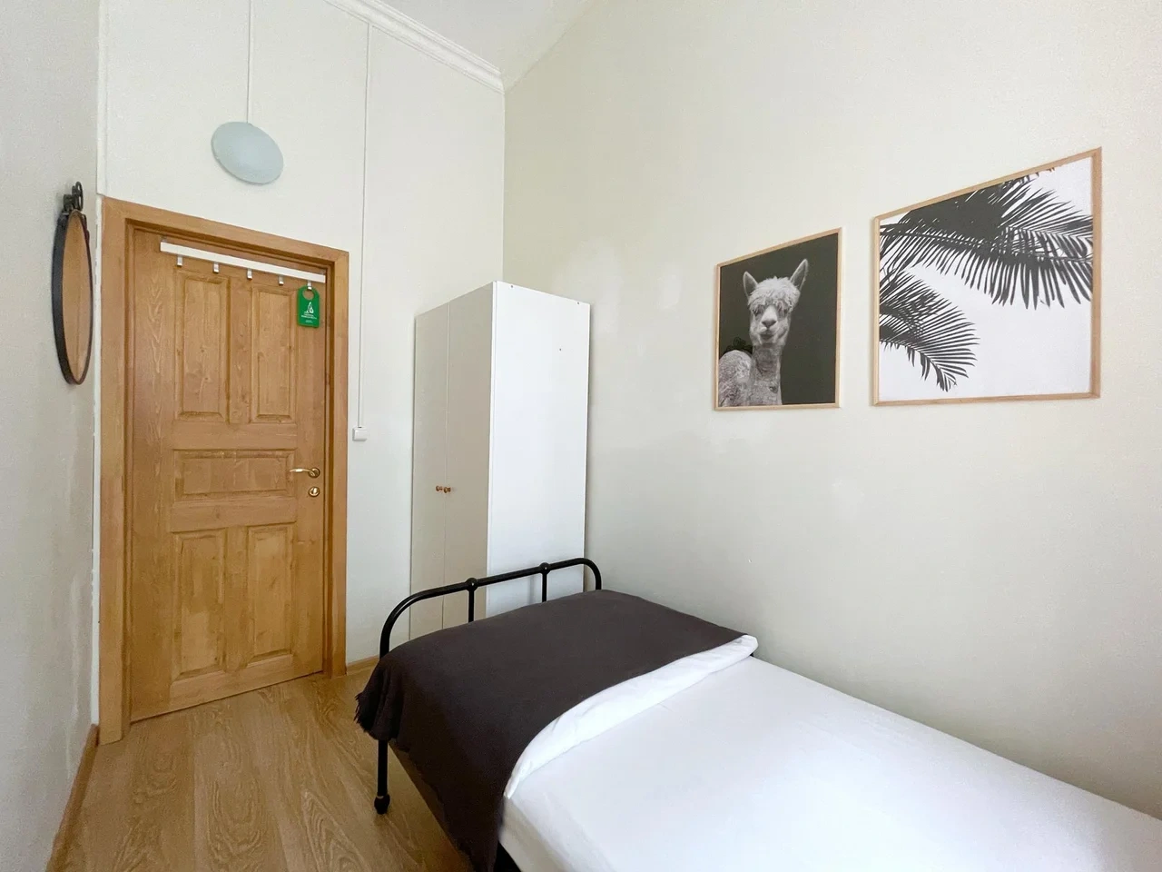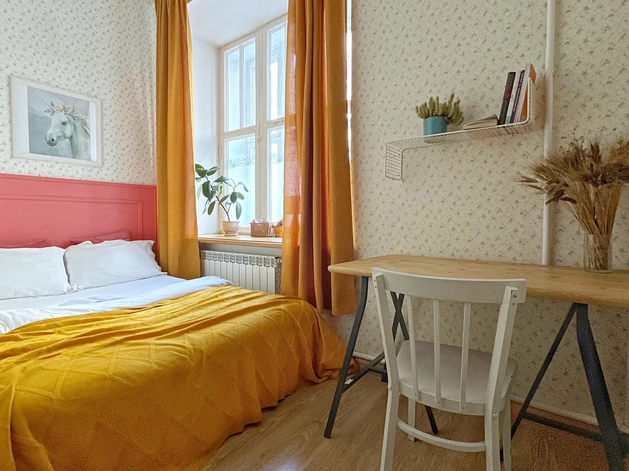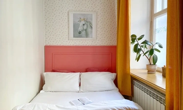 Уютный номер отличается воздушным дизайном и функциональностью. В номере есть двуспальная кровать, стол, стул, кровать. Номер оборудован зеркалом и вешалкой с плечиками для одежды. Освещение включает: основной свет и настольную лампу. Гостям предоставляется бесплатный WI-FI, тапочки, постельное белье и полотенца. Душ и туалет в общем доступе. Огромное окно делает номер очень воздушным и светлым.