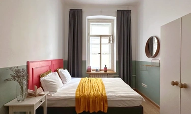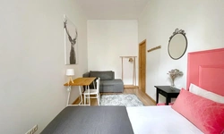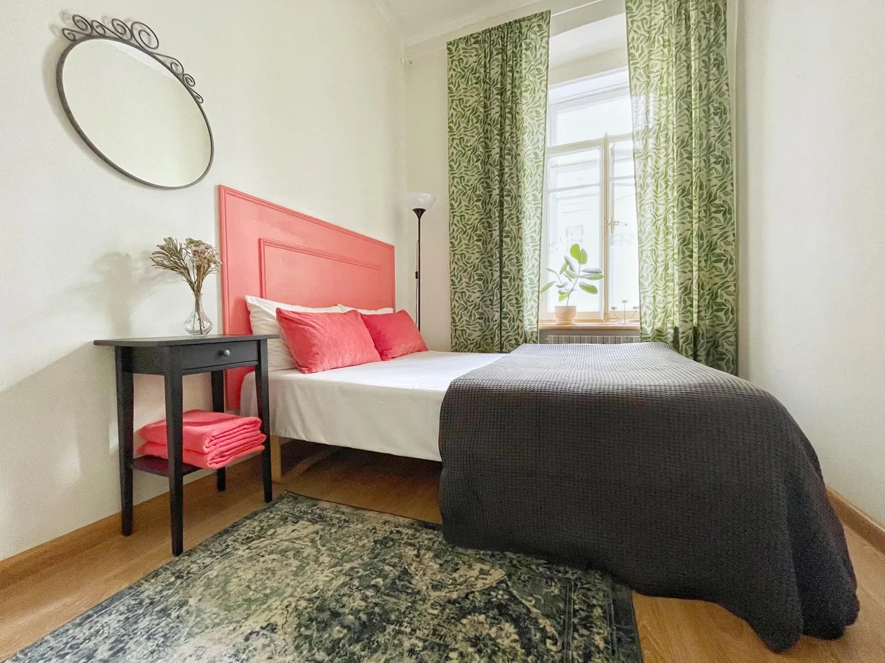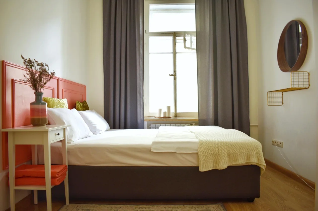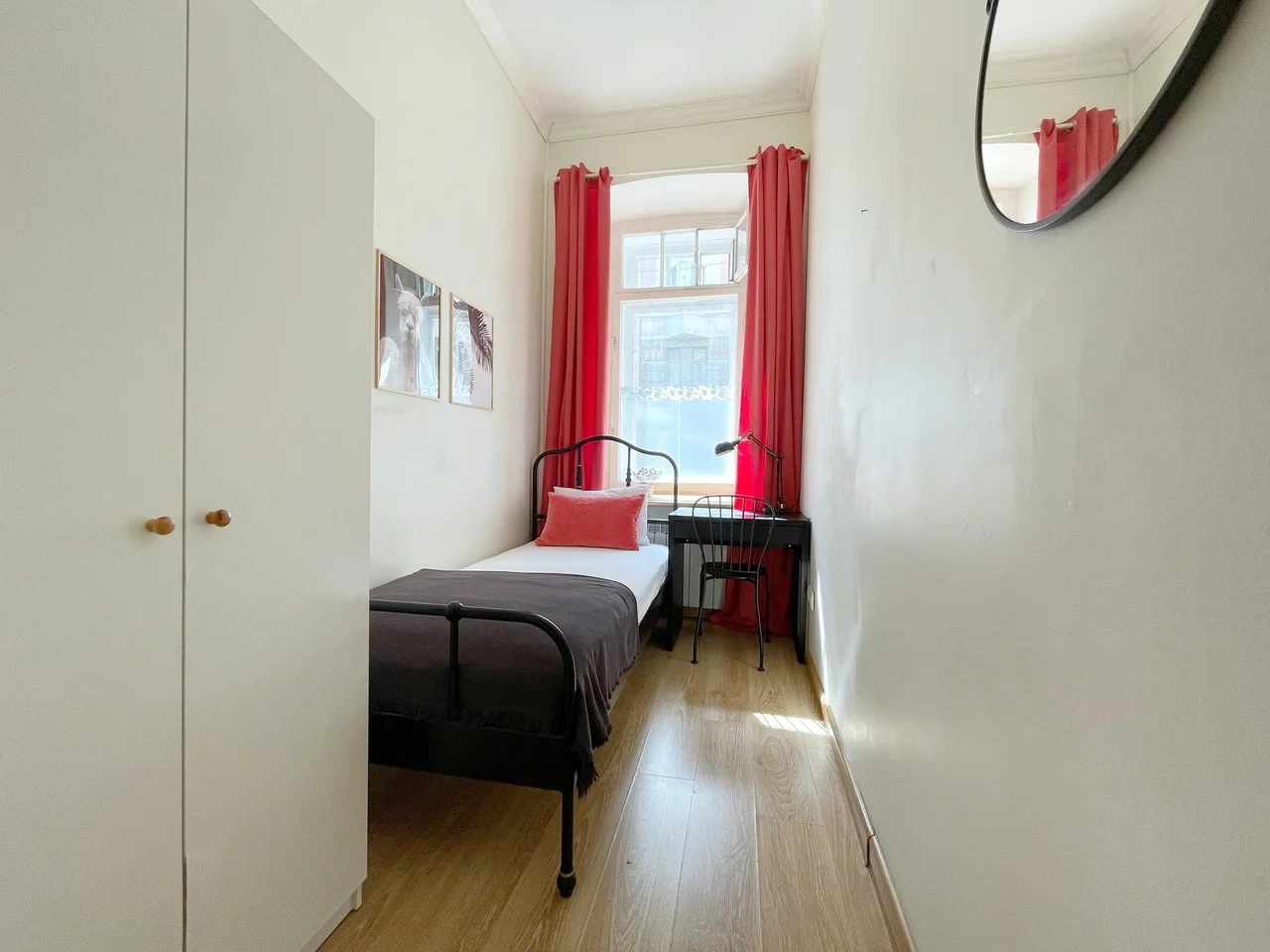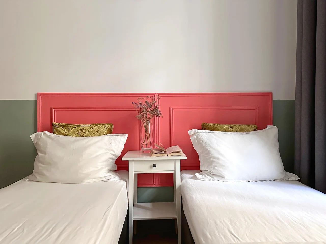 Уютный номер отличается воздушным дизайном и функциональностью. В номере есть двуспальная кровать, стол, стул, кровать. Номер оборудован зеркалом и вешалкой с плечиками для одежды. Освещение включает: основной свет и настольную лампу. Гостям предоставляется бесплатный WI-FI, тапочки, постельное белье и полотенца. Душ и туалет в общем доступе. Огромное окно делает номер очень воздушным и светлым.