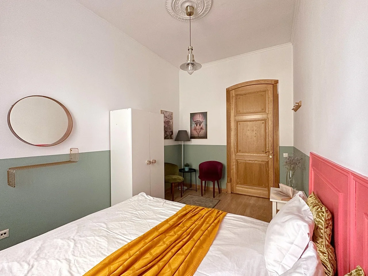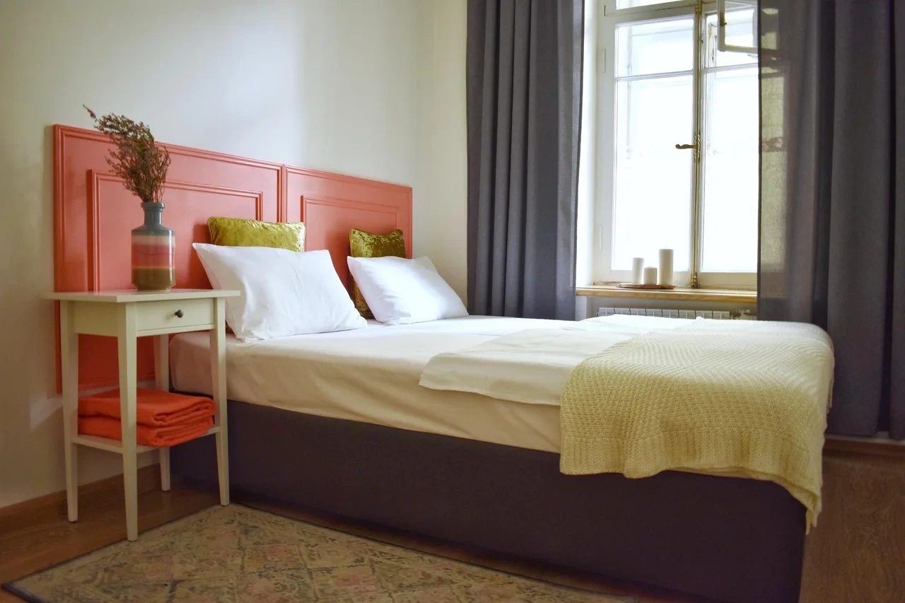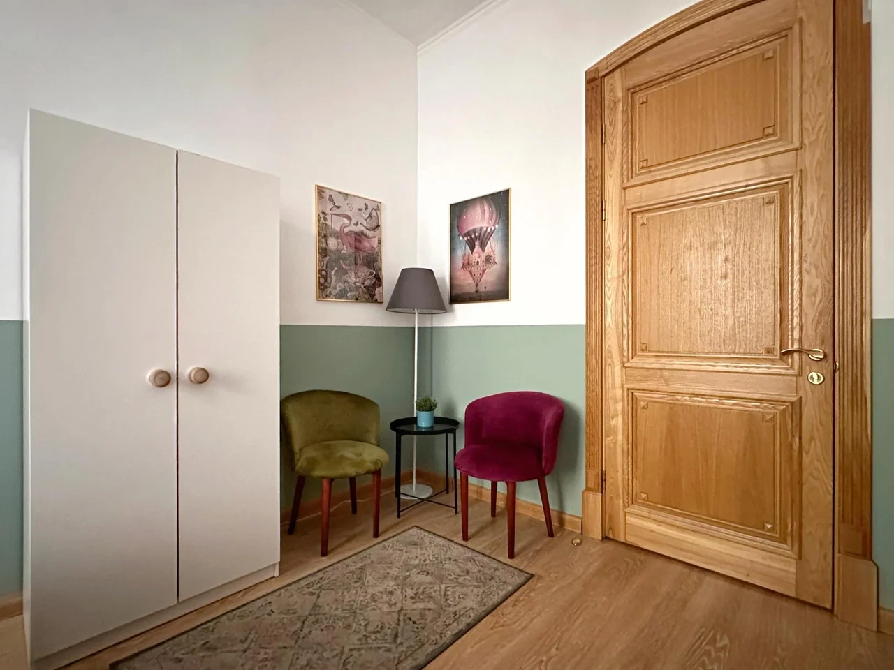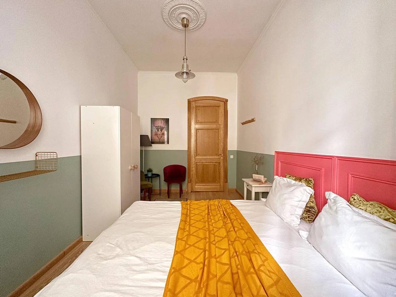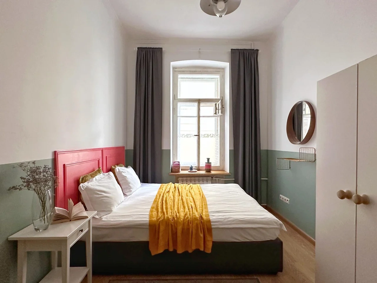 Уютный номер отличается воздушным дизайном и функциональностью. В номере есть двуспальная кровать, стол, стул, кровать. Номер оборудован зеркалом и вешалкой с плечиками для одежды. Освещение включает: основной свет и настольную лампу. Гостям предоставляется бесплатный WI-FI, тапочки, постельное белье и полотенца. Душ и туалет в общем доступе. Огромное окно делает номер очень воздушным и светлым.