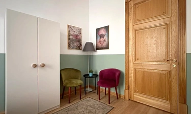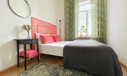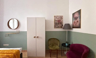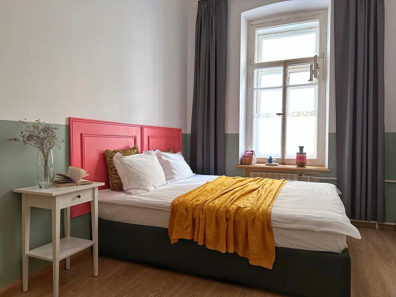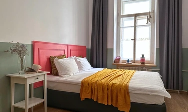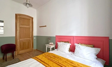 Уютный номер отличается воздушным дизайном и функциональностью. В номере есть двуспальная кровать, диван-кровать,стол, стул, комод. Номер оборудован зеркалом и вешалкой с плечиками для одежды. Освещение включает: основной свет и настольную лампу. Гостям предоставляется бесплатный WI-FI, тапочки, постельное белье и полотенца. Душ и туалет в общем доступе. Отлично подойдет для семьи с детьми.