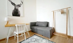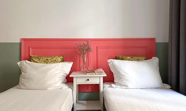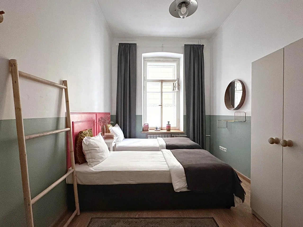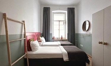 Просторный номер отличается воздушным дизайном и функциональностью. В номере есть 2 слипбокса, которые при желании превращаются в 1 большую кровать king-size. Также имеется кофейная зона, комод, шкаф, зеркало, полочки. Освещение включает: основной свет и торшер. Гостям предоставляется бесплатный WI-FI, постельное белье и полотенца. Душ и туалет в общем доступе.