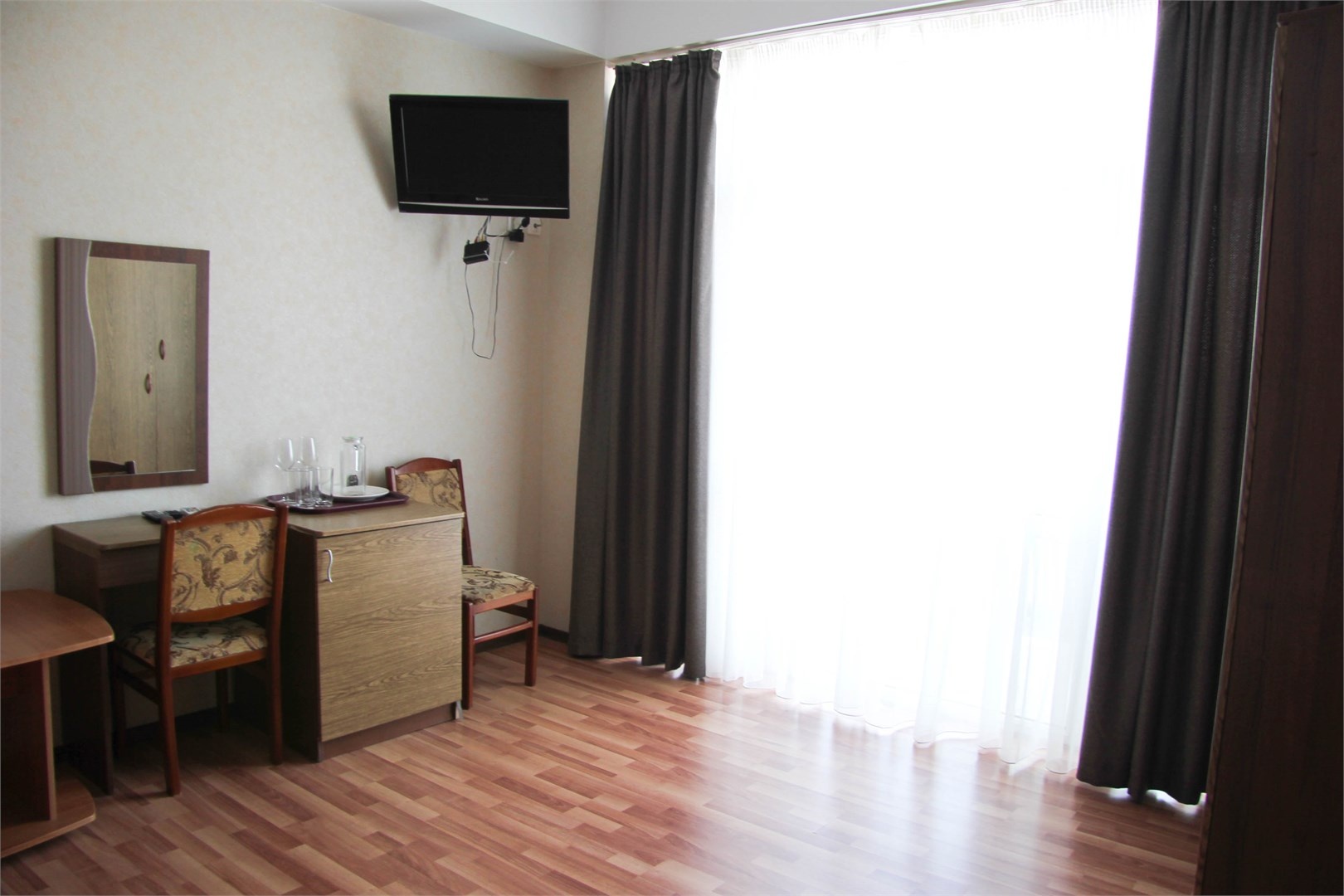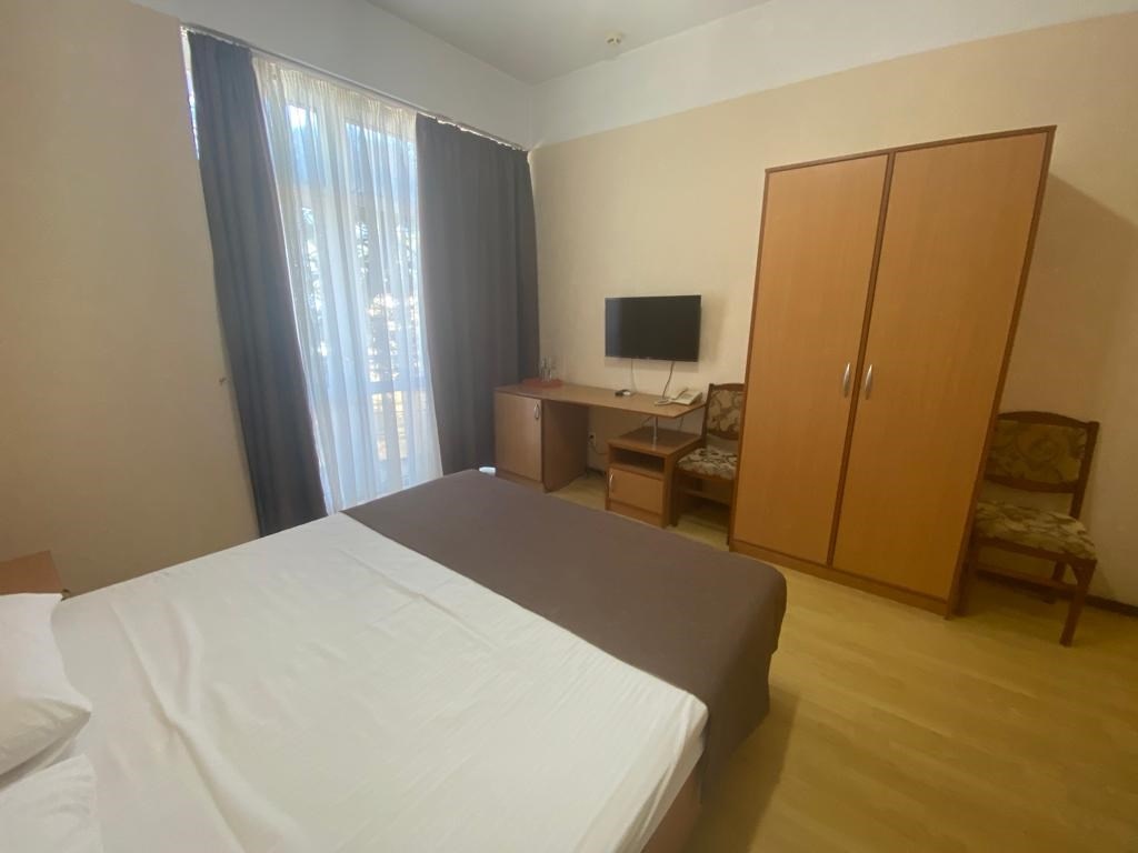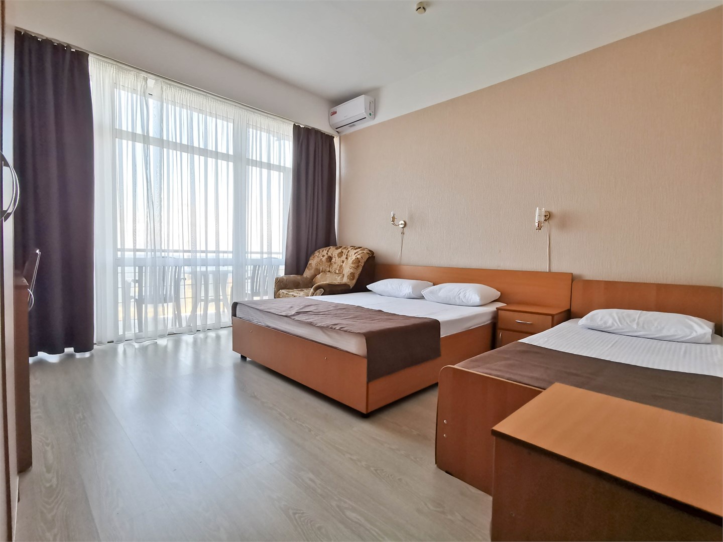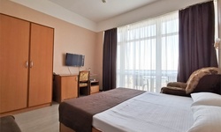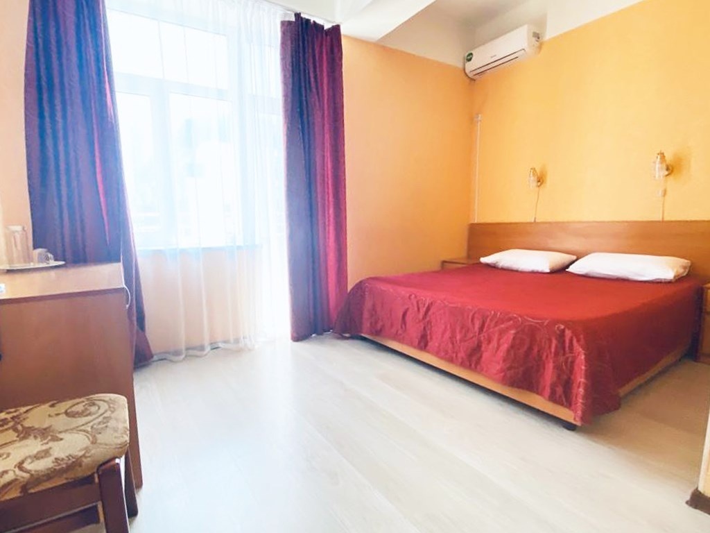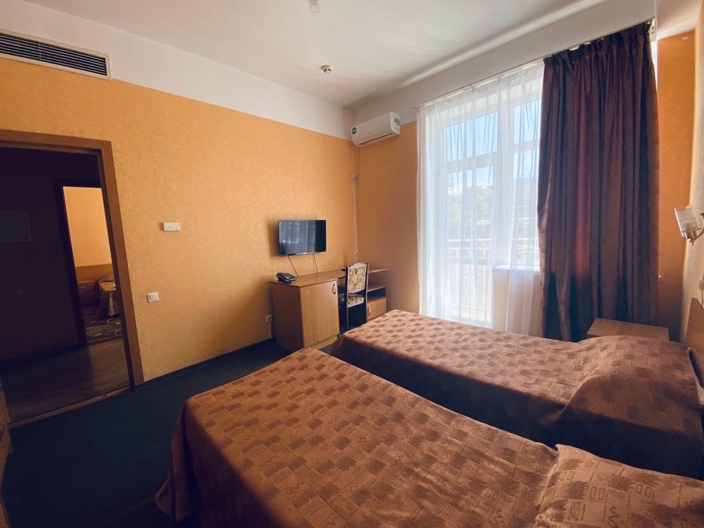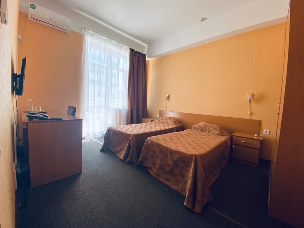 Двухместный номер с видом на море. Отдыхали в августе 2023г. Номер просторный, огромное окно и терраса с мебелью. Отель не новый, но косметический ремонт свежий, матрас удобный, что очень порадовало. Белье белоснежное, сплит, телевизор, посуда для чая, чайник, интернет- все работало. Кулер с водой, гладильная доска с утюгом на этаже. Персонал вежлив. В общем мы остались всем довольны. Рядом много кафе и набережная близко.