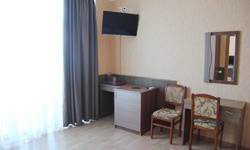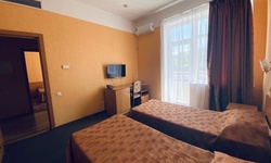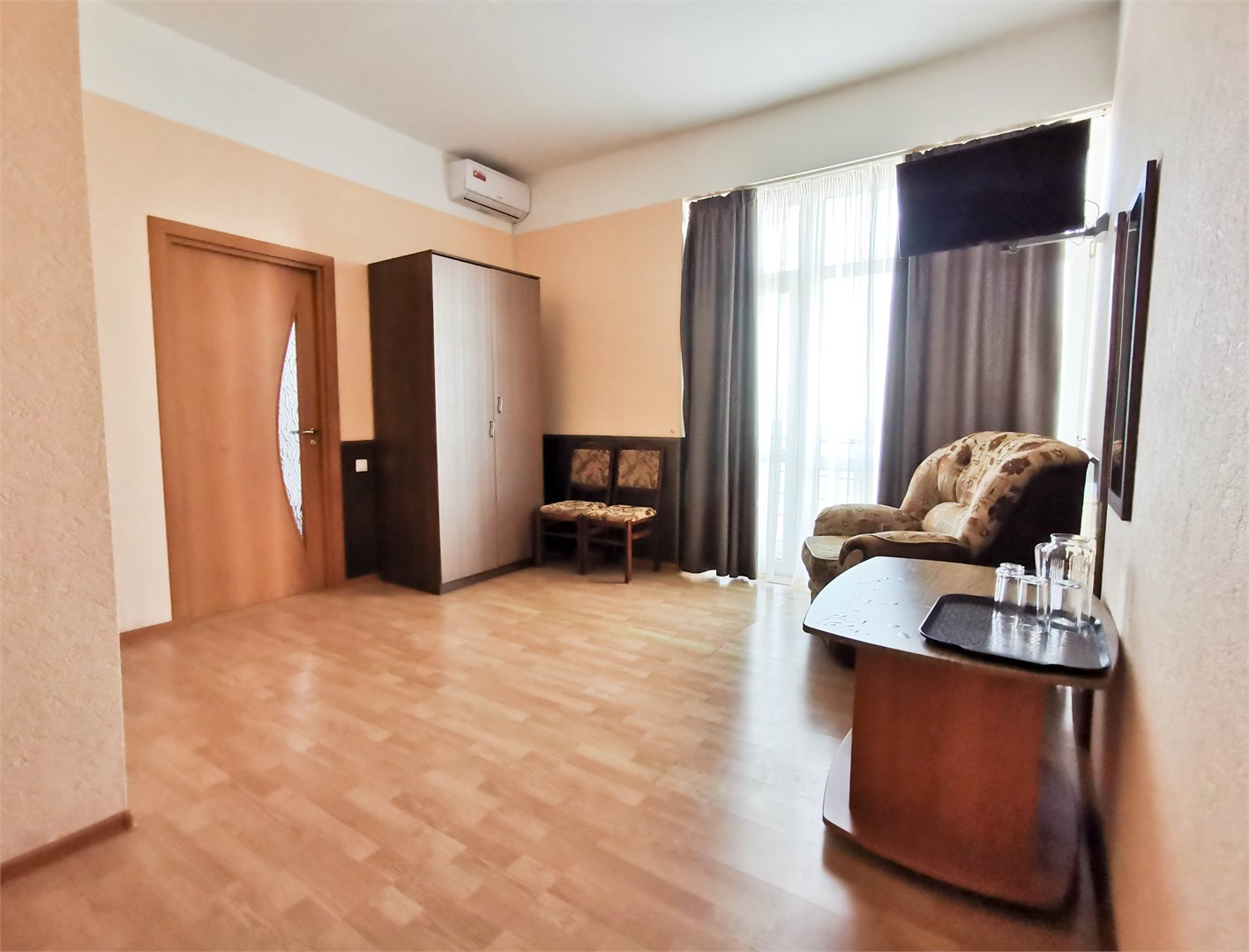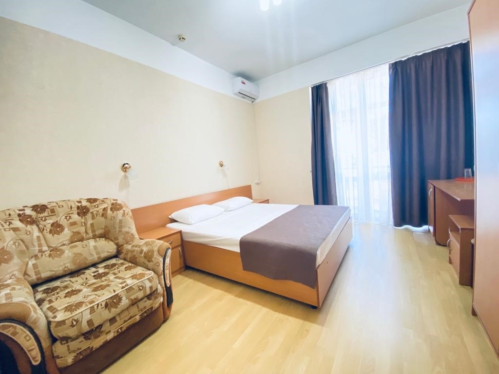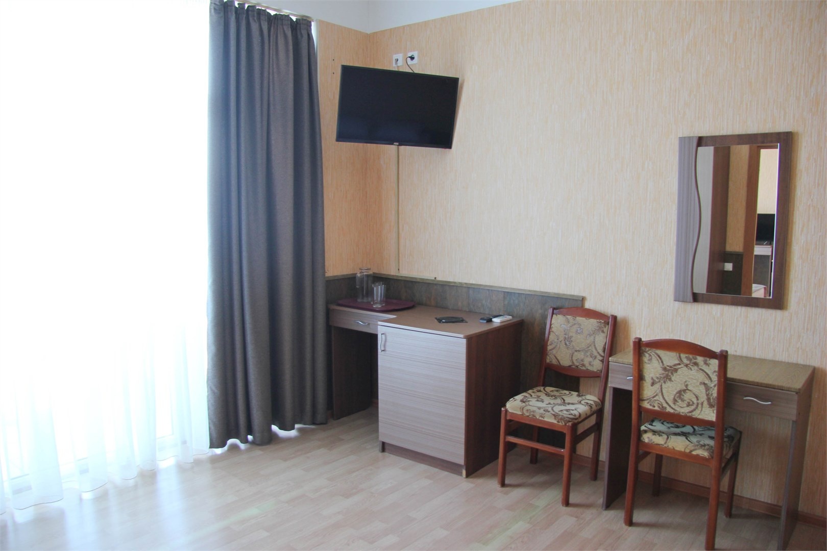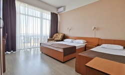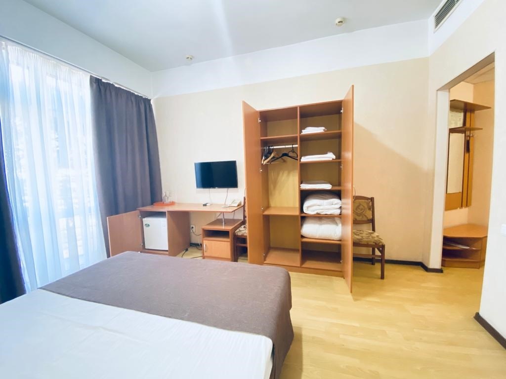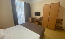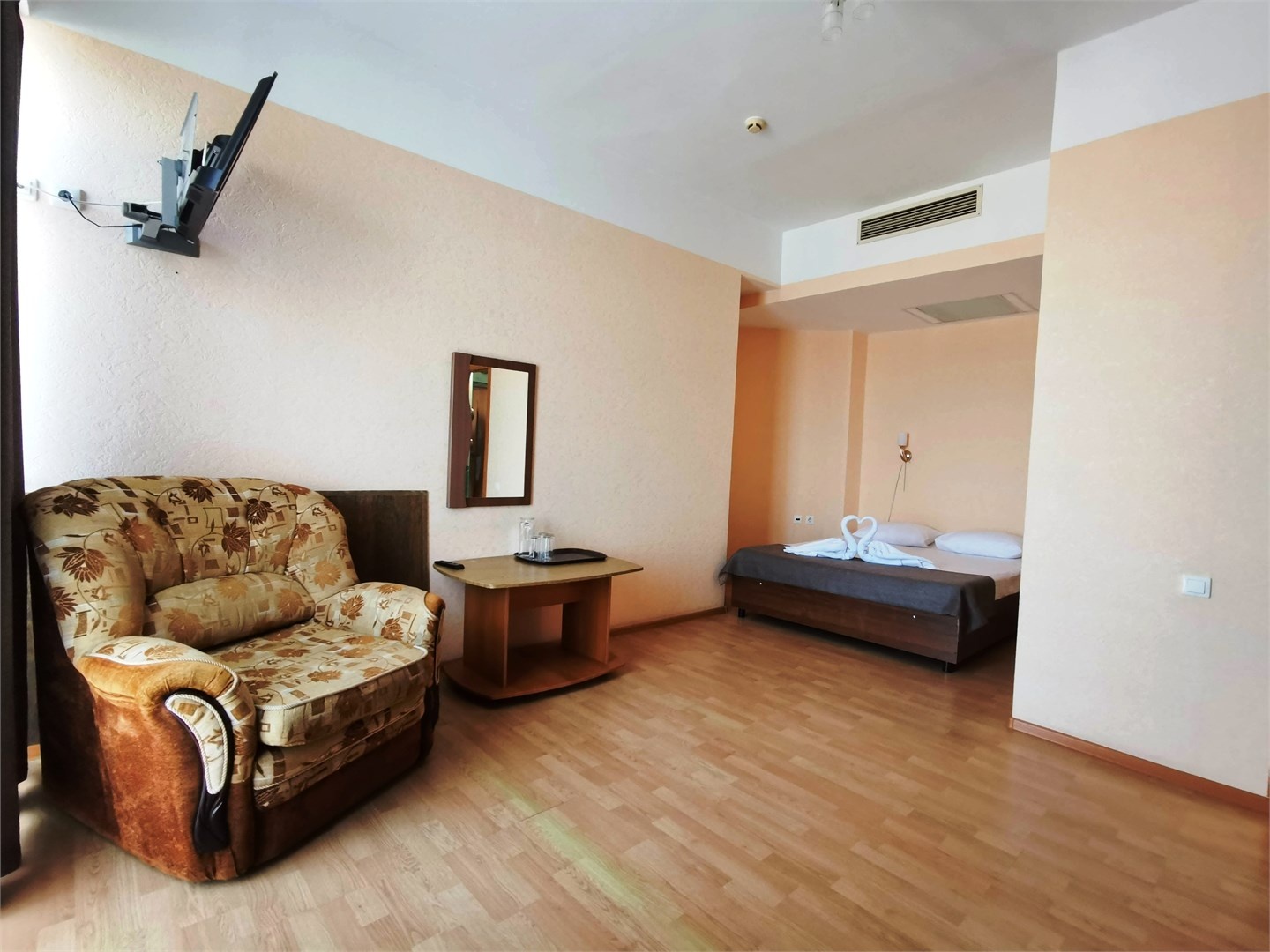 Двухместный номер с видом на море. Отдыхали в августе 2023г. Номер просторный, огромное окно и терраса с мебелью. Отель не новый, но косметический ремонт свежий, матрас удобный, что очень порадовало. Белье белоснежное, сплит, телевизор, посуда для чая, чайник, интернет- все работало. Кулер с водой, гладильная доска с утюгом на этаже. Персонал вежлив. В общем мы остались всем довольны. Рядом много кафе и набережная близко.