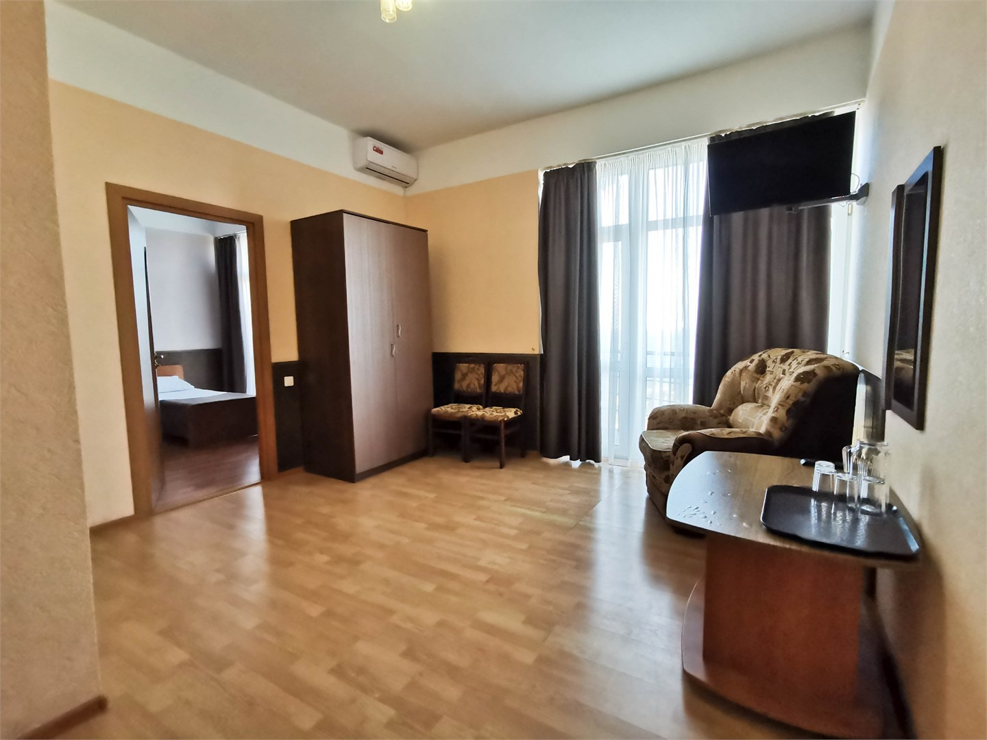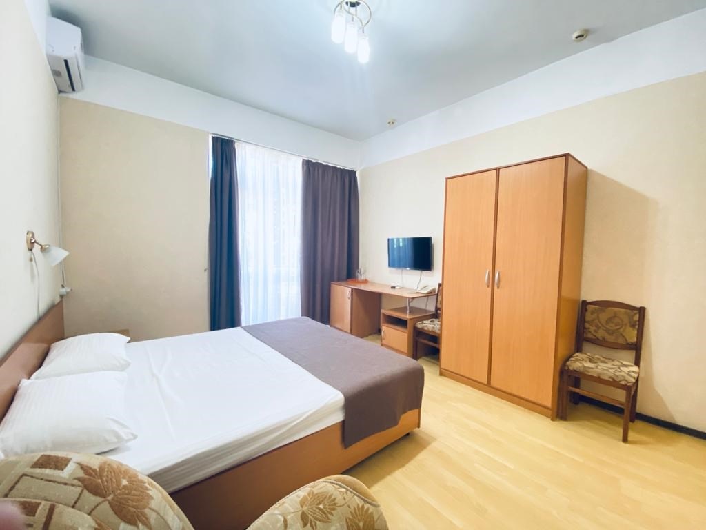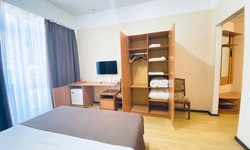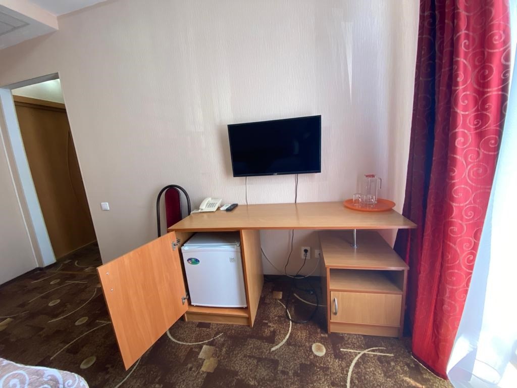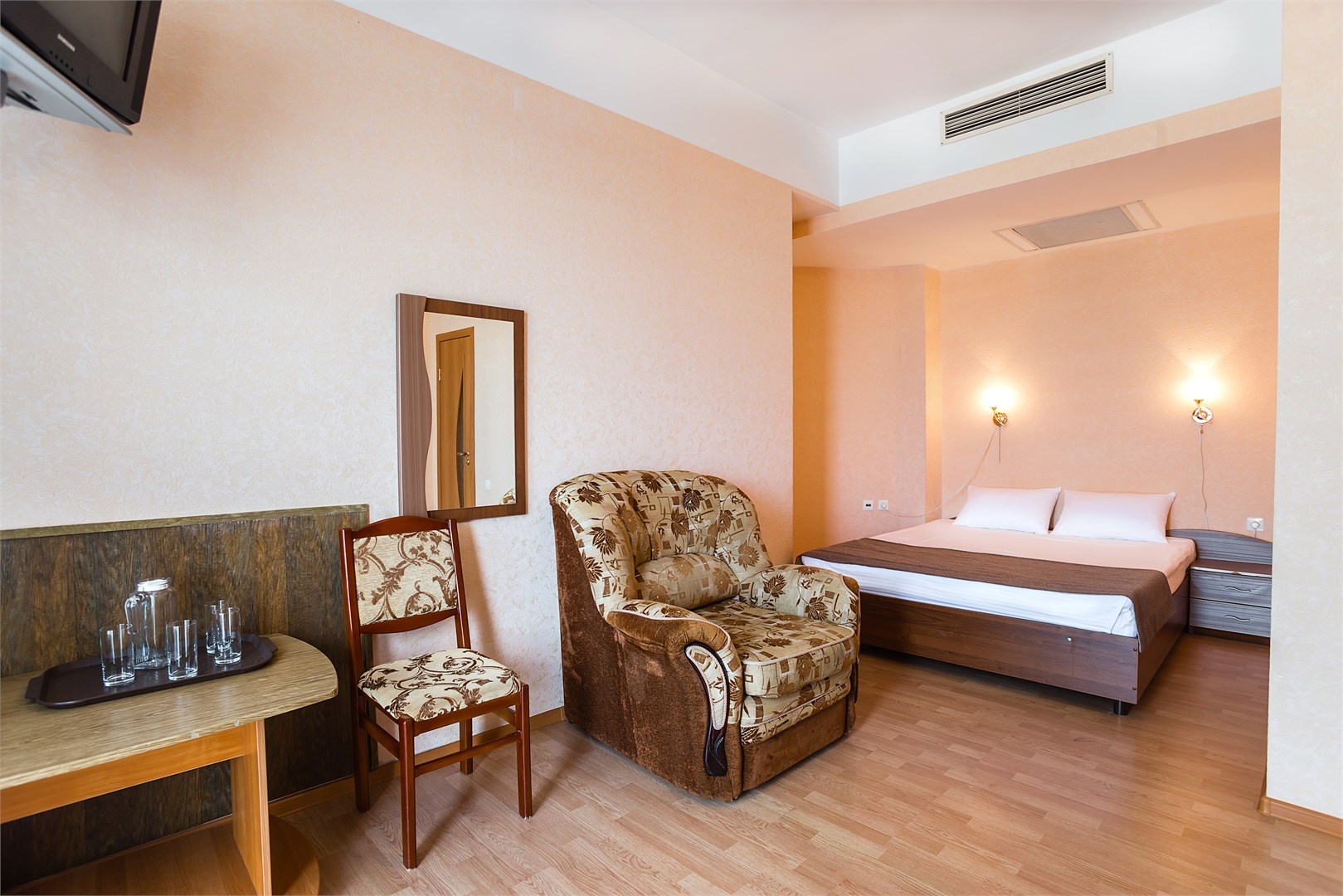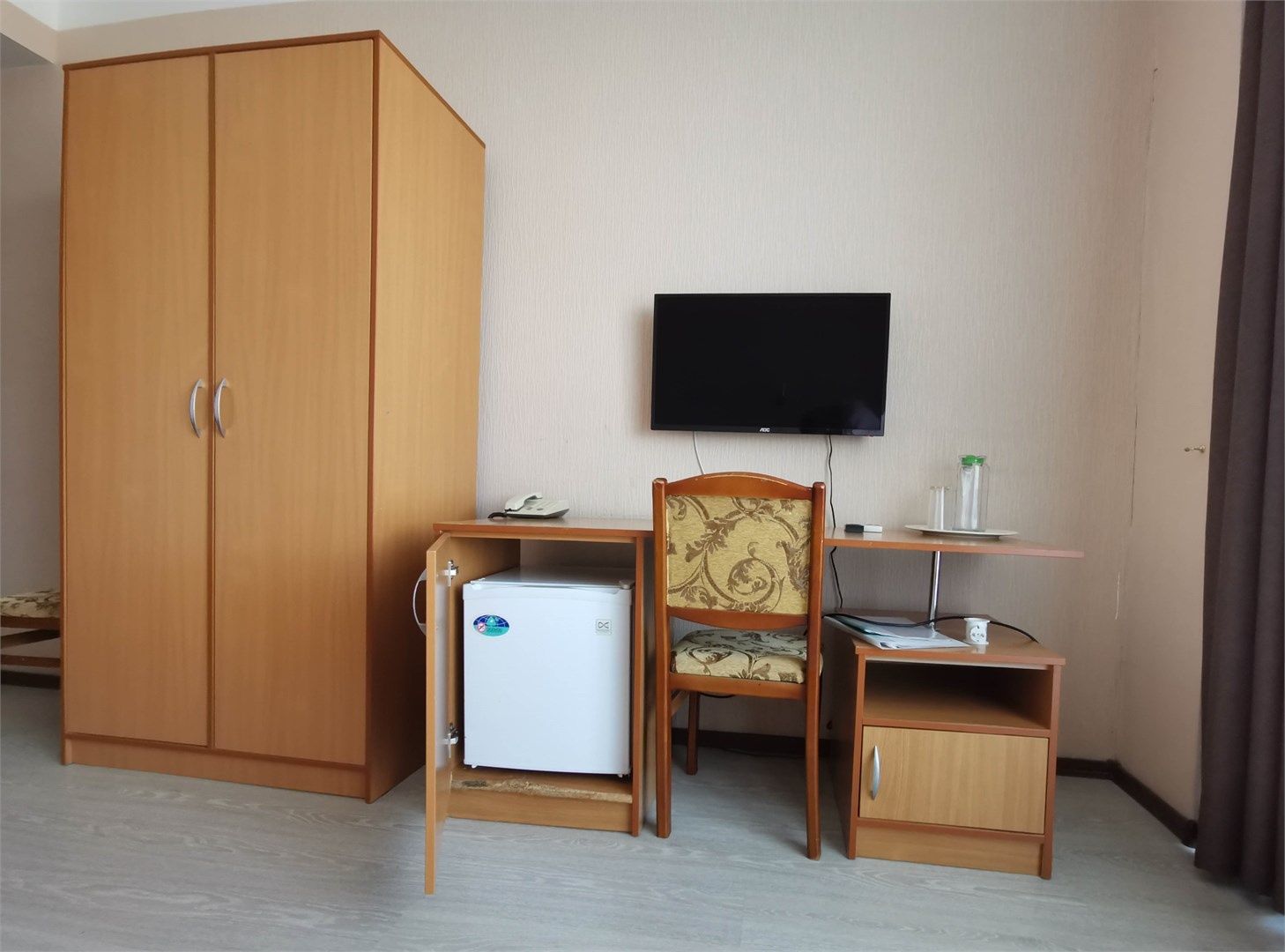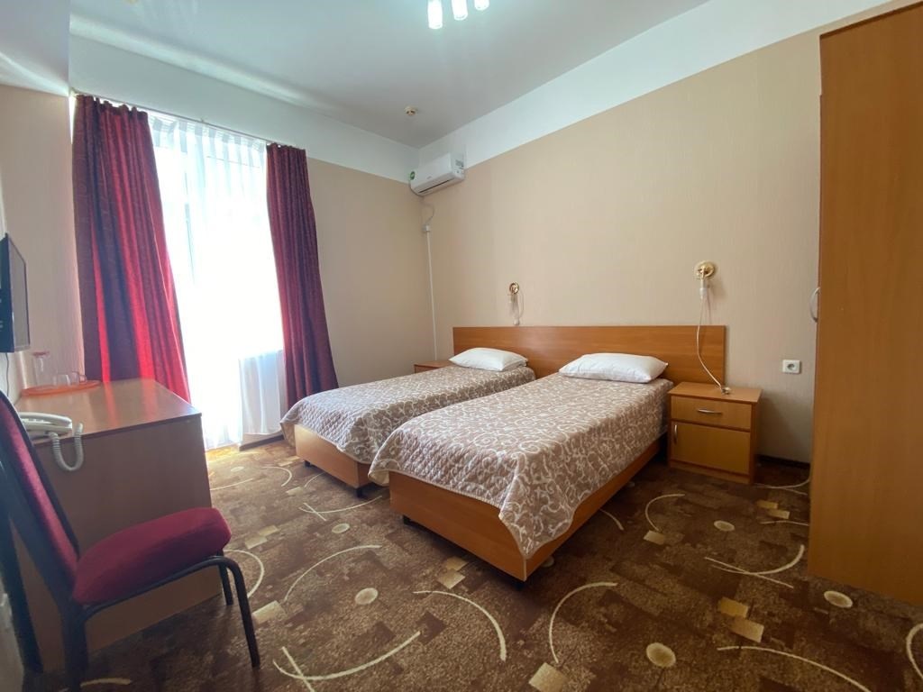 Двухместный номер с видом на море. Отдыхали в августе 2023г. Номер просторный, огромное окно и терраса с мебелью. Отель не новый, но косметический ремонт свежий, матрас удобный, что очень порадовало. Белье белоснежное, сплит, телевизор, посуда для чая, чайник, интернет- все работало. Кулер с водой, гладильная доска с утюгом на этаже. Персонал вежлив. В общем мы остались всем довольны. Рядом много кафе и набережная близко.