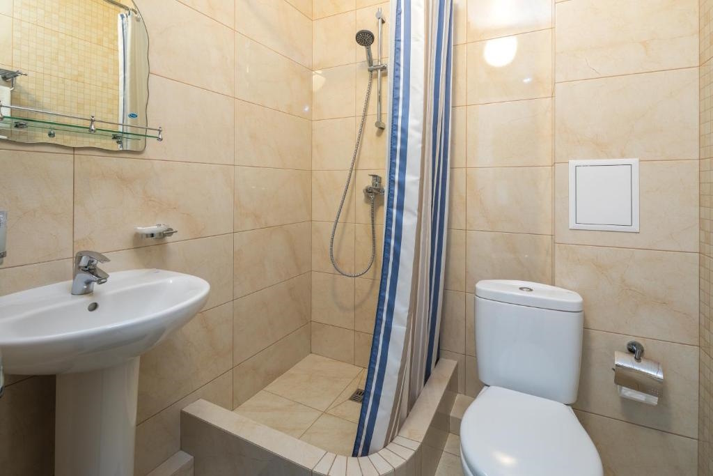 Отличное расположение: 5 минут до пляжа пешком, рядом Центральный парк аттракционов, напротив магазин Перекрёсток. В отеле очень чисто, в номерах белоснежное постельное бельё, хорошие подушки, икеевские одеяла, в номере есть кондиционер, ложка для обуви, вешалки для одежды, сушилка для белья, телевизор, холодильник, электрический чайник, немного посуды. При вьезде было мыло,шампунь, кондей. Полотенца белоснежные. Телевизор ловит много каналов, прекрасный wi-fi. Гостиница в четыре этажа, лифта не видела, поднимались пешком. Завтрак, проходит в цоколе, там прохладно, светло, есть телевизор, столиков немного. Мы жили 4 дня, завтрак, шведский стол: