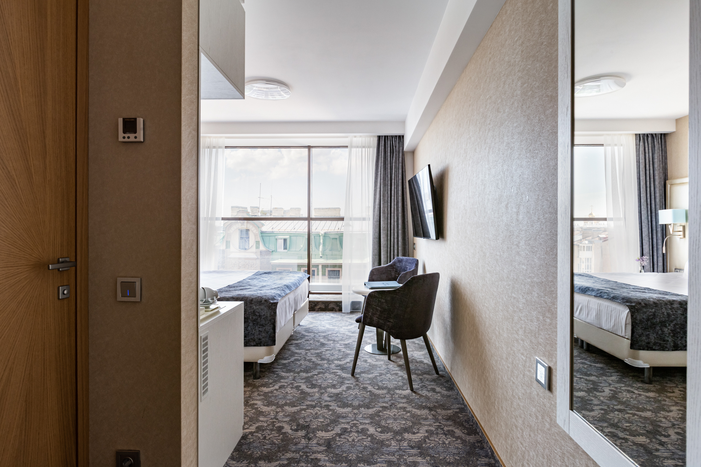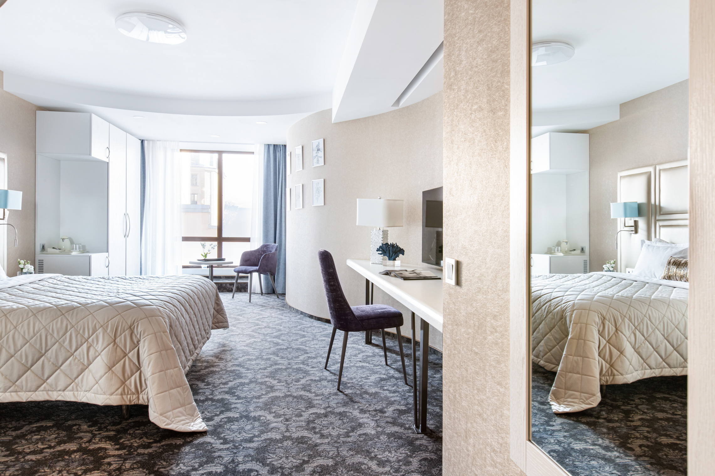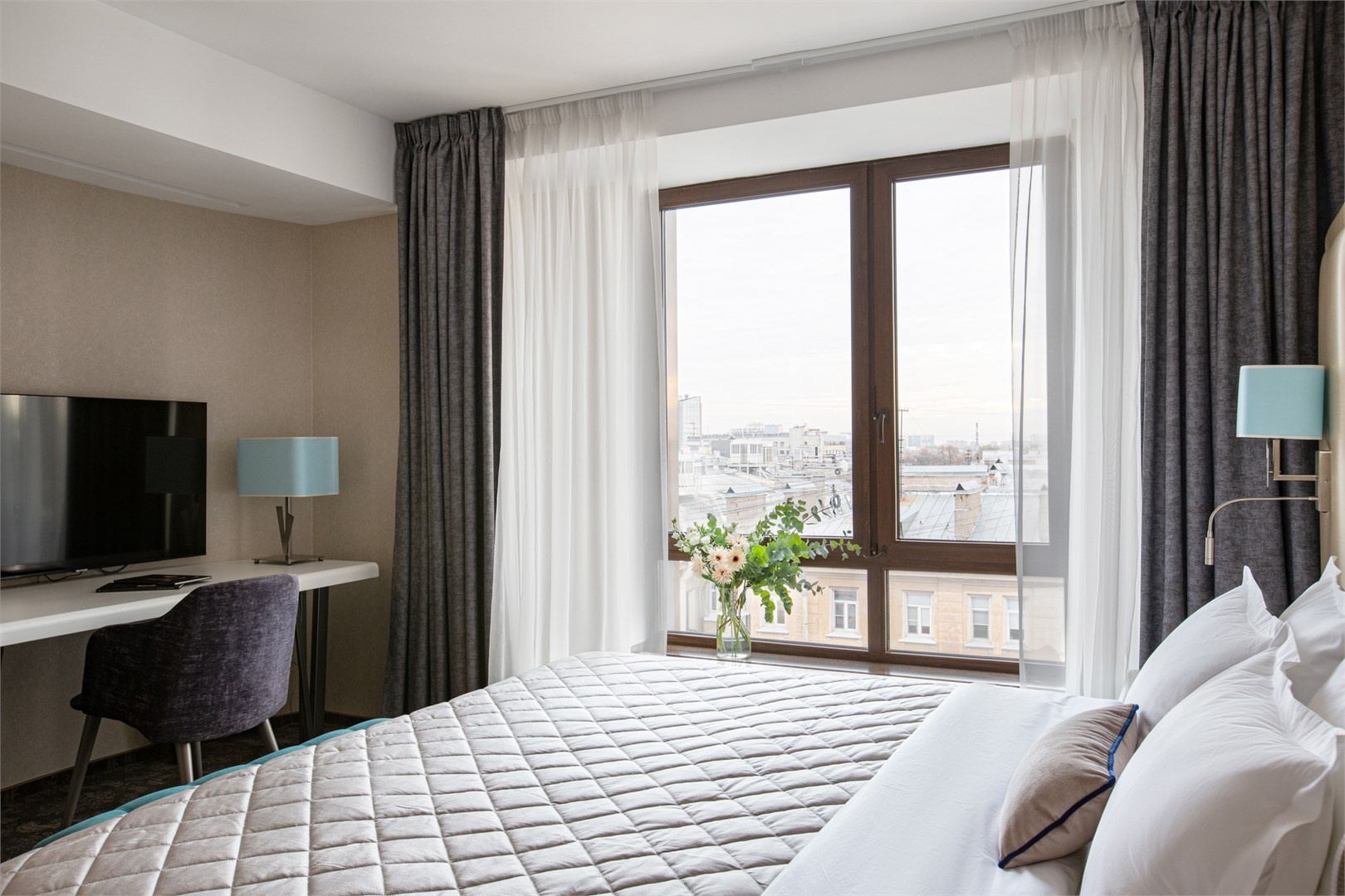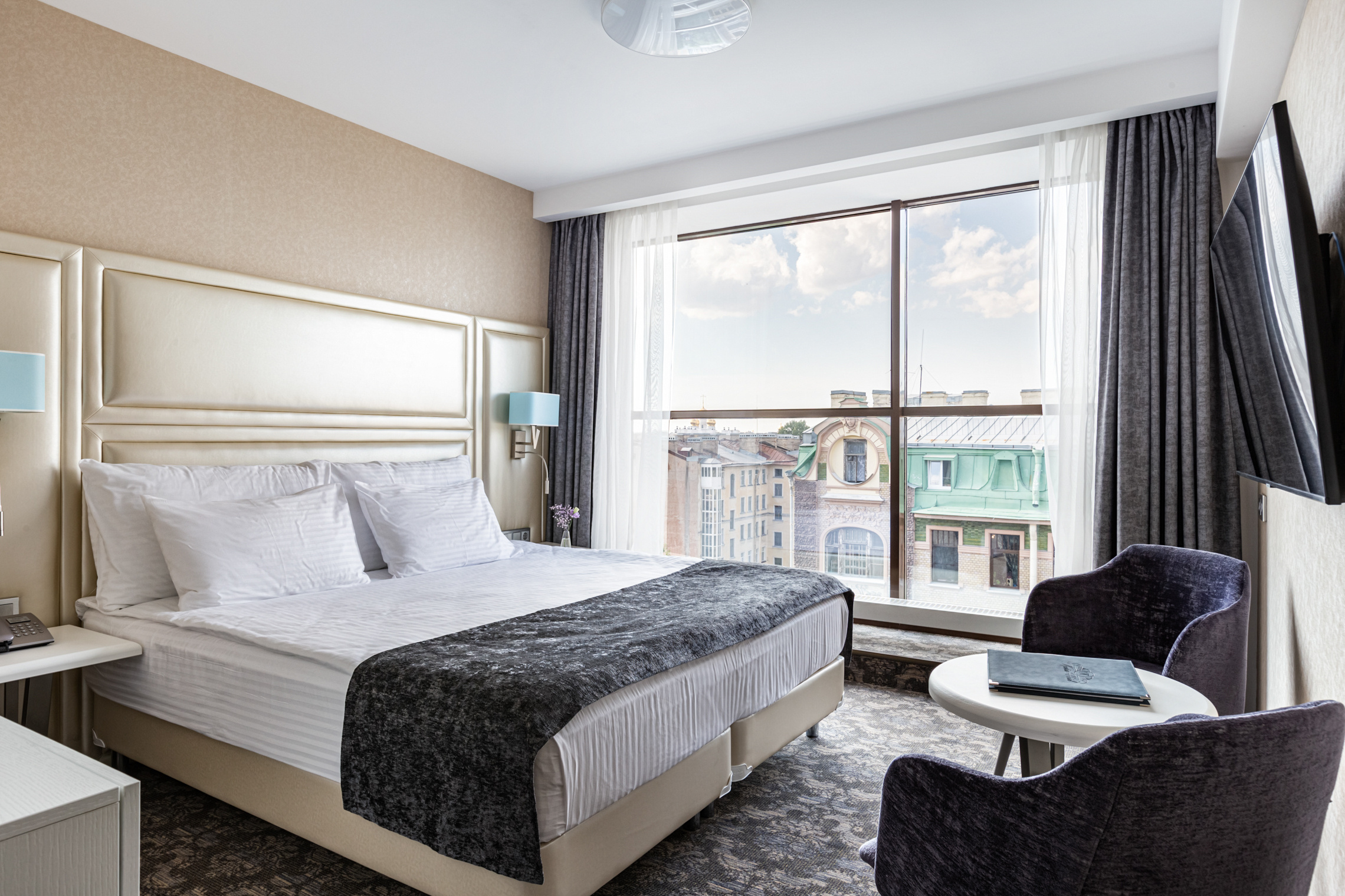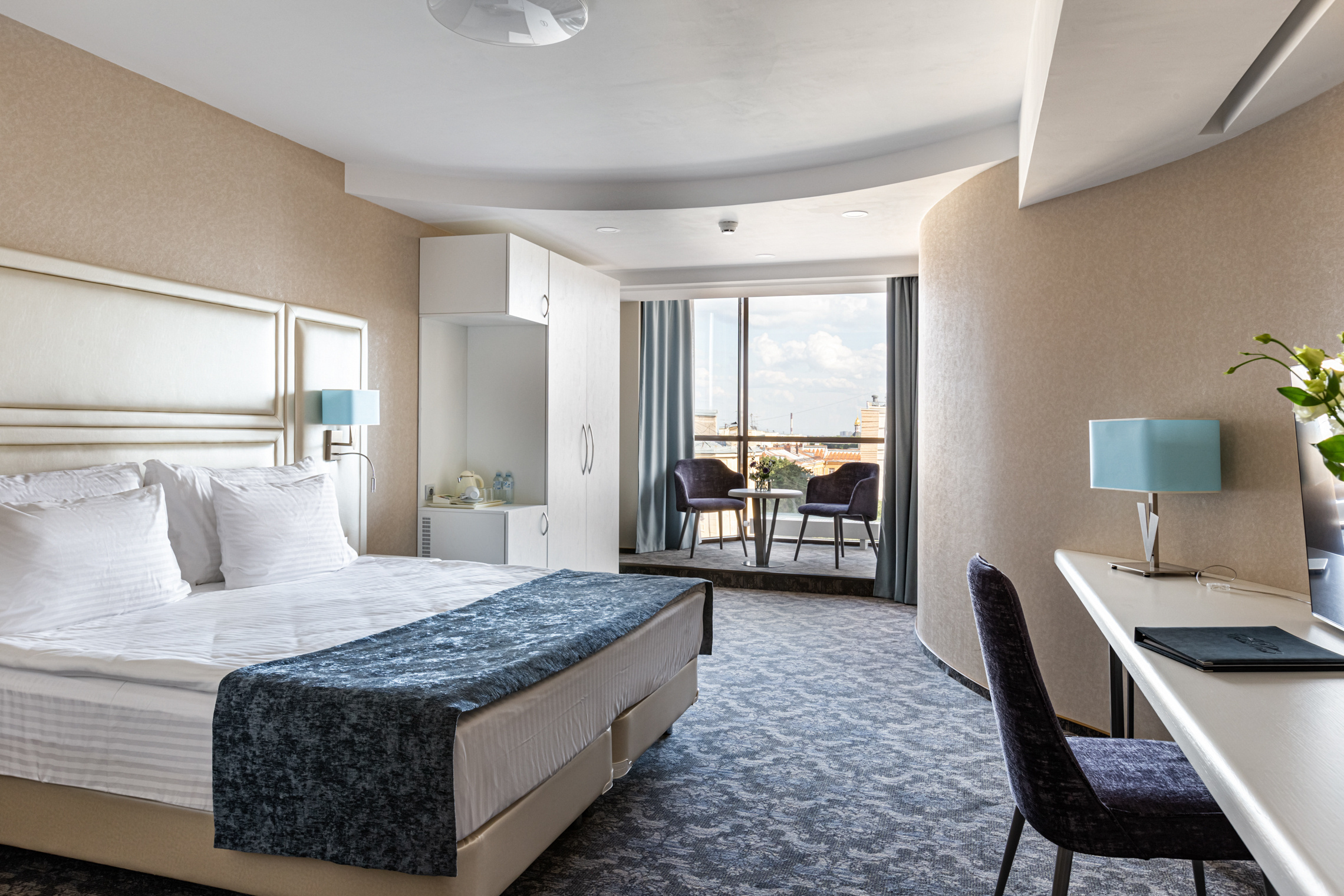 Преимущественно представлены номера с панорамным видом на город, имеются номера с эркерами и террасами, также представлены номера для гостей с ограниченными возможностями. Оснащение зависит от выбранной категории номера.