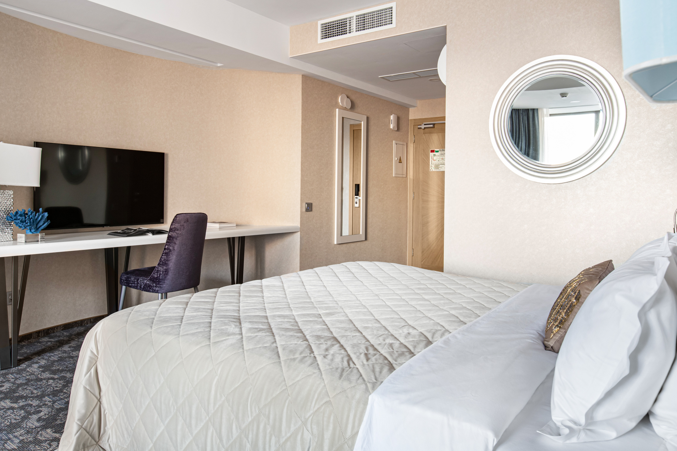 Фотографии номеров намного красивее, чем на самом деле. Номер делюкс с самой дешевой мебелью и пестрым ковролином (чтобы не было видно грязи) и видом на вентиляционные трубы. Администратор пошла на встречу, предложила альтернативный номер (на который мы согласились), однако обстановка в номере аналогична номеру от которого отказались. Не особо приветливый персонал на ресепшн, при почти пустом отеле заявили, что других номеров нет из-за полной загрузки :)). В ресторане на террасе 10 этажа поужинать ну удалось по причине отсутствия поваров горячих цехов кухни. «Горячие блюда мы не готовим, все повара уволились, модем салатик, но ждать от 40 мин» - это цитата. При заезде предлагают отказаться от брони через островок и получить скидку 5%. В общем исключительно негативные впечатления о посещении отеля…… не рекомендую!