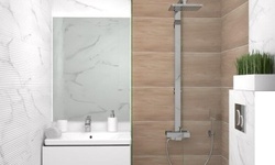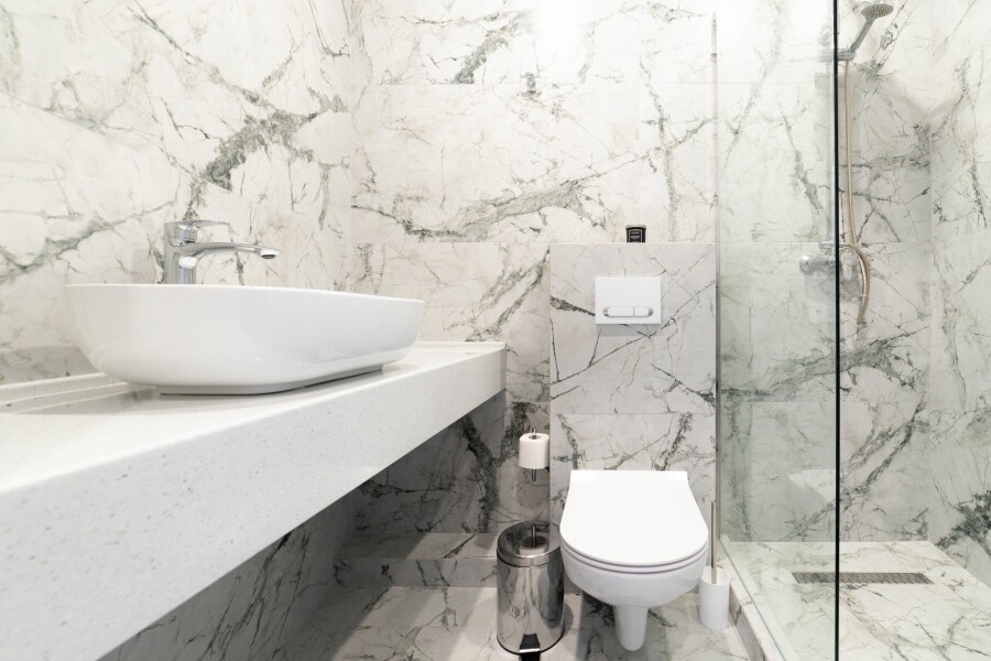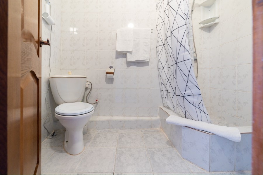 Обшарпанные двери и кафель в ванной.
