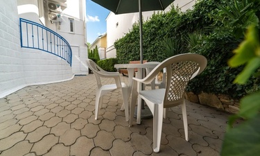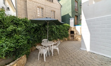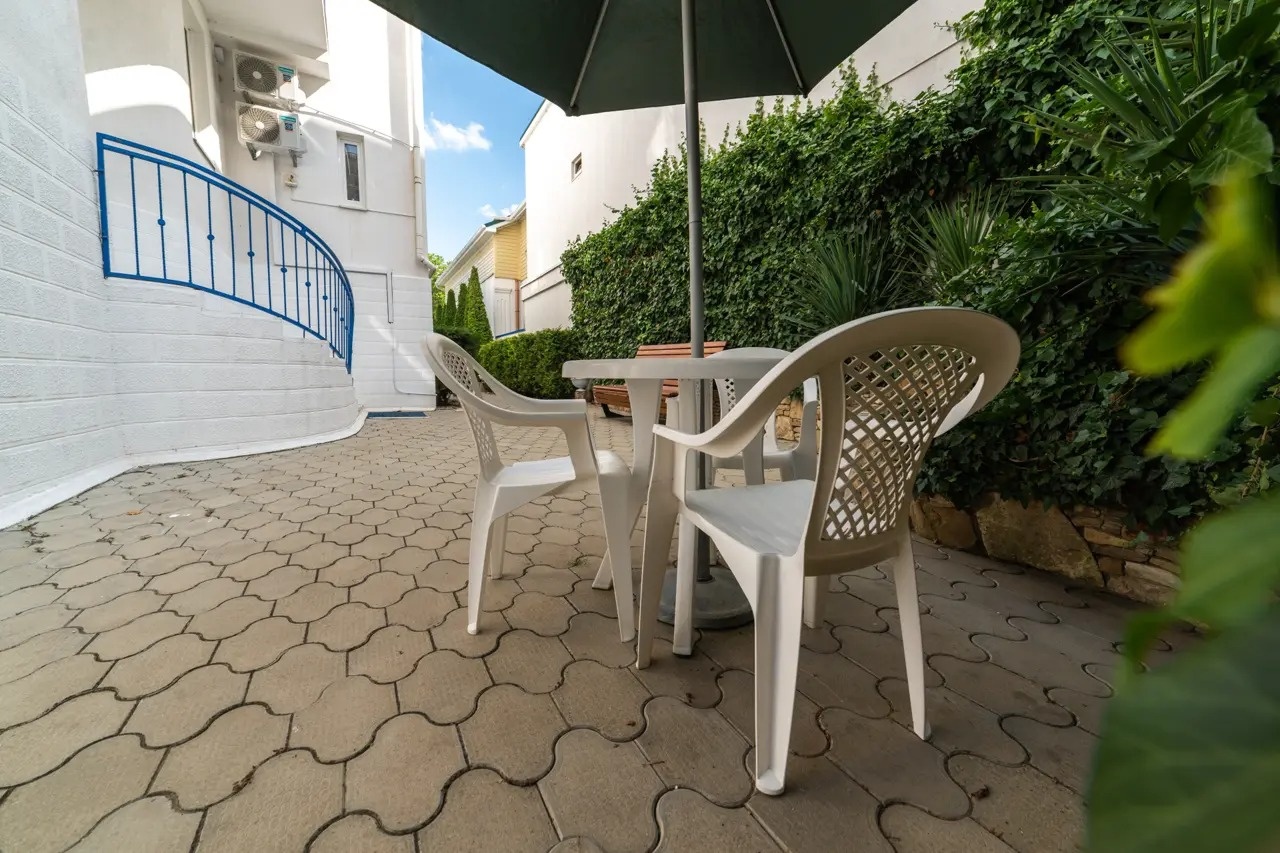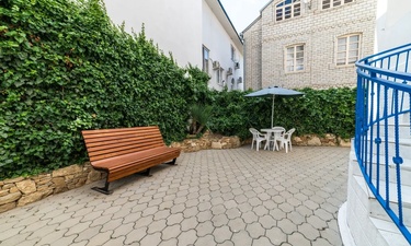 Территория огорожена, на входе - кодовый замок. Аллея колоновидных туй, вазоны с цветами, античная лужайка, столики со стульями под зонтами располагают к уютной домашней атмосфере. Для гостей, путешествующих на автомобиле, на территории имеется открытая бесплатная парковка.