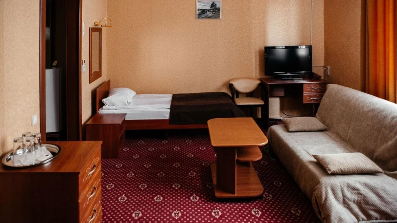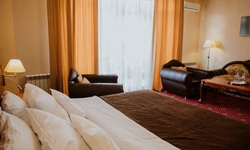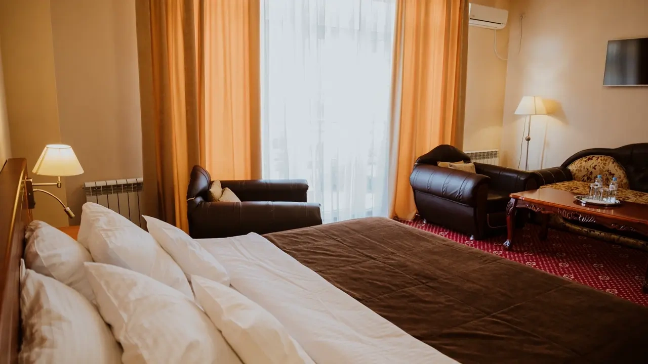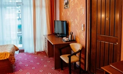 Большой, улучшенный номер 25 кв.м с 1 большой двуспальной кроватью и 1 диваном-кроватью. Номер с балконом. В номере имеется всё необходимое: Кондиционер. Собственная ванная комната. Телевизор с плоским экраном Полотенца Средства индивидуального пользования Холодильник Телефон Отопление Фен Ковровое покрытие Кабельные каналы Шкаф Вешалка для одежды