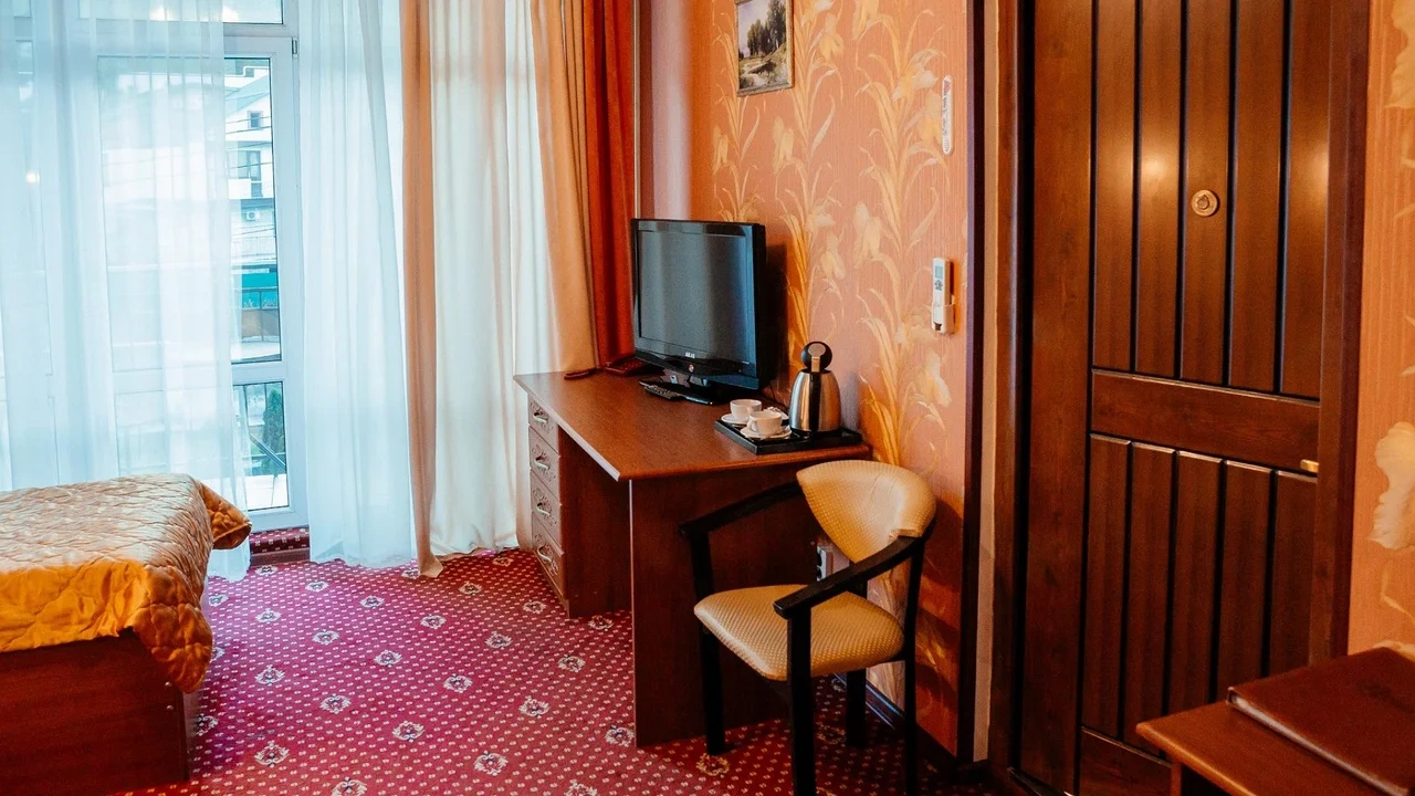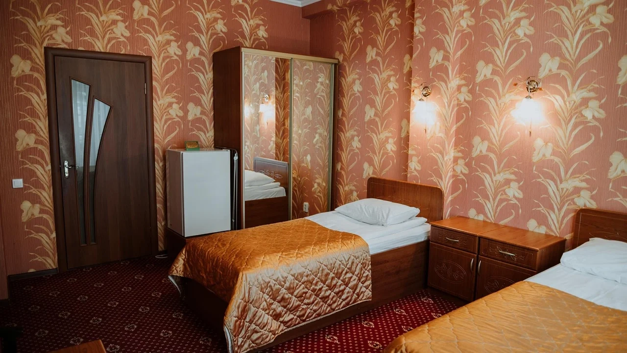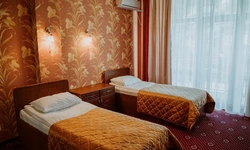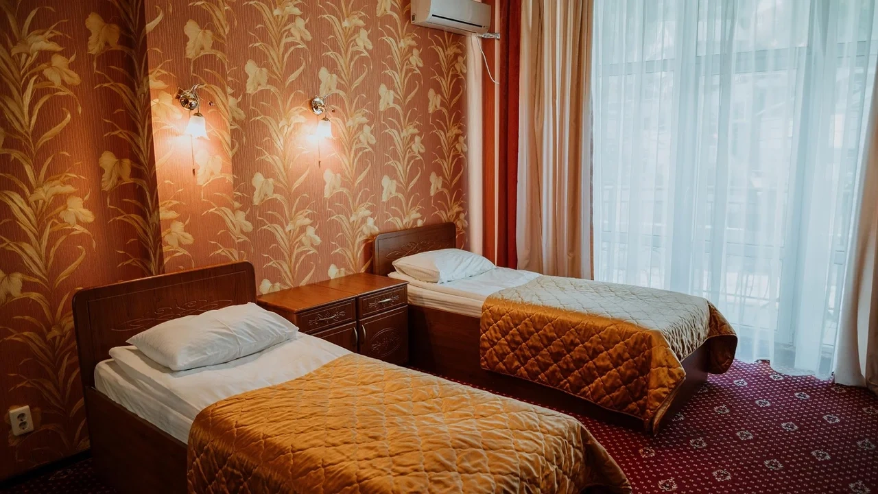 Небольшой номер 19 кв.м с 2 односпальными кроватями и балконом. В номере имеется всё необходимое: Кондиционер. Собственная ванная комната. Телевизор с плоским экраном Полотенца Средства индивидуального пользования Холодильник Телефон Отопление Фен Ковровое покрытие Кабельные каналы Шкаф Вешалка для одежды