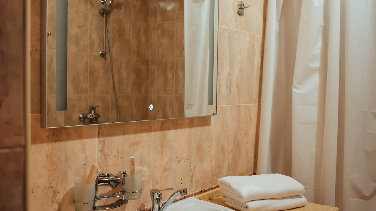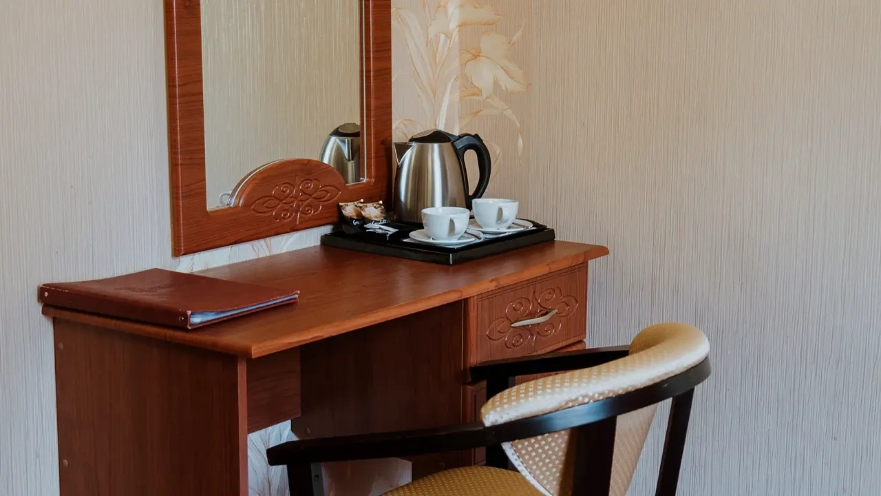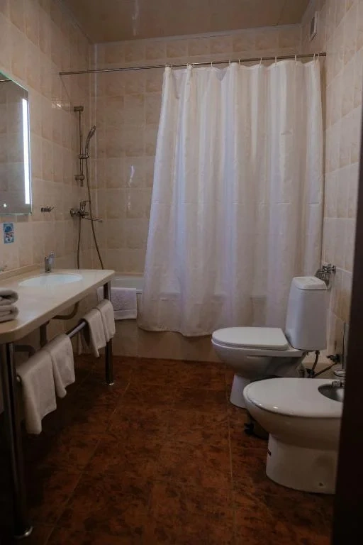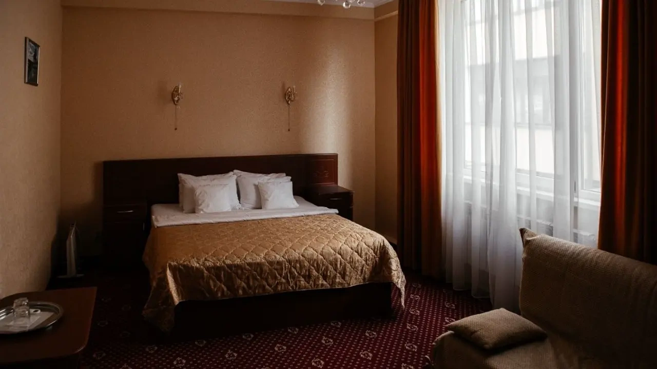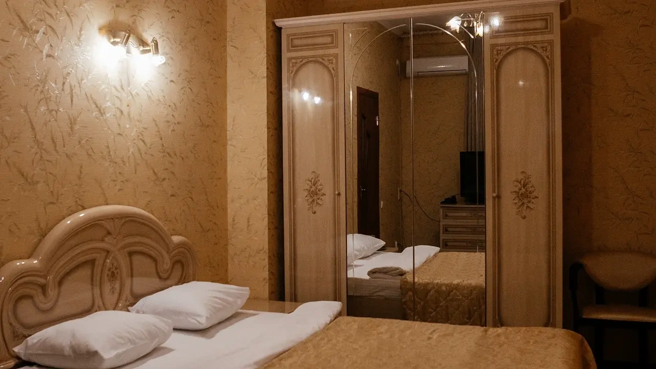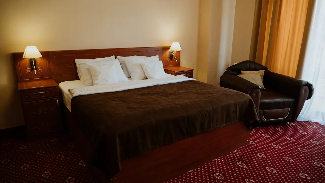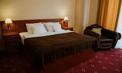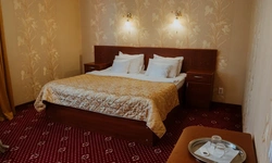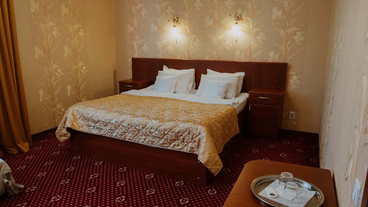 Стандартный двухместный номер 20 кв.м с 1 двуспальной кроватью. В номере имеется всё необходимое: Кондиционер. Собственная ванная комната. Телевизор с плоским экраном Полотенца Средства индивидуального пользования Холодильник Телефон Отопление Фен Ковровое покрытие Кабельные каналы Шкаф Вешалка для одежды