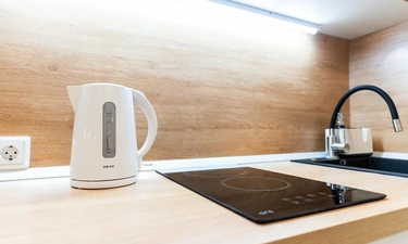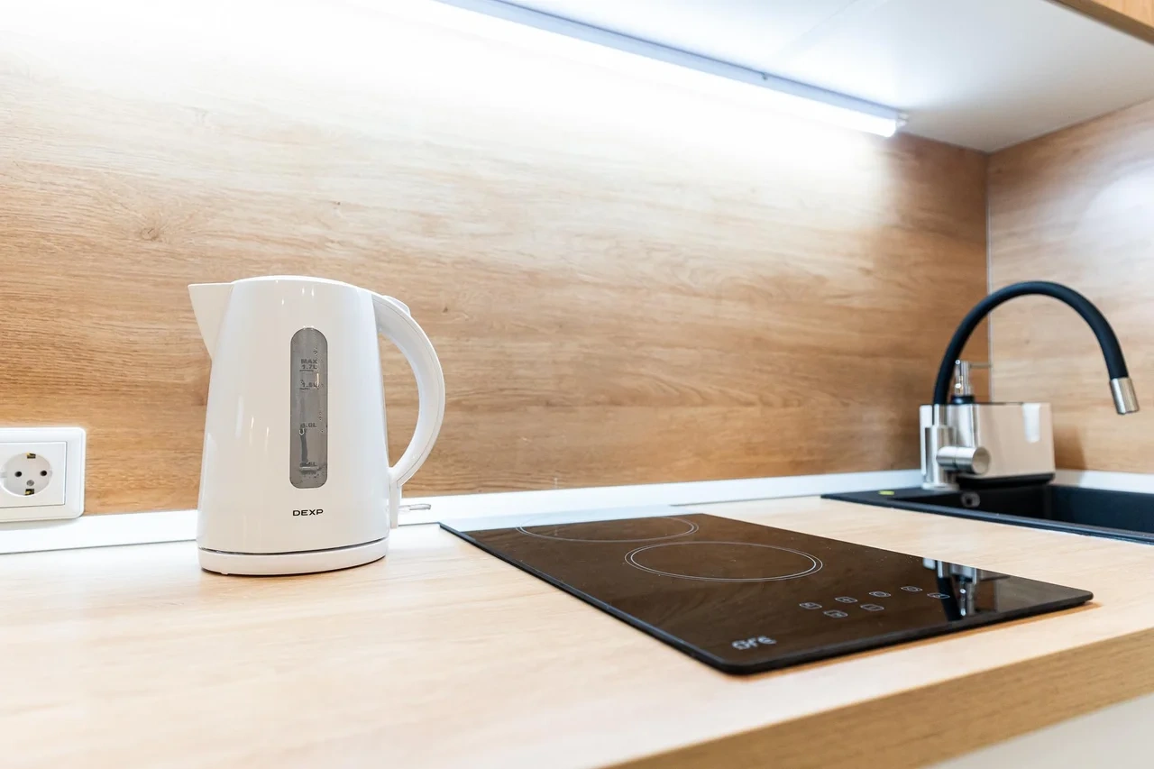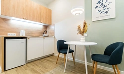 Кухонная зона с микроволновкой и всей необходимой техникой. Лоджия с зоной отдыха.