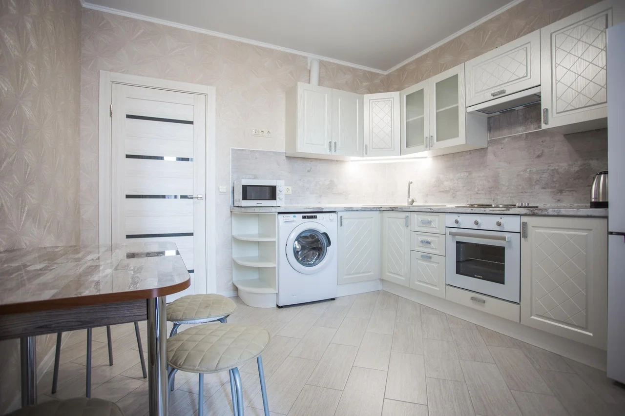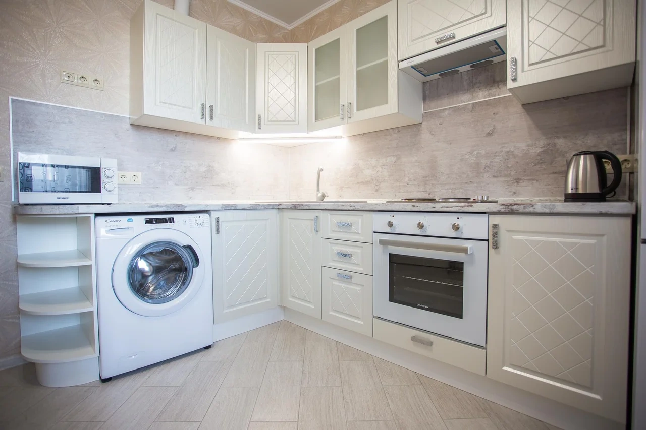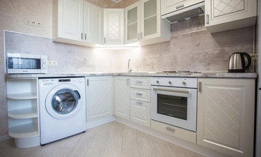 Кухня со всем необходимым для приготовления пищи (плита, духовой шкаф, микроволновая печь, чайник, холодильник, посуда и приборы). Стиральная машина. Кондиционер.