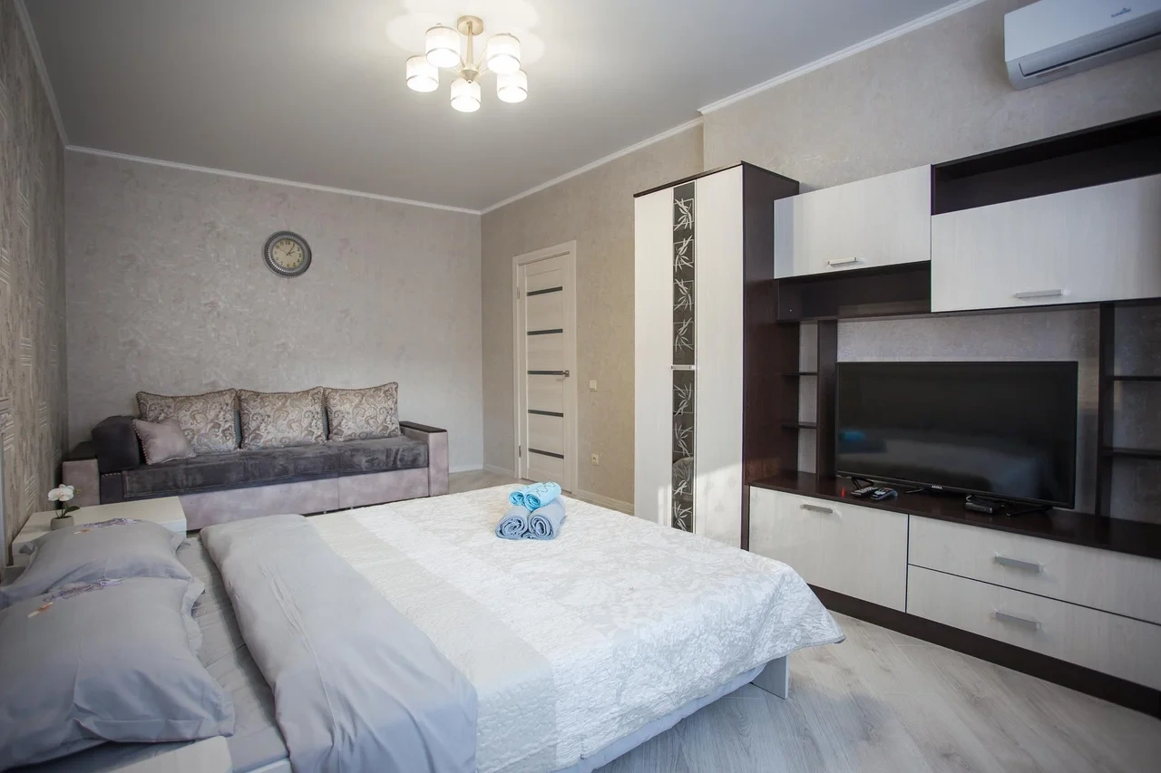 В комнате большая кровать и раскладной двуспальный диван, телевизор. Кондиционер. Гладильная доска и утюг.