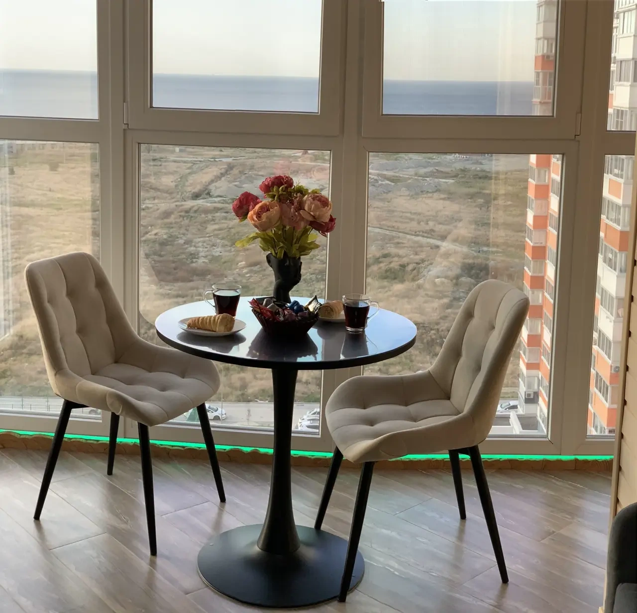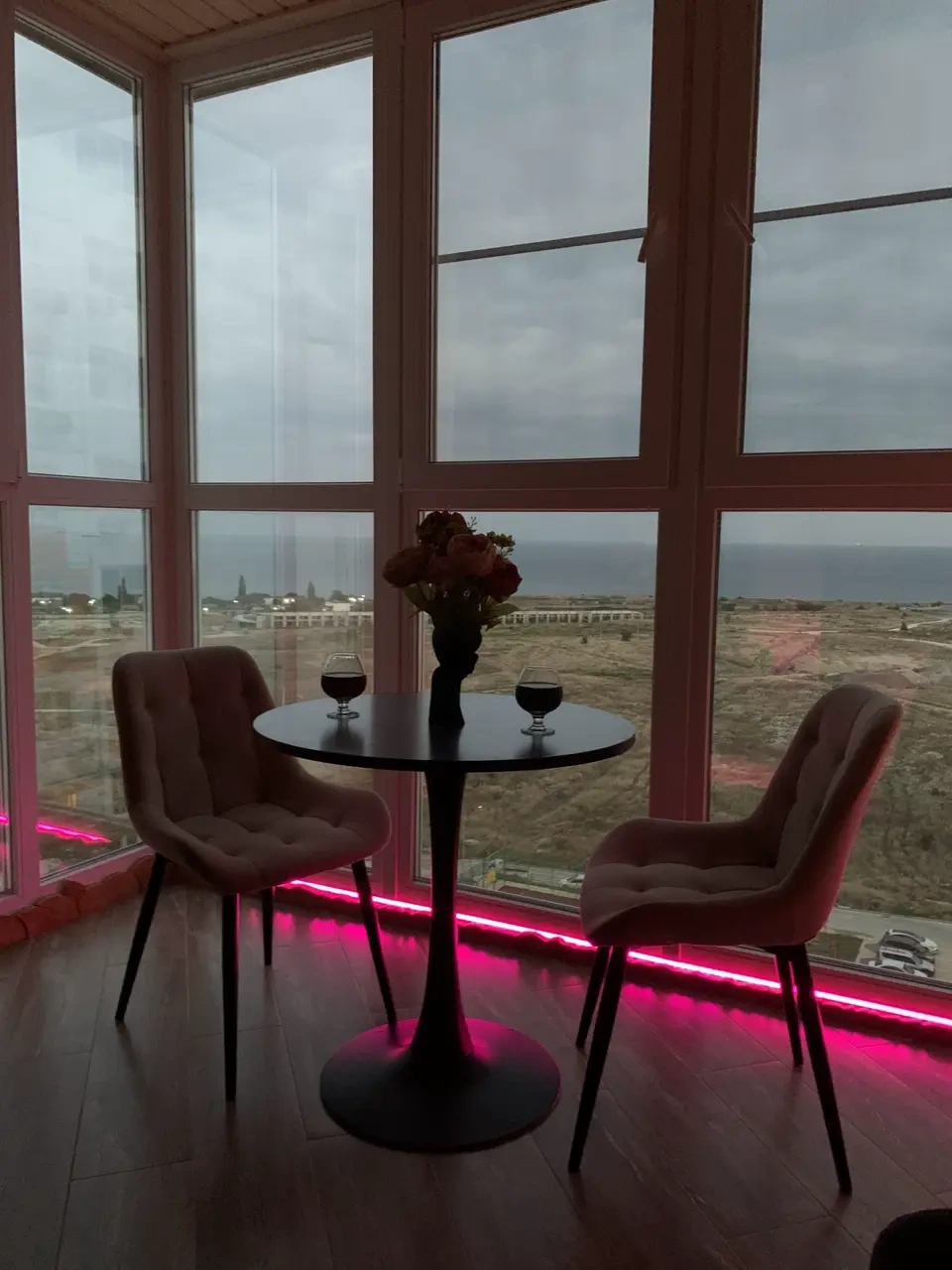 Особым местом притяжения станет для Вас обеденная зона с отделкой деревом, витражным тонированным остеклением, панорамным видом на море, подсветкой пола и потолка, где так приятно выпить бокал игристого под шум морского прибоя.