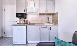 -Оборудованная посудой и техникой кухня, где есть варочная панель, духовой шкаф, холодильник, свч и чайник