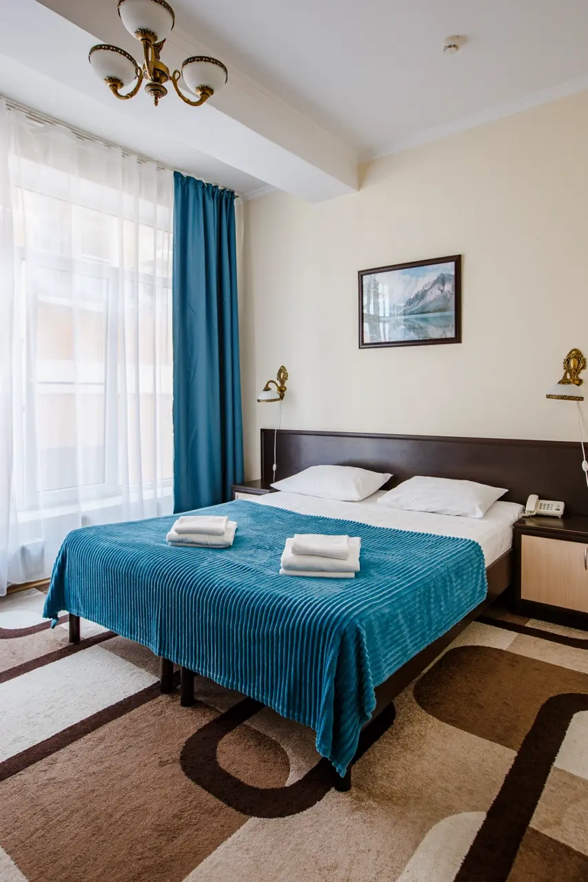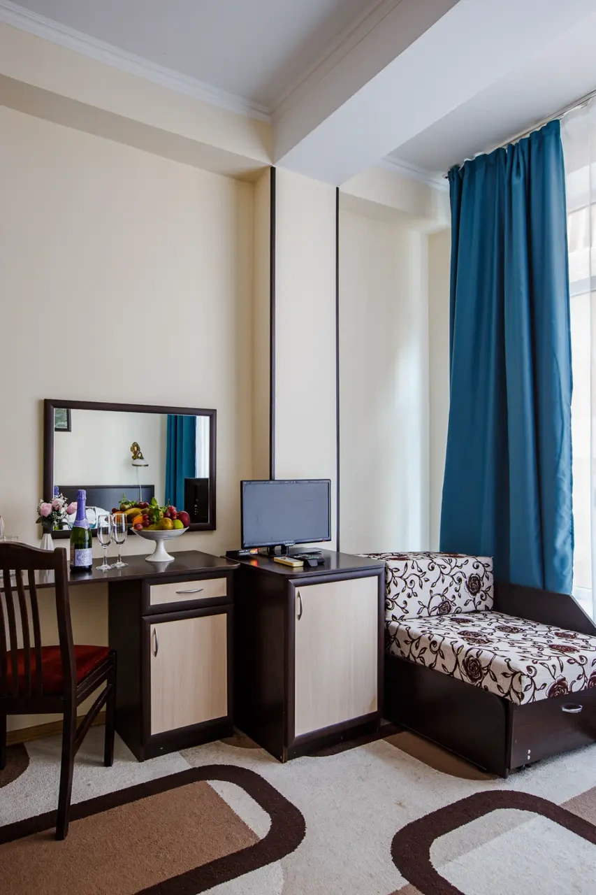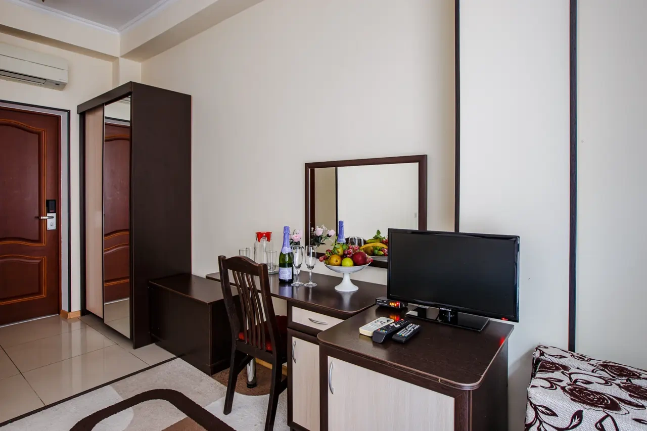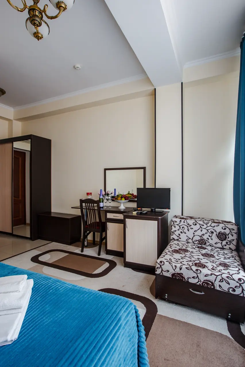 Хороший отель.Обслуживание замечательное,админы вежливые и учтивые.В номере чистота. Сам номер обычный , но есть все.Есть Wi-fi, работает хорошо.Есть набор средств личной гигиены. В отеле можно поесть , завтраки нормальные.Цена=качеству, мне понравилось. Набережная и доступность к ней шикарно