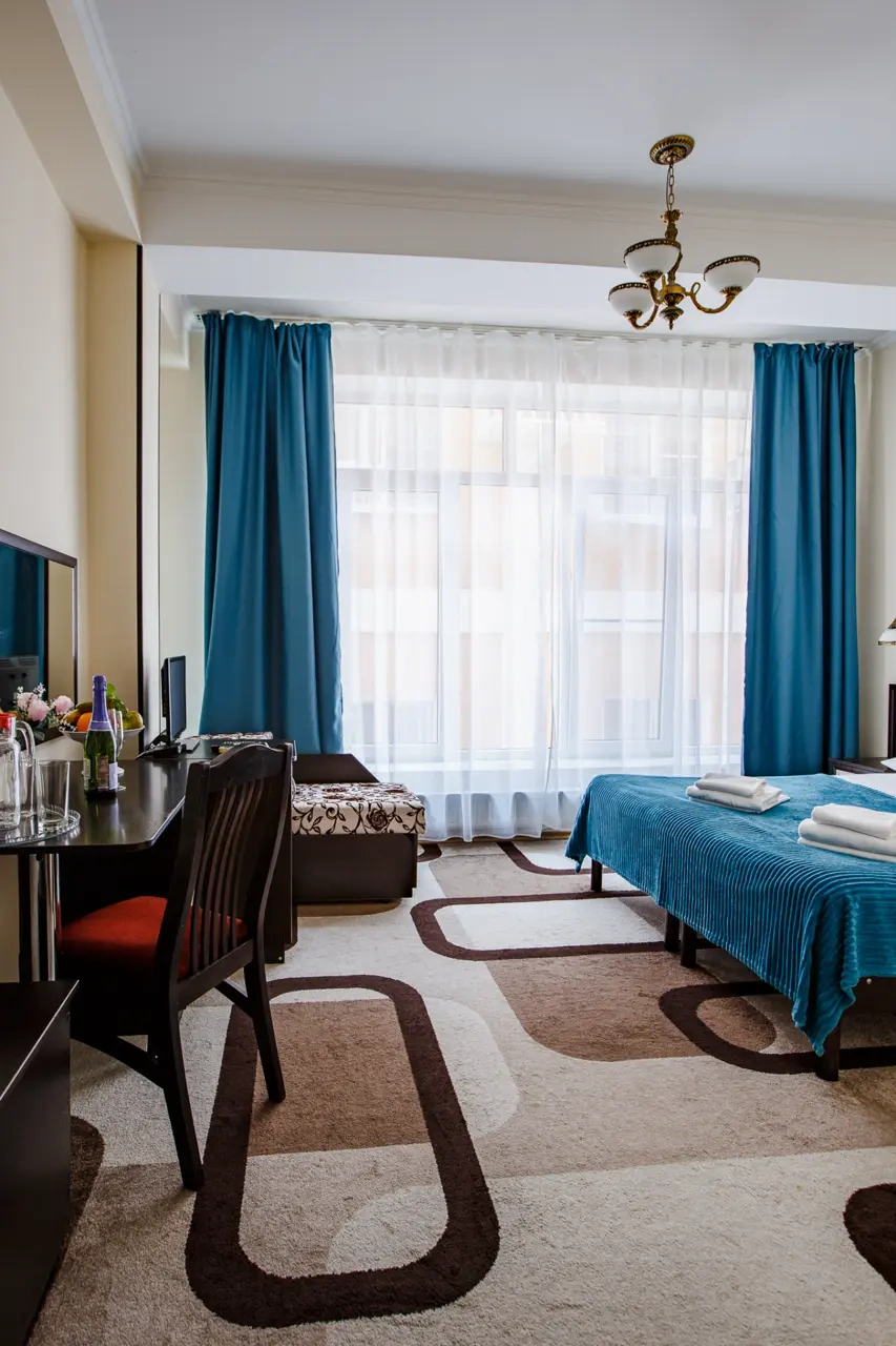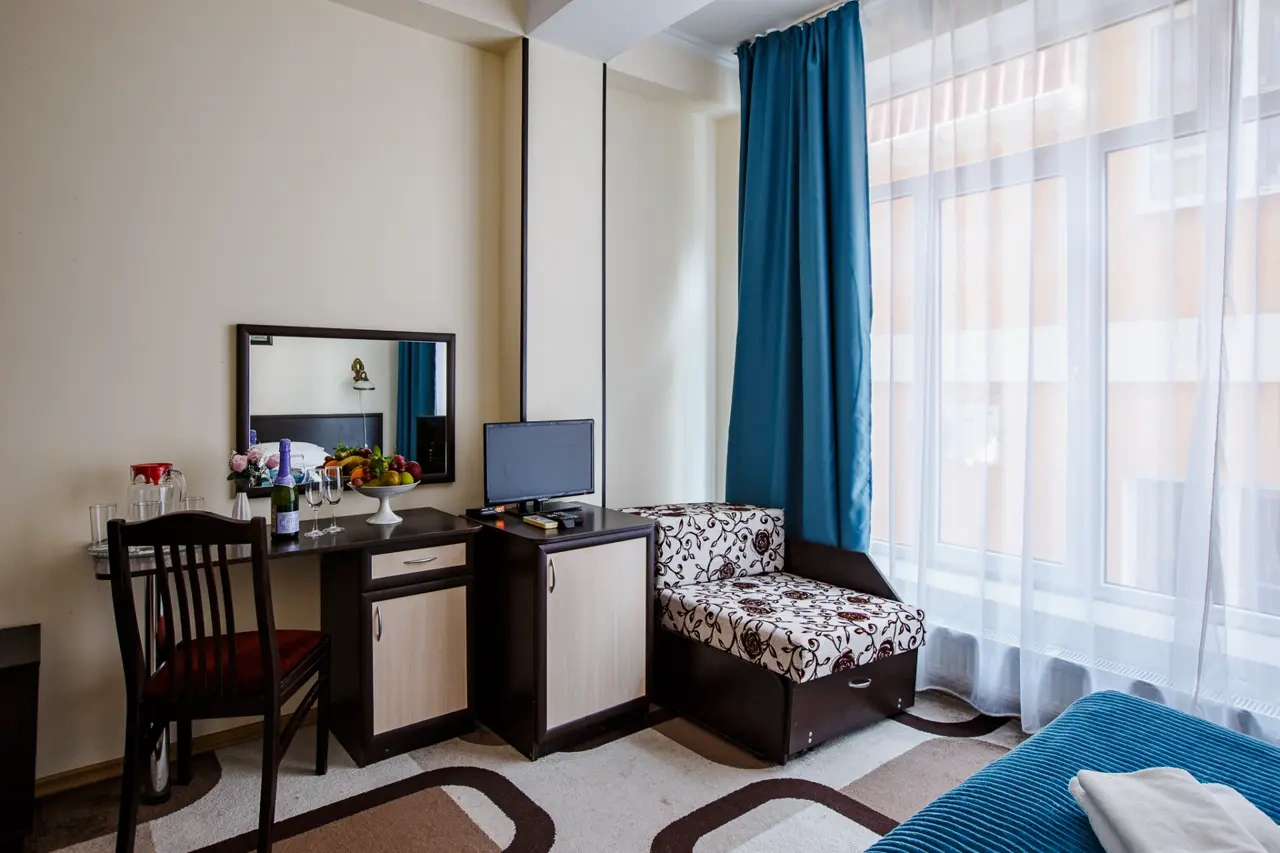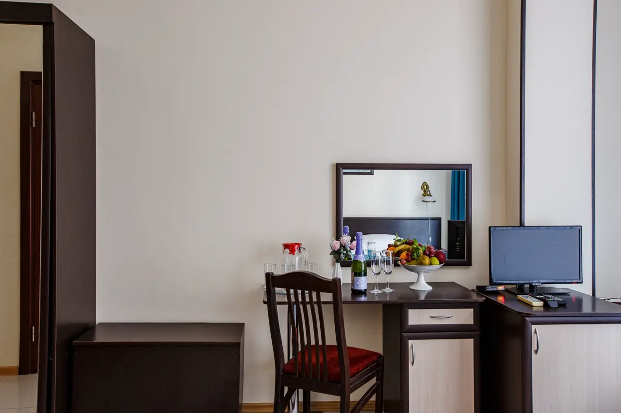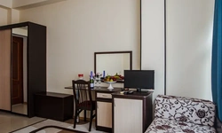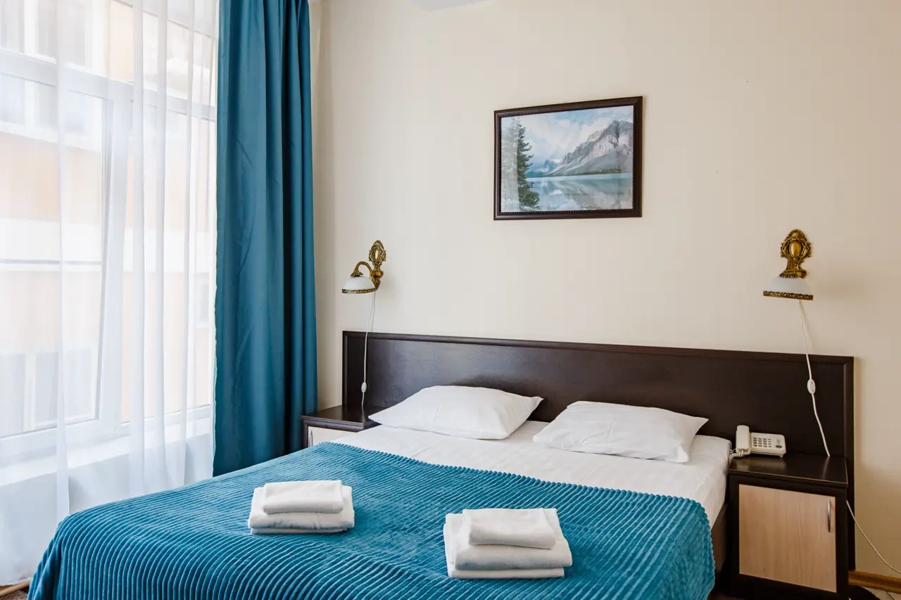 Хороший отель.Обслуживание замечательное,админы вежливые и учтивые.В номере чистота. Сам номер обычный , но есть все.Есть Wi-fi, работает хорошо.Есть набор средств личной гигиены. В отеле можно поесть , завтраки нормальные.Цена=качеству, мне понравилось. Набережная и доступность к ней шикарно