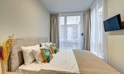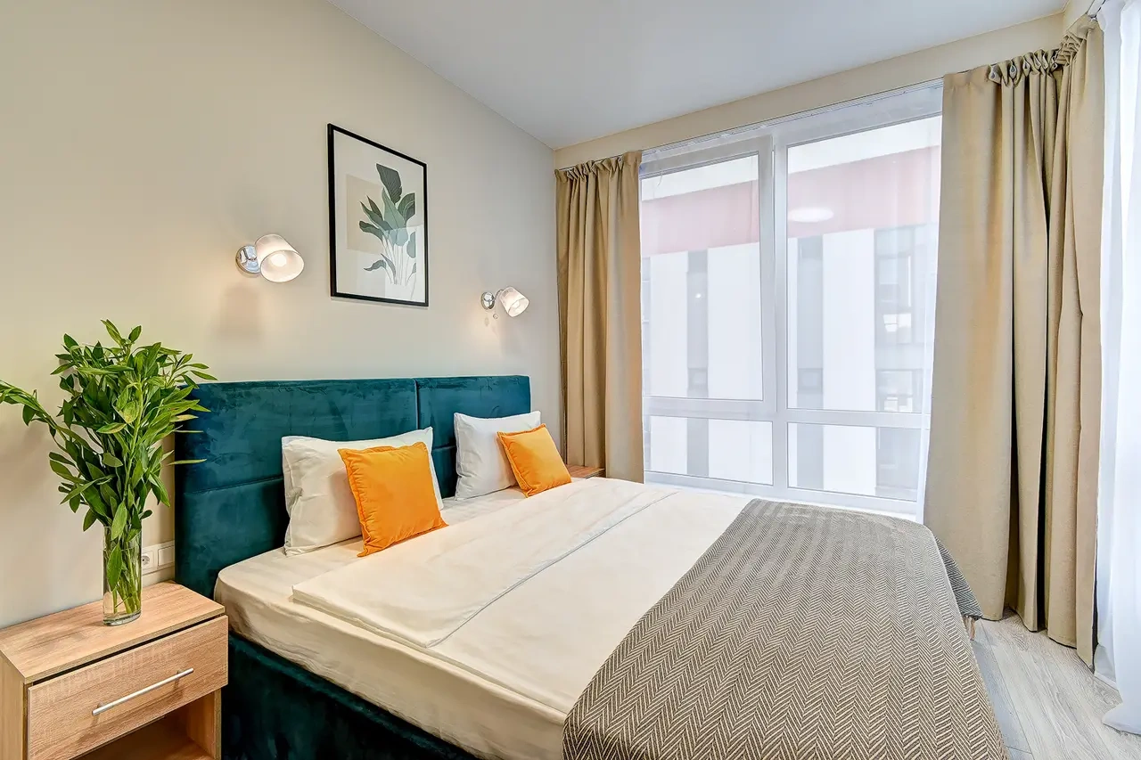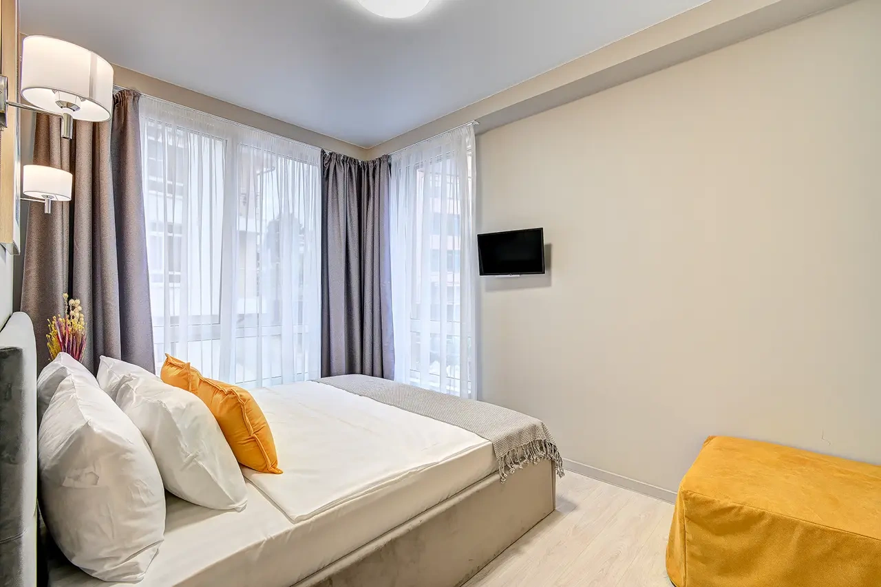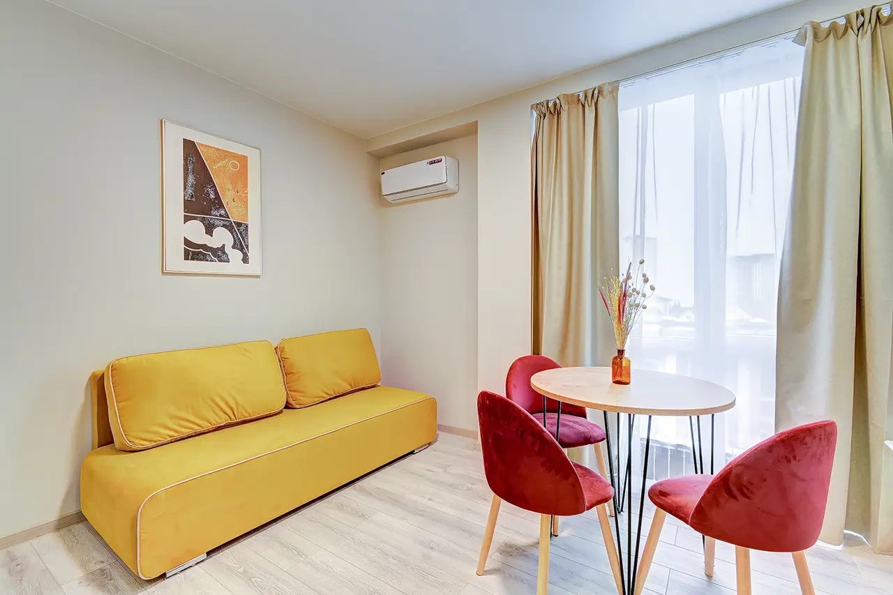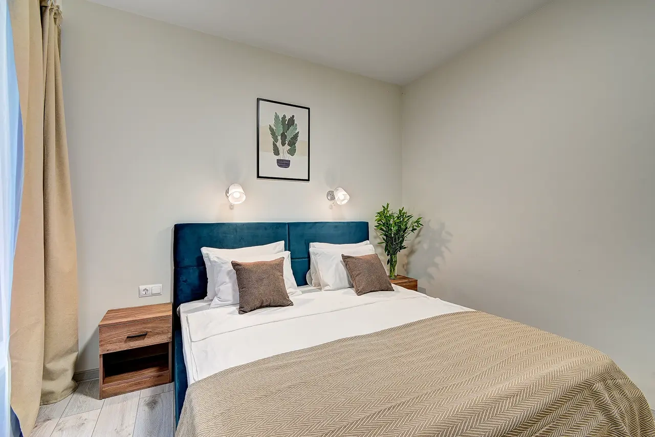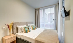 Уютные апартаменты для размещения одного, двух или трех гостей 28 кв.м. В номере: одна двуспальная кровать с ортопедическим матрасом, раскладывающийся пуф (доп место), качественное постельное белье, удобные подушки и одеяла. Прикроватные тумбочки, шкаф, ТВ, холодильник, посуда, кондиционер. Кухня, полностью укомплектованная. Санузел оснащен душем и всем необходимым. Косметические принадлежности, набор полотенец.