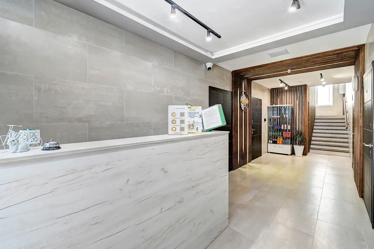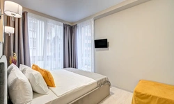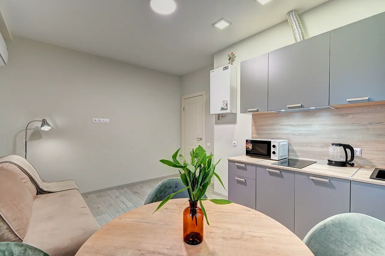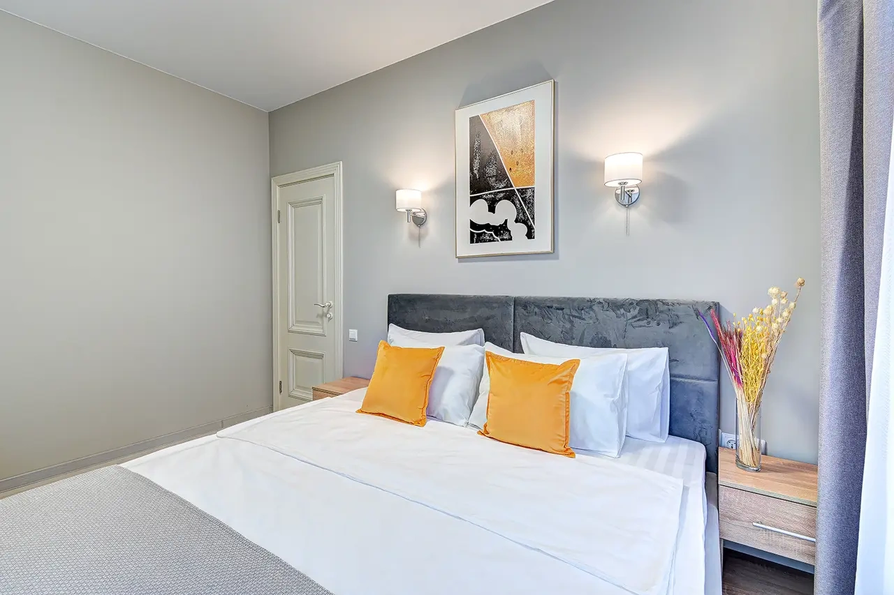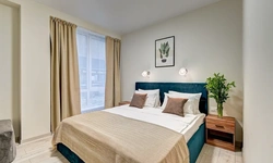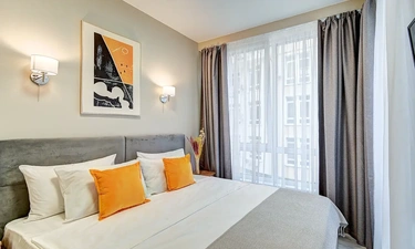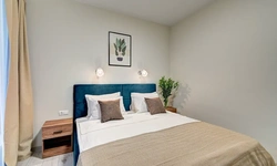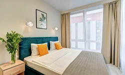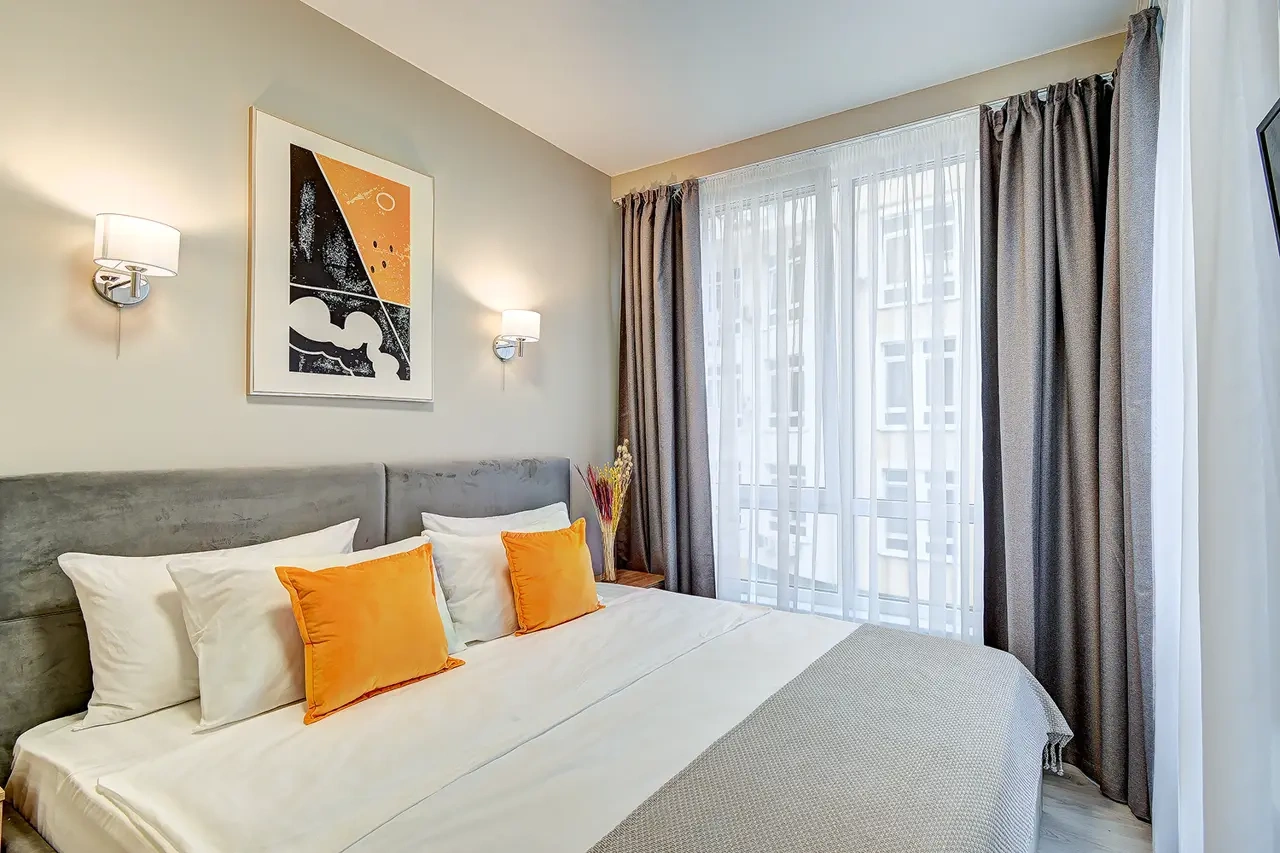 Уютные апартаменты для размещения одного, двух или трех гостей 28 кв.м. В номере: одна двуспальная кровать с ортопедическим матрасом, раскладывающийся пуф (доп место), качественное постельное белье, удобные подушки и одеяла. Прикроватные тумбочки, шкаф, ТВ, холодильник, посуда, кондиционер. Кухня, полностью укомплектованная. Санузел оснащен душем и всем необходимым. Косметические принадлежности, набор полотенец.