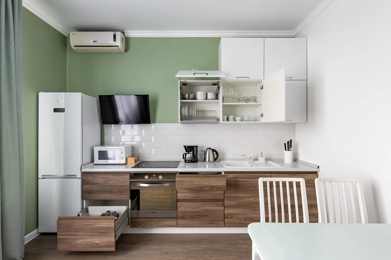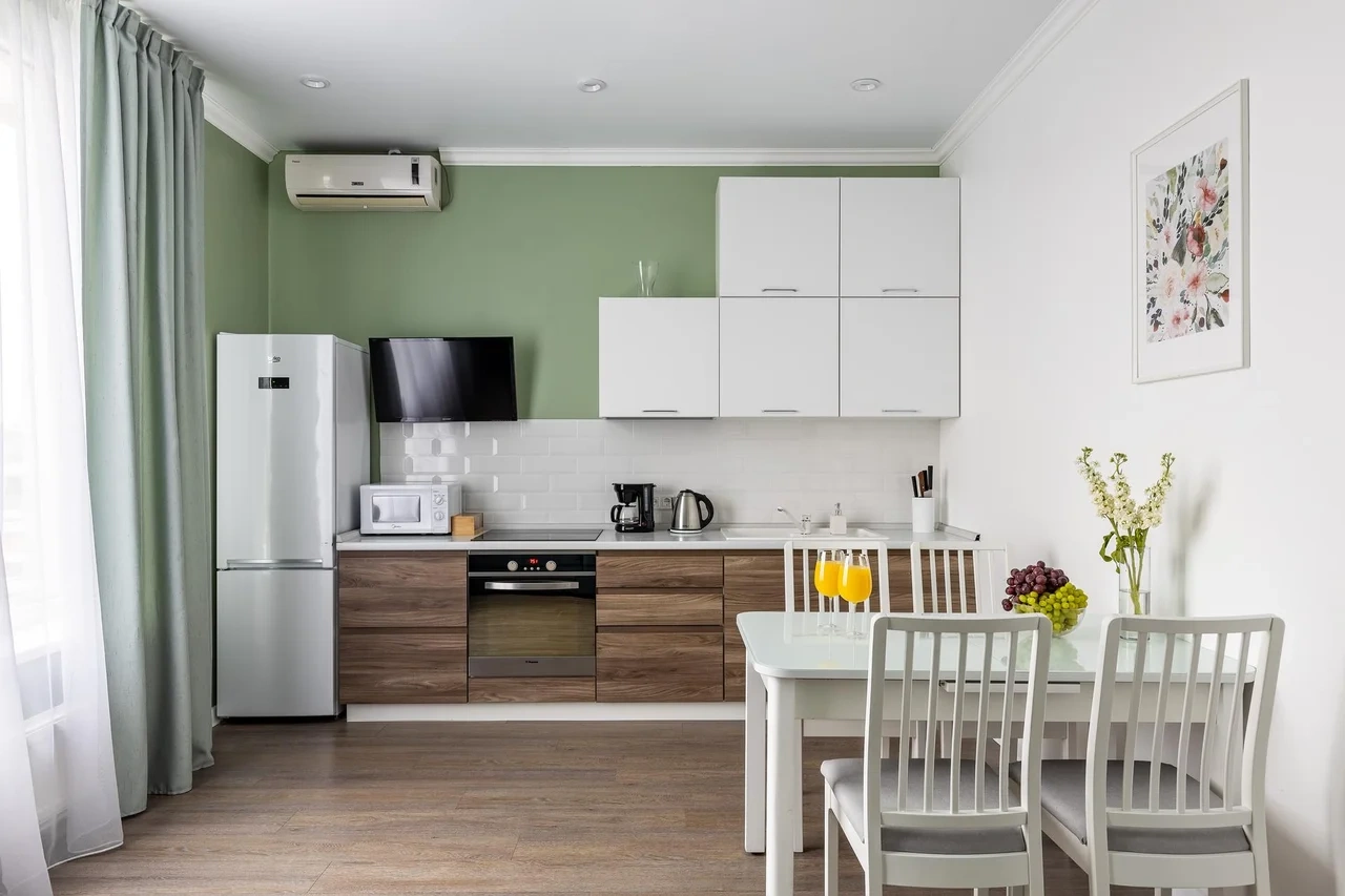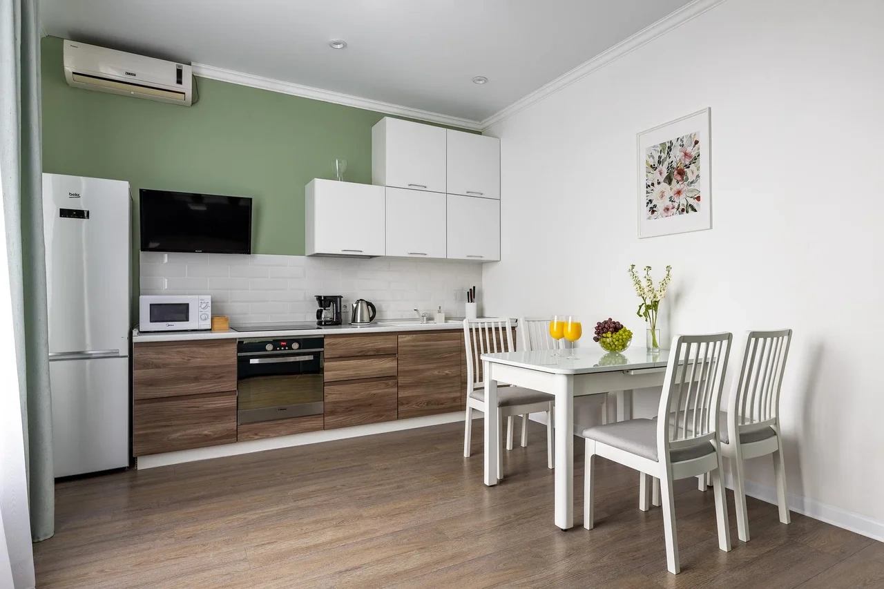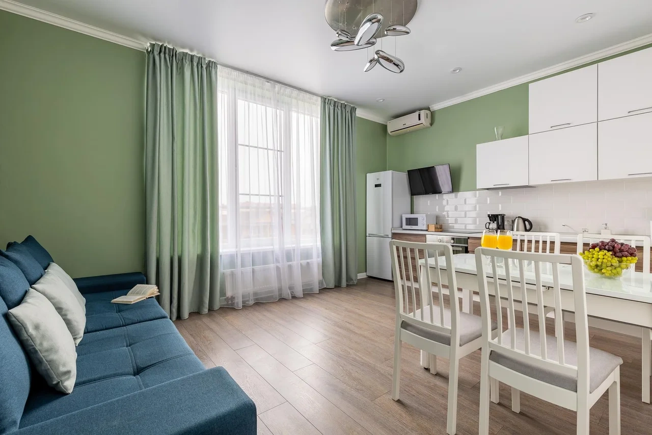 Хорошие 2-х комнатные апартаменты, современный ремонт, хороший матрас на большой кровати. Большая кухня с хорошим оснащением для готовки самостоятельно. На кухне есть еще спальное место при необходимости. Территория вокруг апартаментов закрытая с фонтаном или детским бассейном (не разобрались), можно спокойно отпускать детей гулять рядом с домом. В апартаментах все чисто, посуда то же вся чистая. Все вопросы решали по мере возникновения.