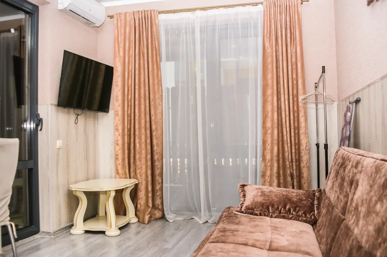 Апартаменты данного класса комфортности обеспечены всем необходимым для приятного времяпровождения. В наполнение апартаментов входят: Мини-кухня Шкаф/Гардероб Электрический чайник Микроволновая печь Плита для приготовления пищи и холодильник двуспальная кровать раскладной диван стиральная машина фен 2 телевизора с плоским экраном и кабельным ТВ, Wi-Fi. А встретить рассвет или проводить закат Вы сможете на небольшом и уютном балконе.