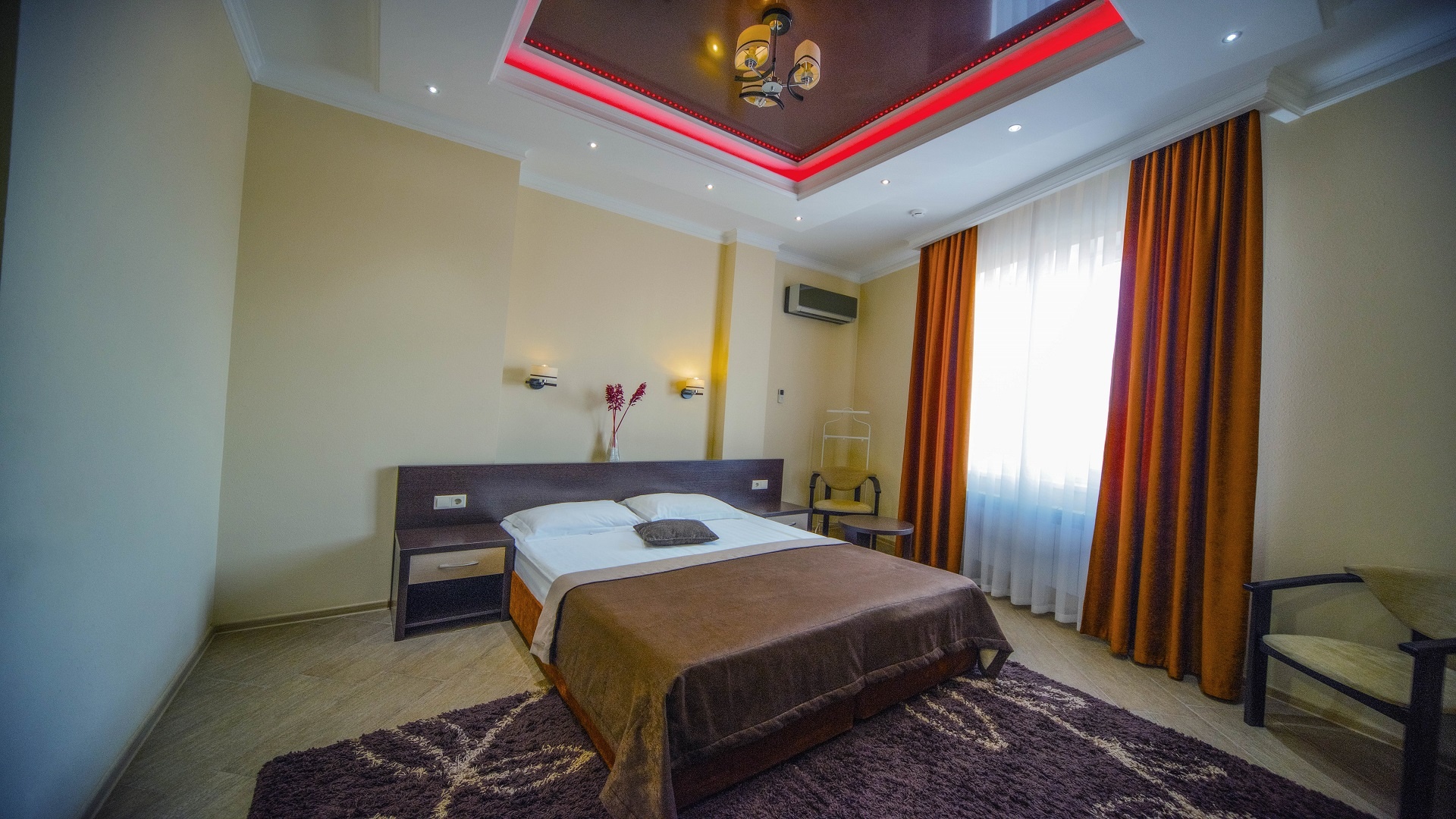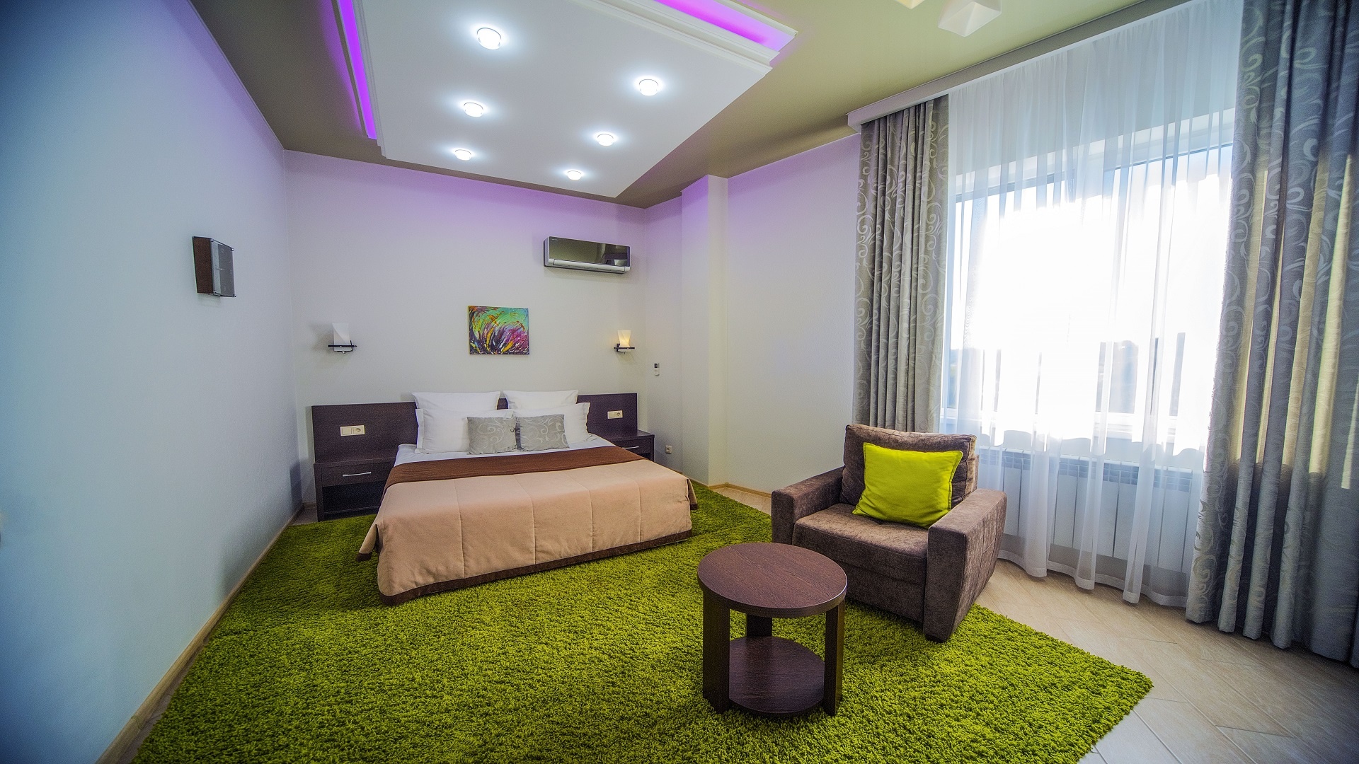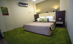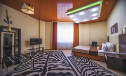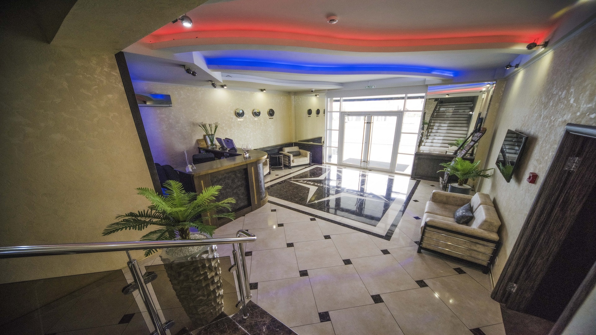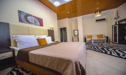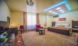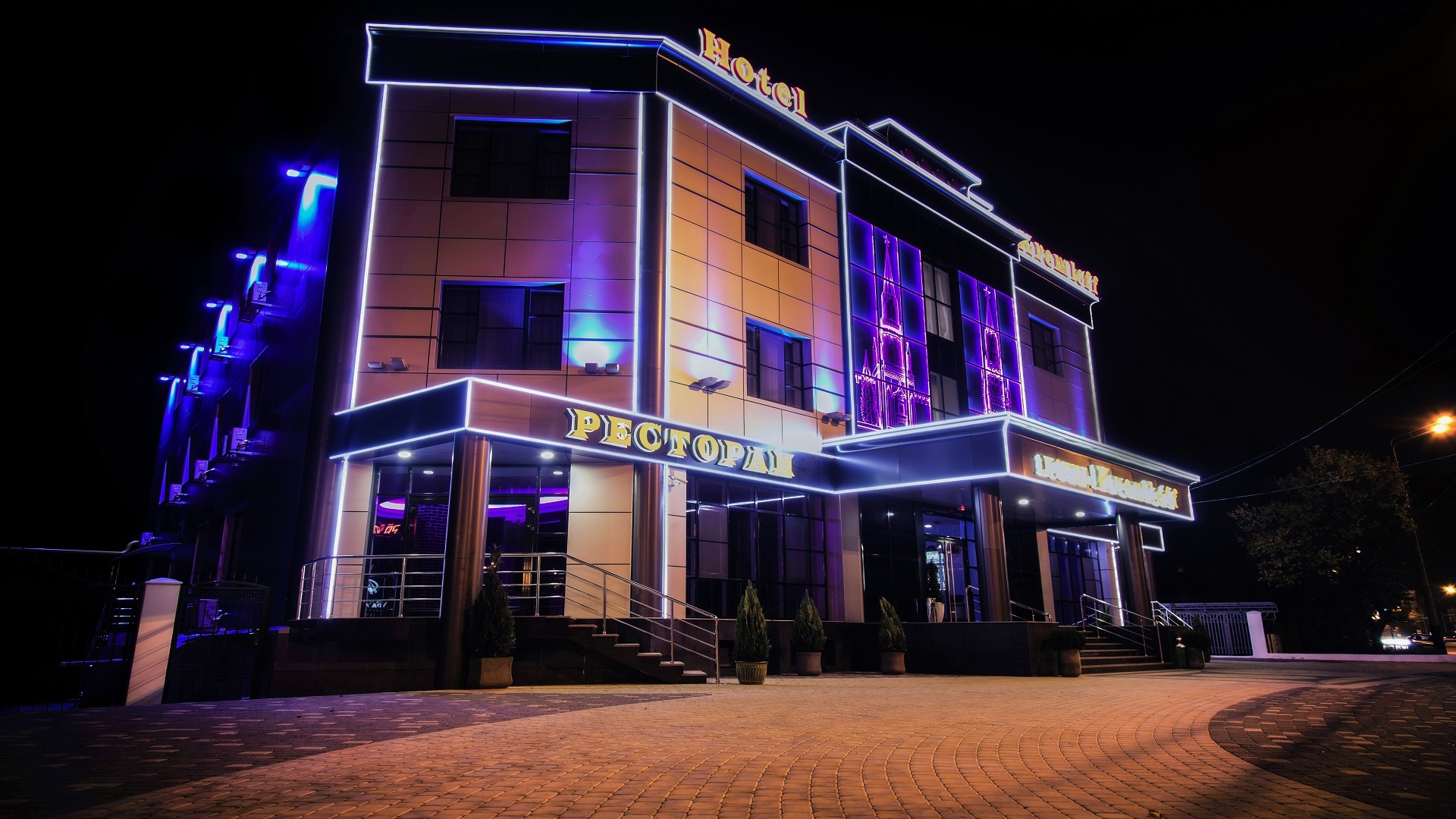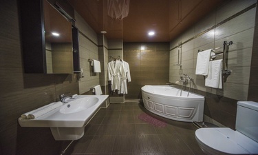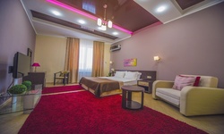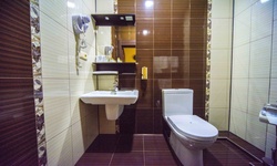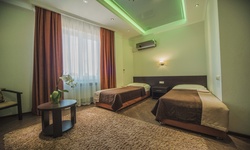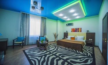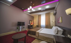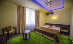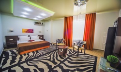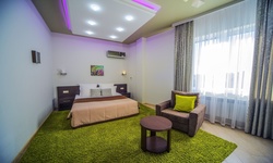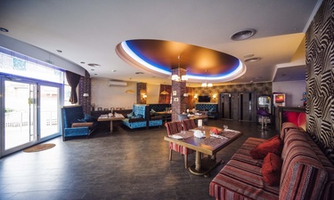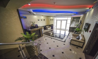 Отель имеет очень удобное расположение и хорошую транспортную развязку, расположенный в южной стороне города, всего в 5 минутах езды от международного аэропорта, на гостевой улице. До центра города, Ж.Д и авто вокзалов его отделяет не более 10 км., до которых 15-20 минут езды на машине. Интерьер выдержан в стиле Hi-tec.