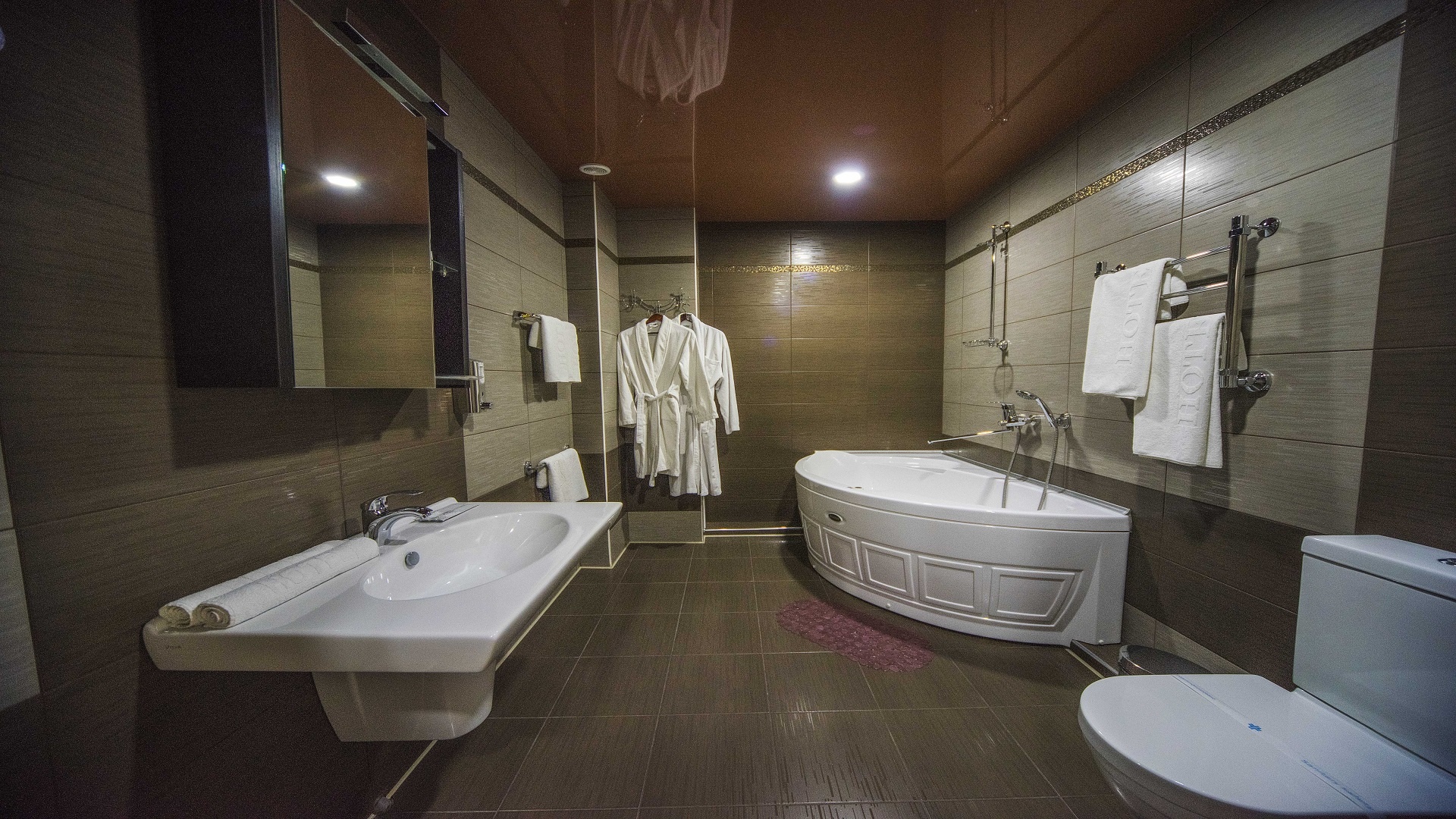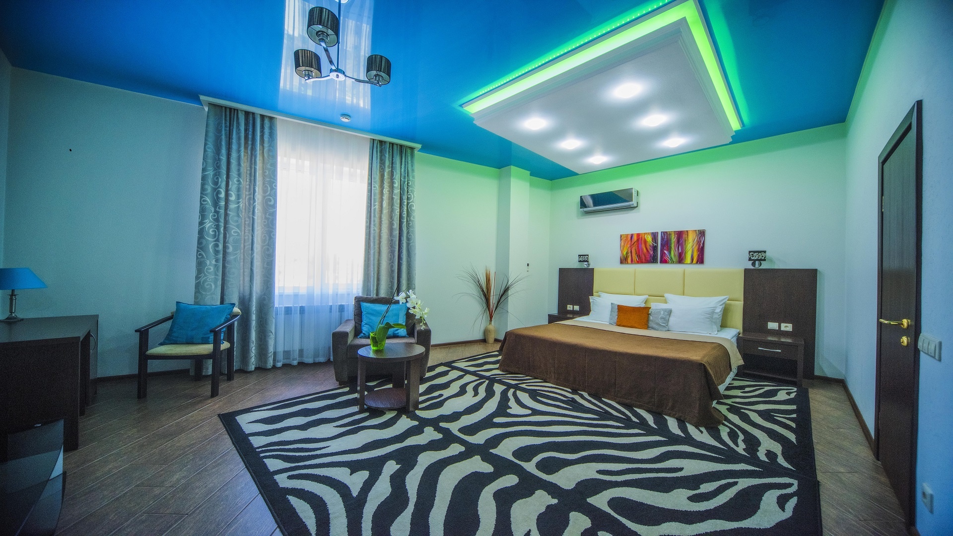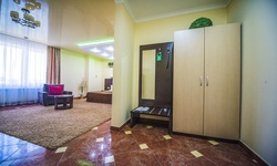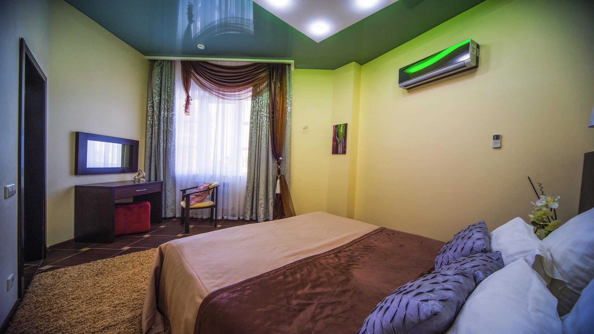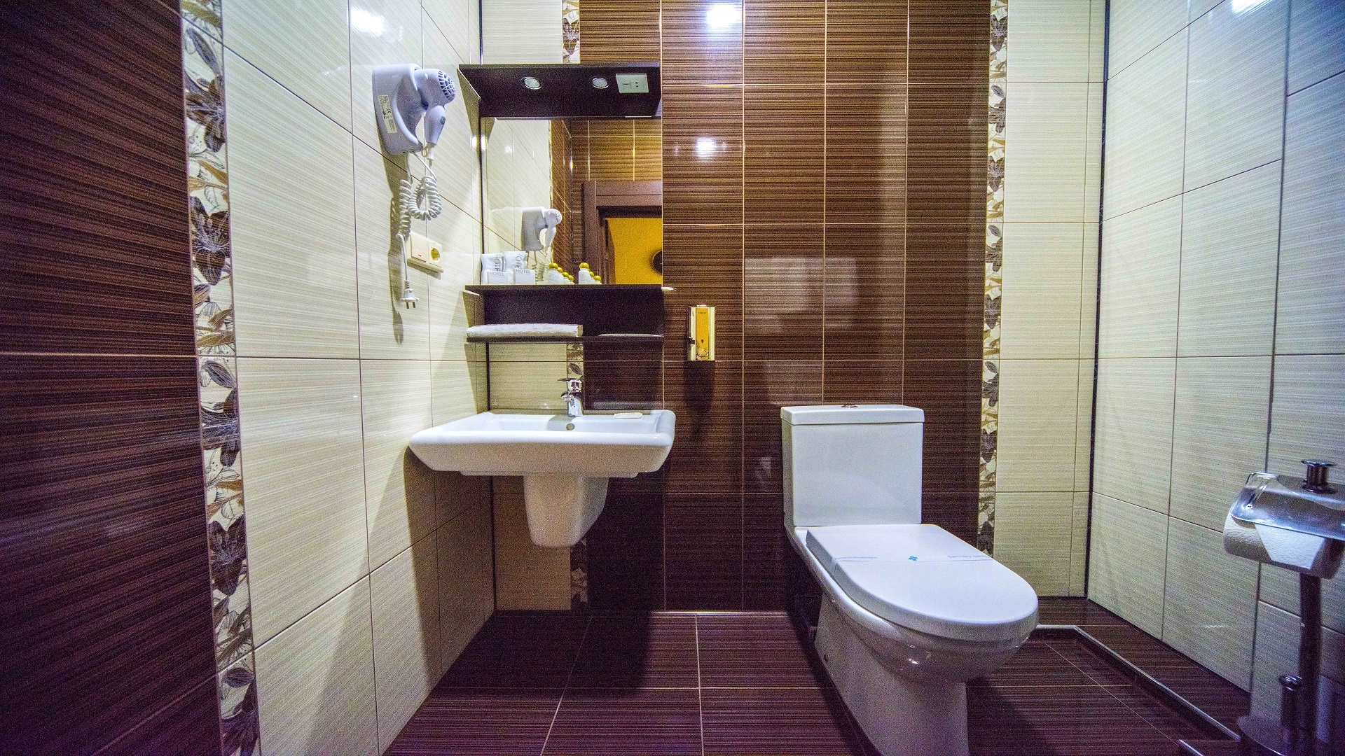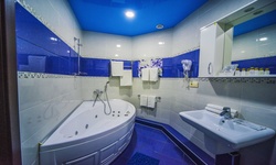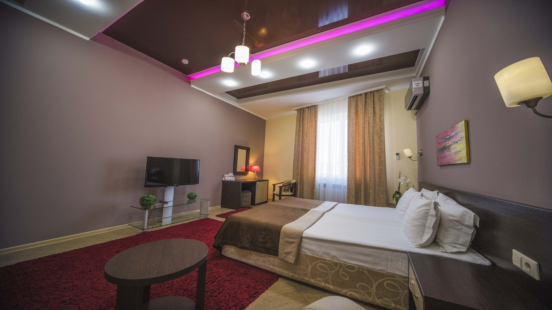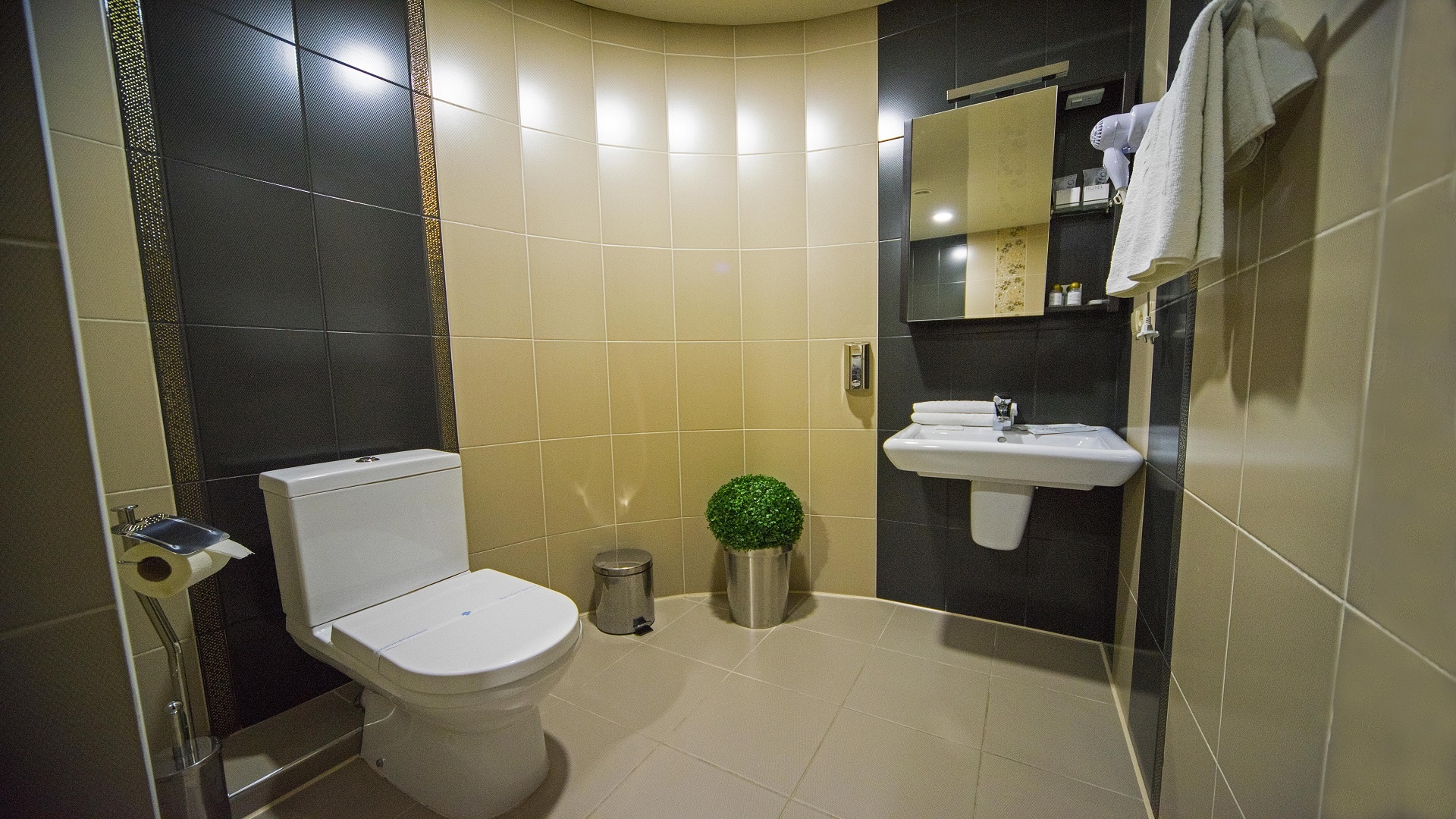 Отель имеет очень удобное расположение и хорошую транспортную развязку, расположенный в южной стороне города, всего в 5 минутах езды от международного аэропорта, на гостевой улице. До центра города, Ж.Д и авто вокзалов его отделяет не более 10 км., до которых 15-20 минут езды на машине. Интерьер выдержан в стиле Hi-tec.