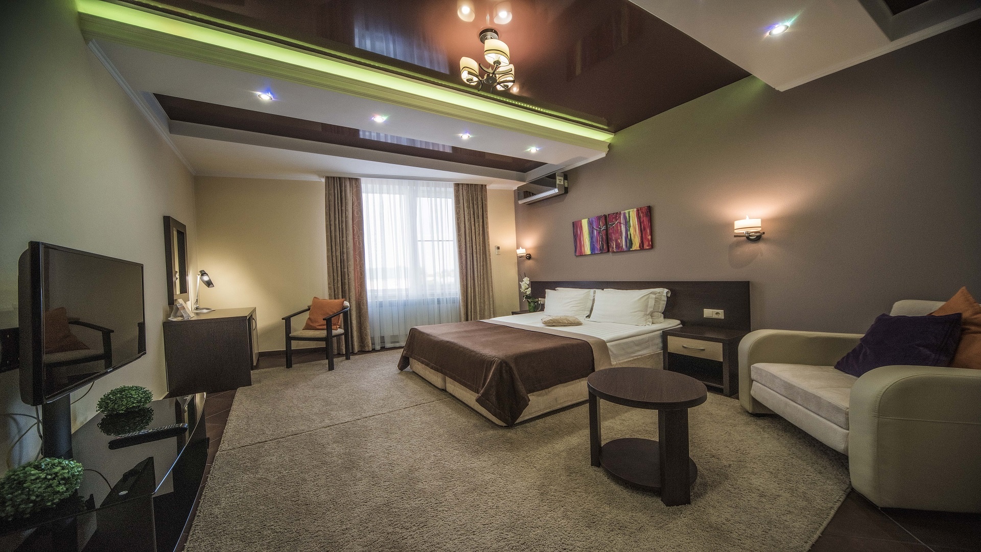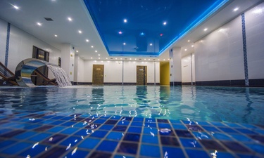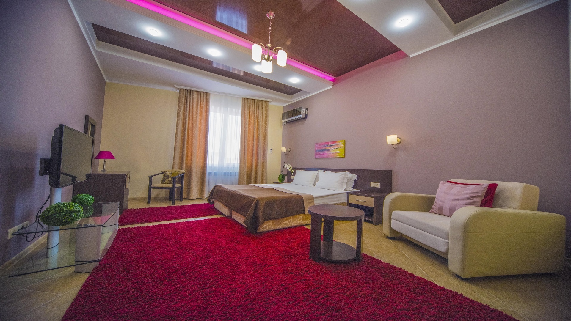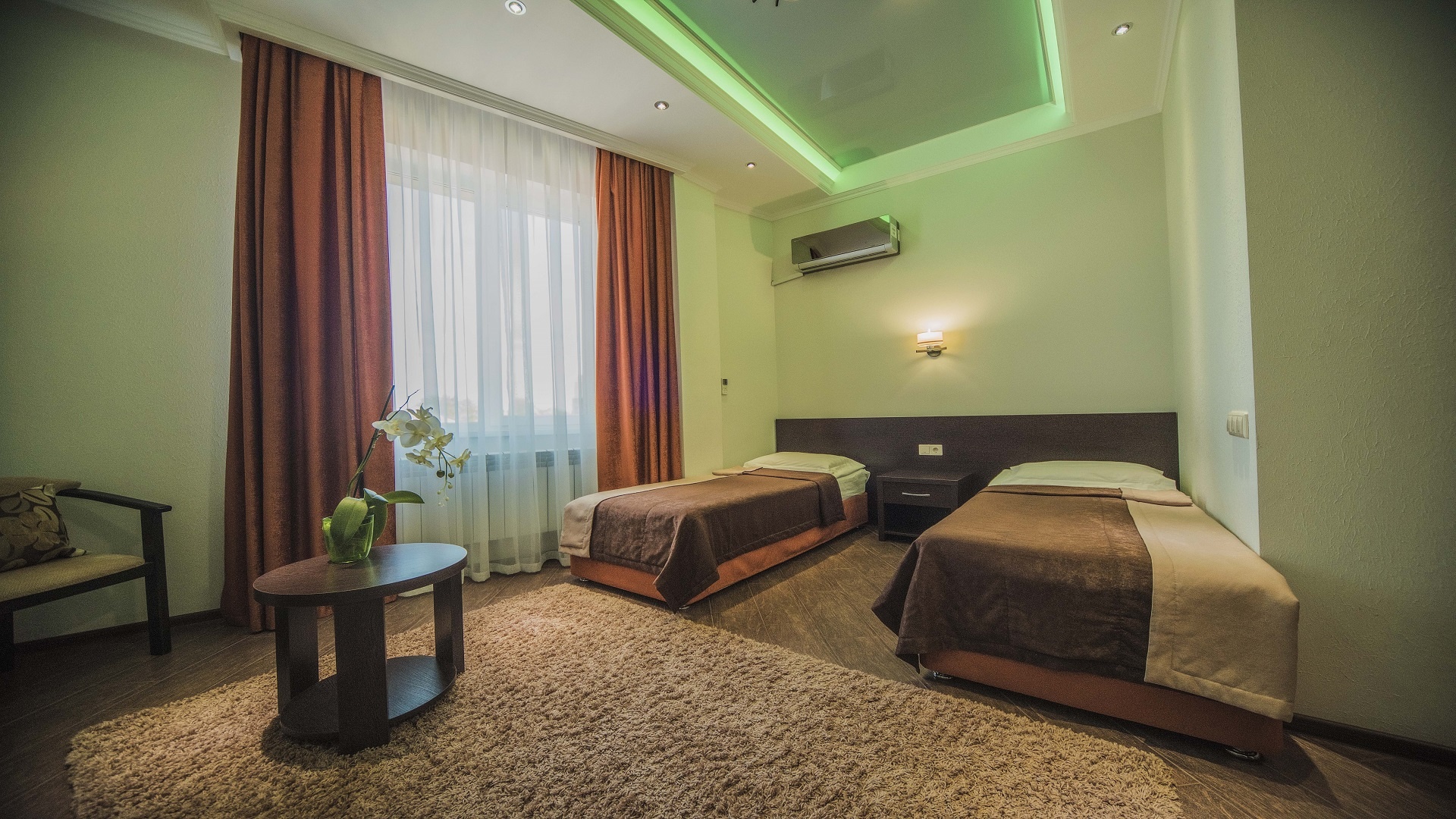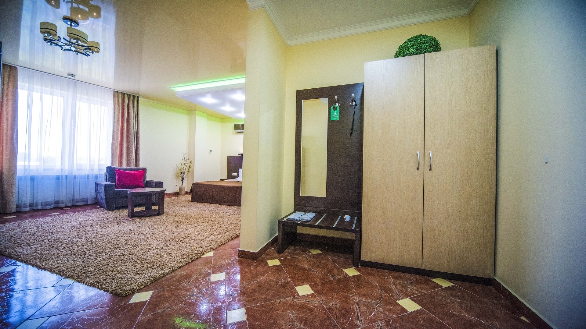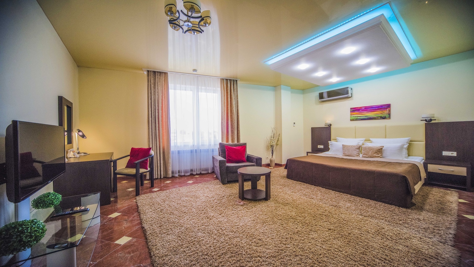 Отель имеет очень удобное расположение и хорошую транспортную развязку, расположенный в южной стороне города, всего в 5 минутах езды от международного аэропорта, на гостевой улице. До центра города, Ж.Д и авто вокзалов его отделяет не более 10 км., до которых 15-20 минут езды на машине. Интерьер выдержан в стиле Hi-tec.
