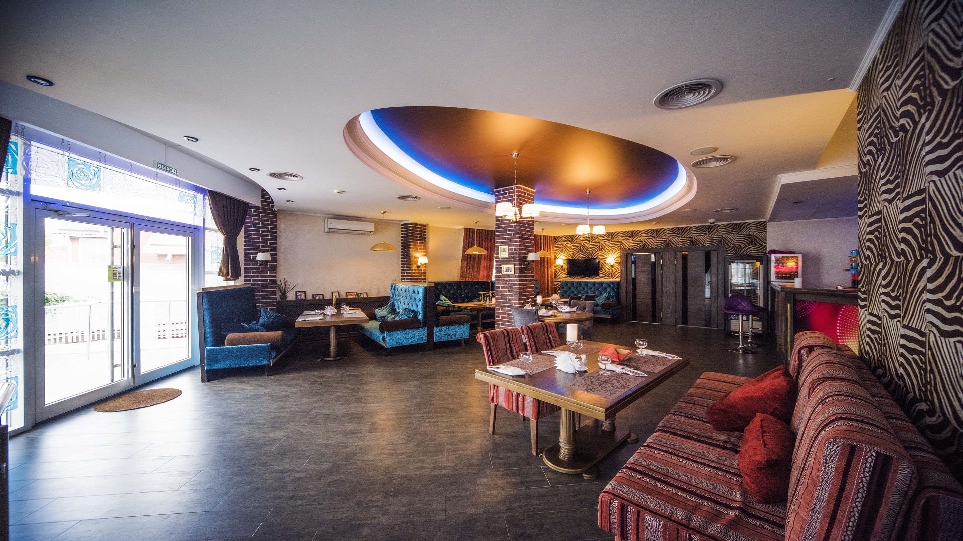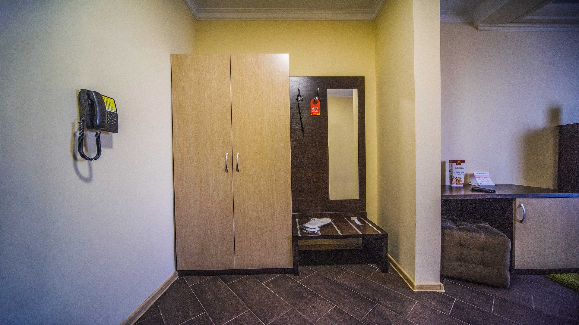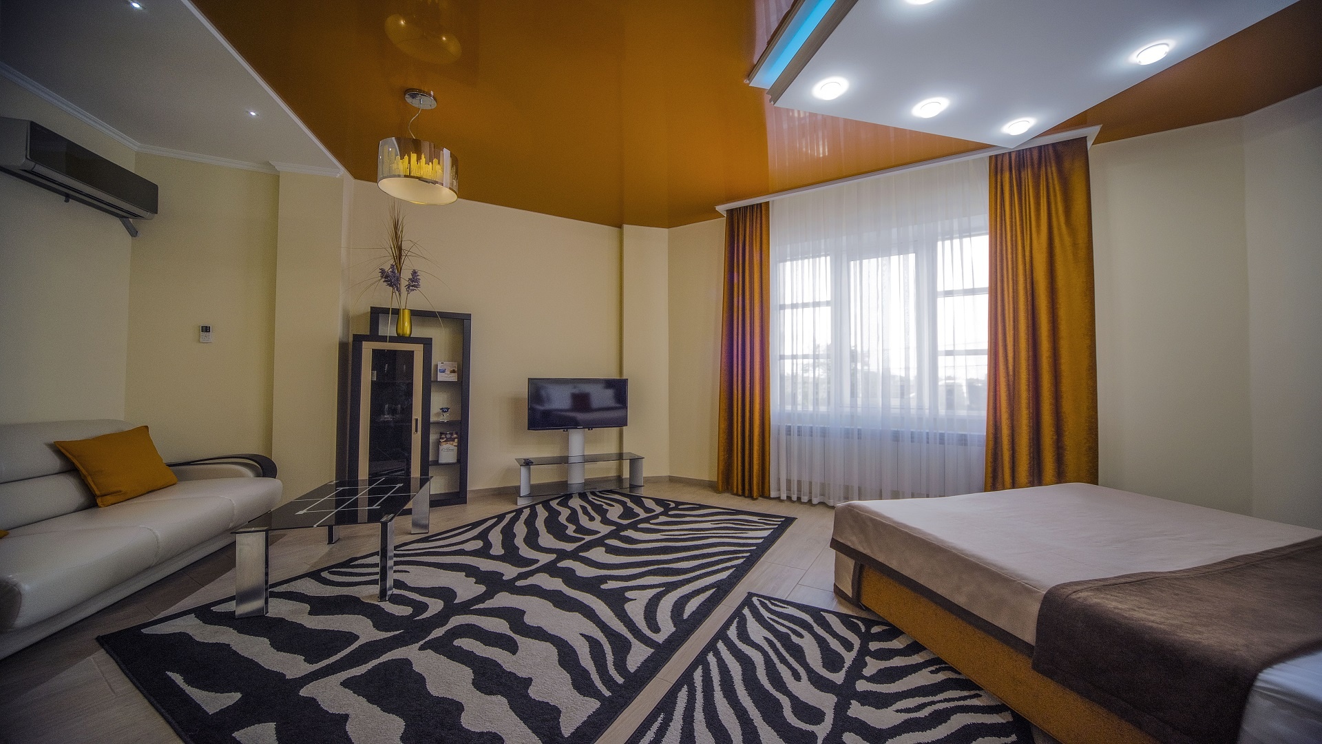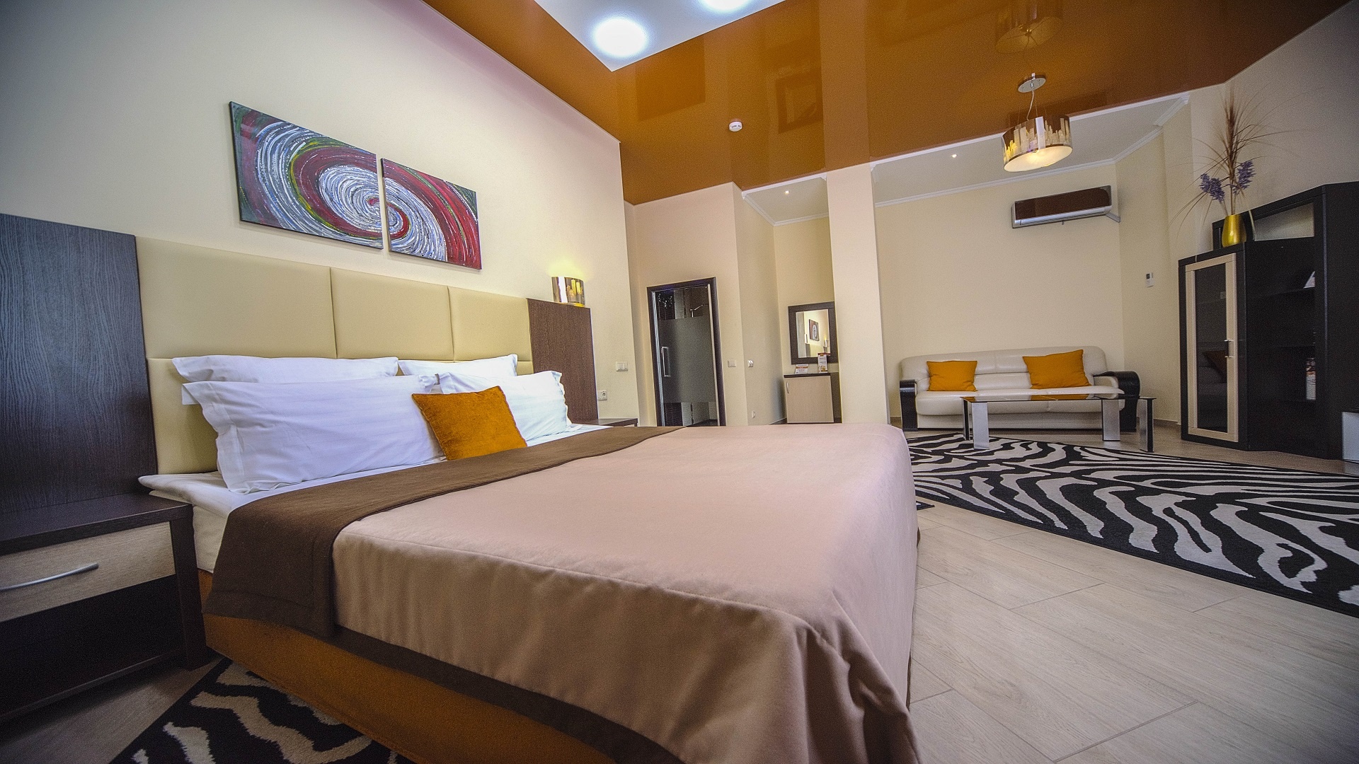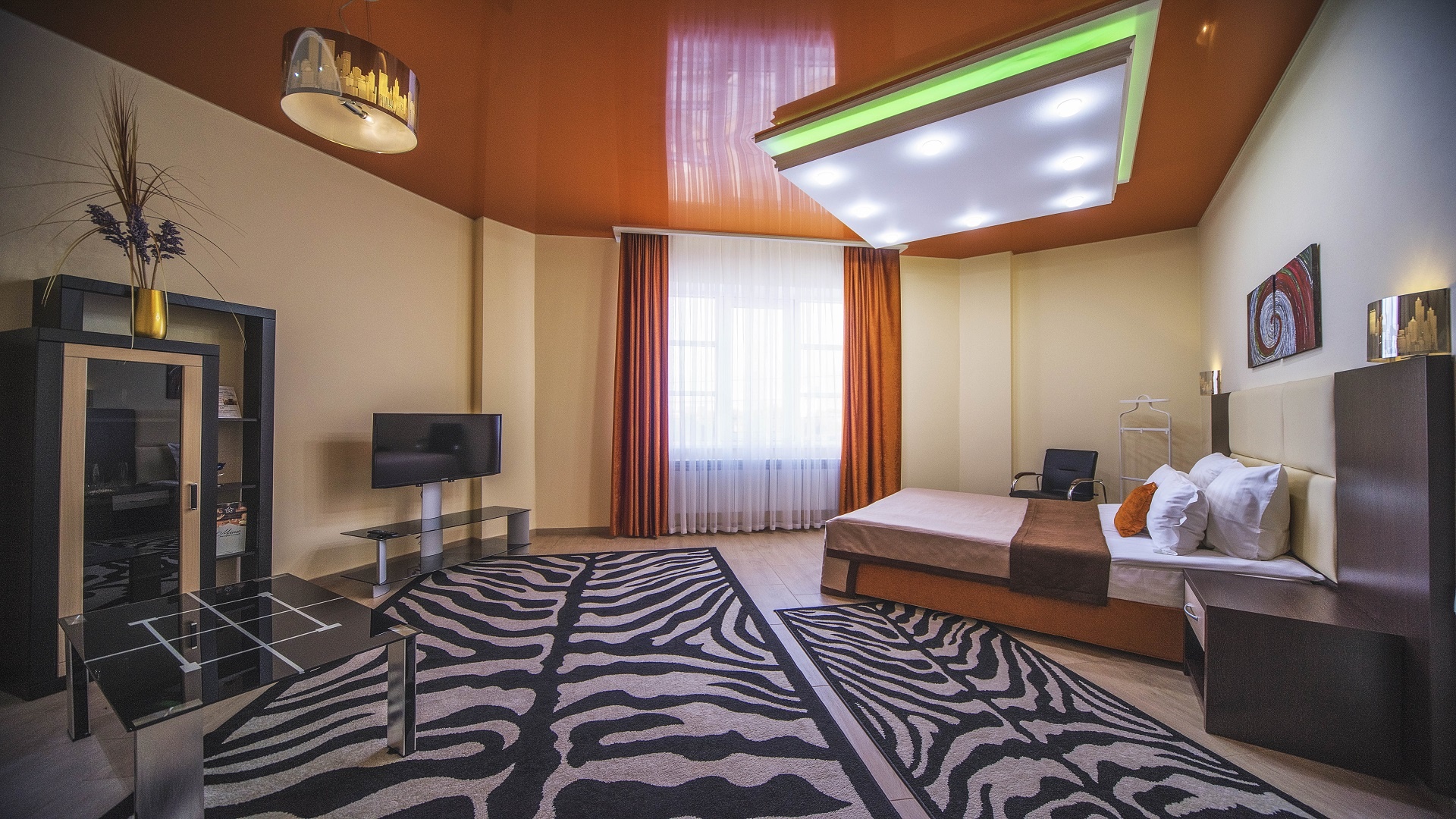Отель имеет очень удобное расположение и хорошую транспортную развязку, расположенный в южной стороне города, всего в 5 минутах езды от международного аэропорта, на гостевой улице. До центра города, Ж.Д и авто вокзалов его отделяет не более 10 км., до которых 15-20 минут езды на машине. Интерьер выдержан в стиле Hi-tec.