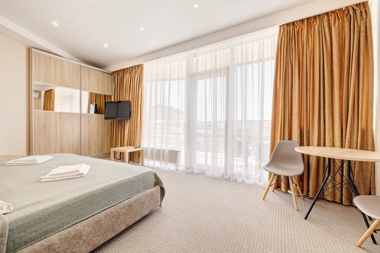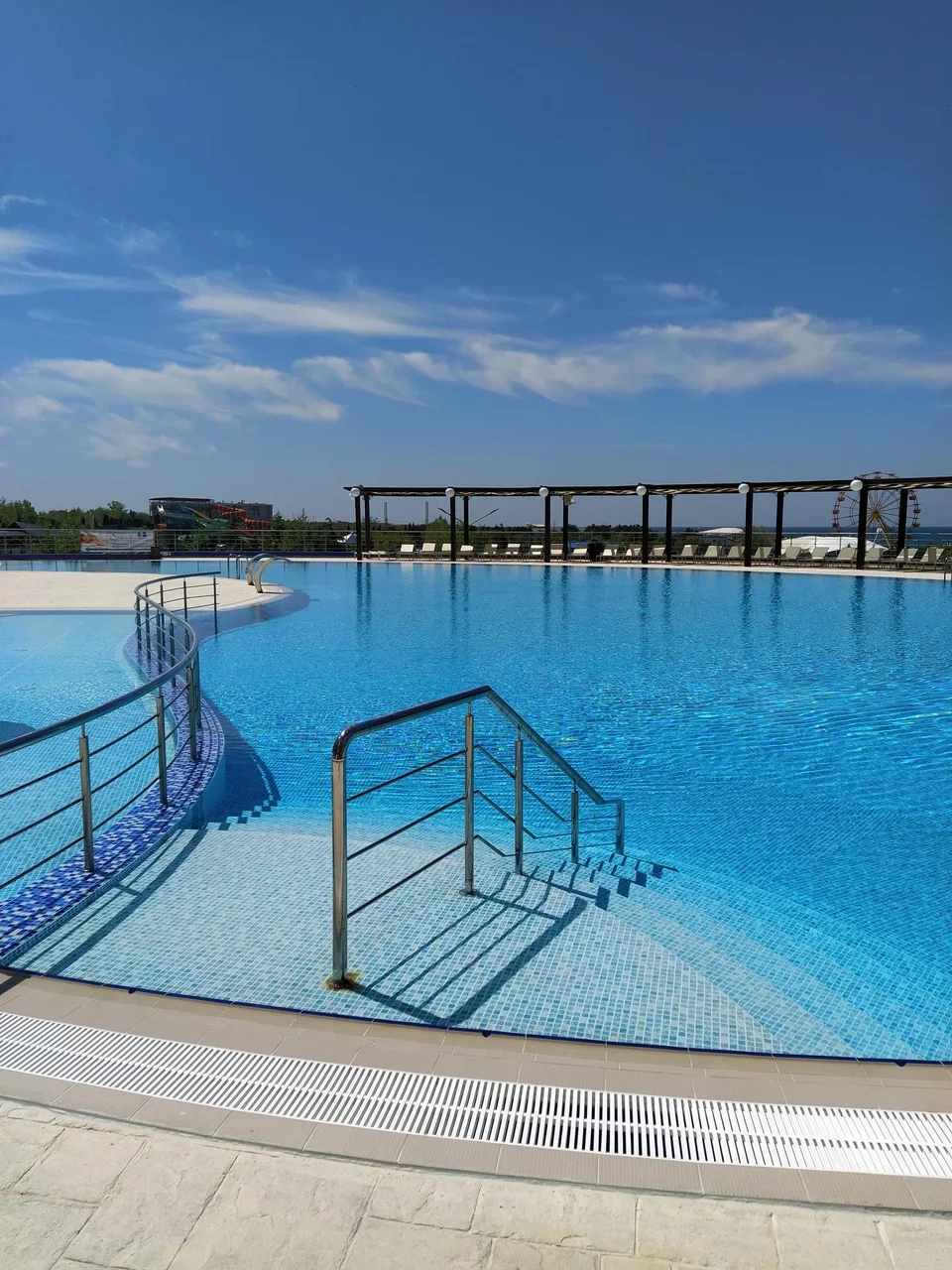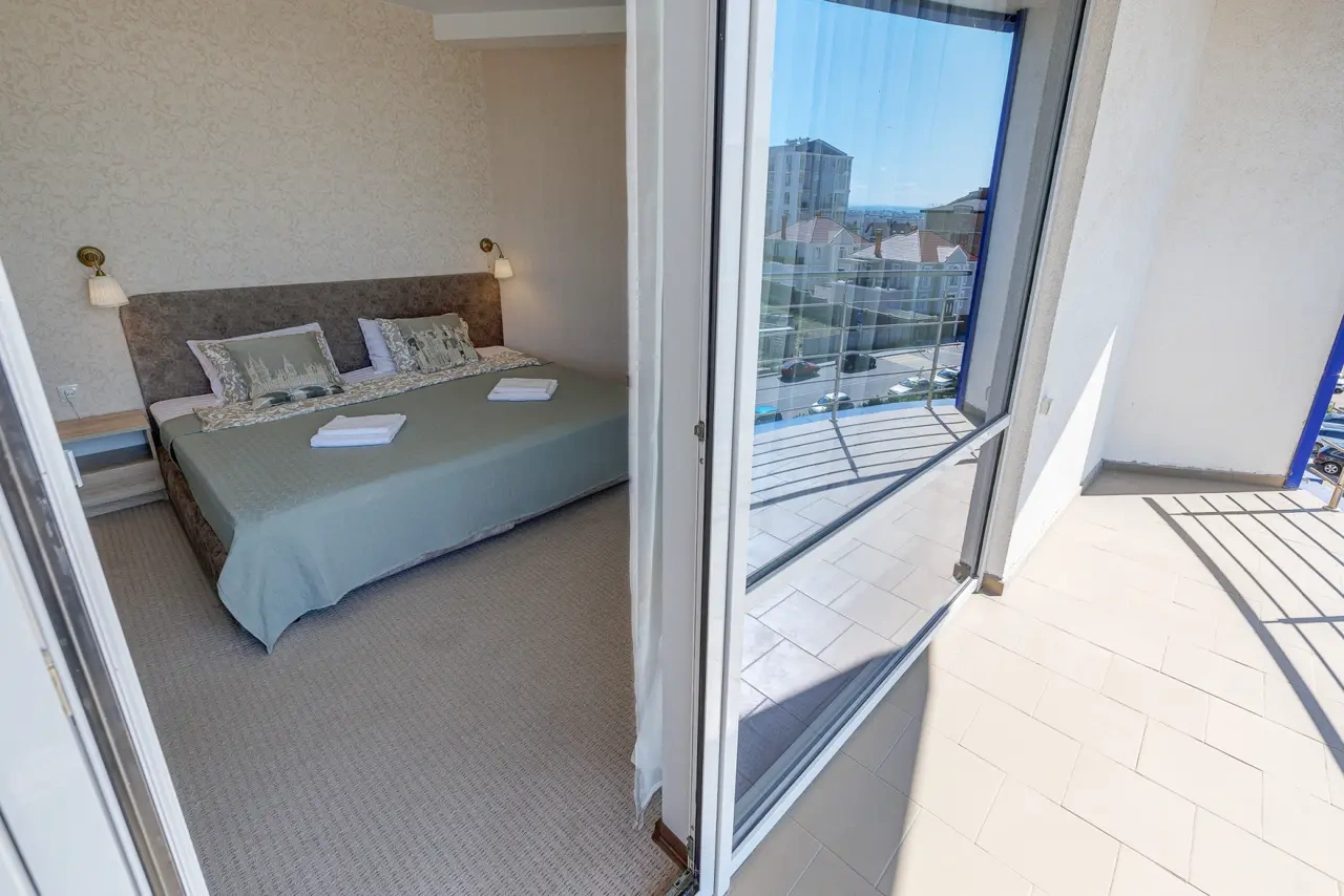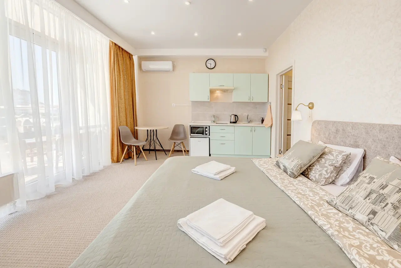 Апартаменты в 130 м. от моря в г. Севастополе. Площадь 31 кв. м. Двухспальная кровать, кухонная зона, холодильник, микроволновка, плита, чайник, посуда. Есть огромный балкон. Туалет, ванна, душ, фен. Великолепный открытый бассейн бесплатно, Спортивный и спа комплексы со скидкой.Парковка.