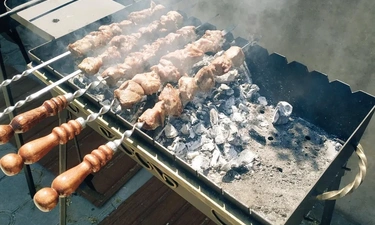 На улице мангальная зона, летняя кухня, зона отдыха.