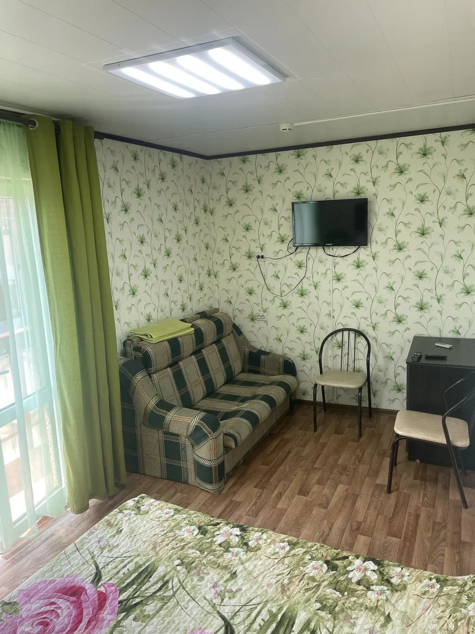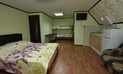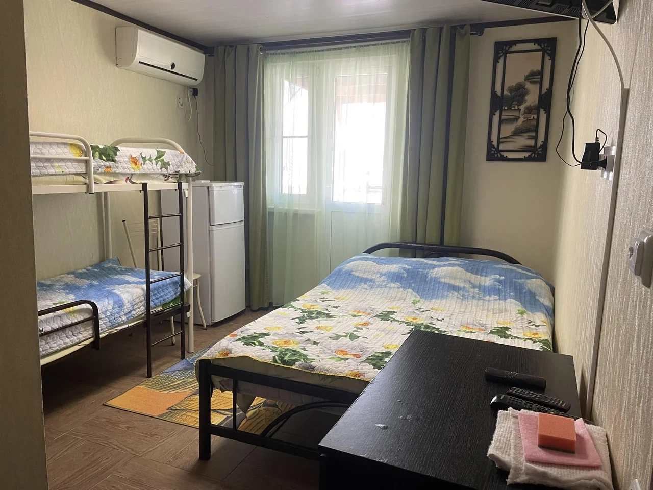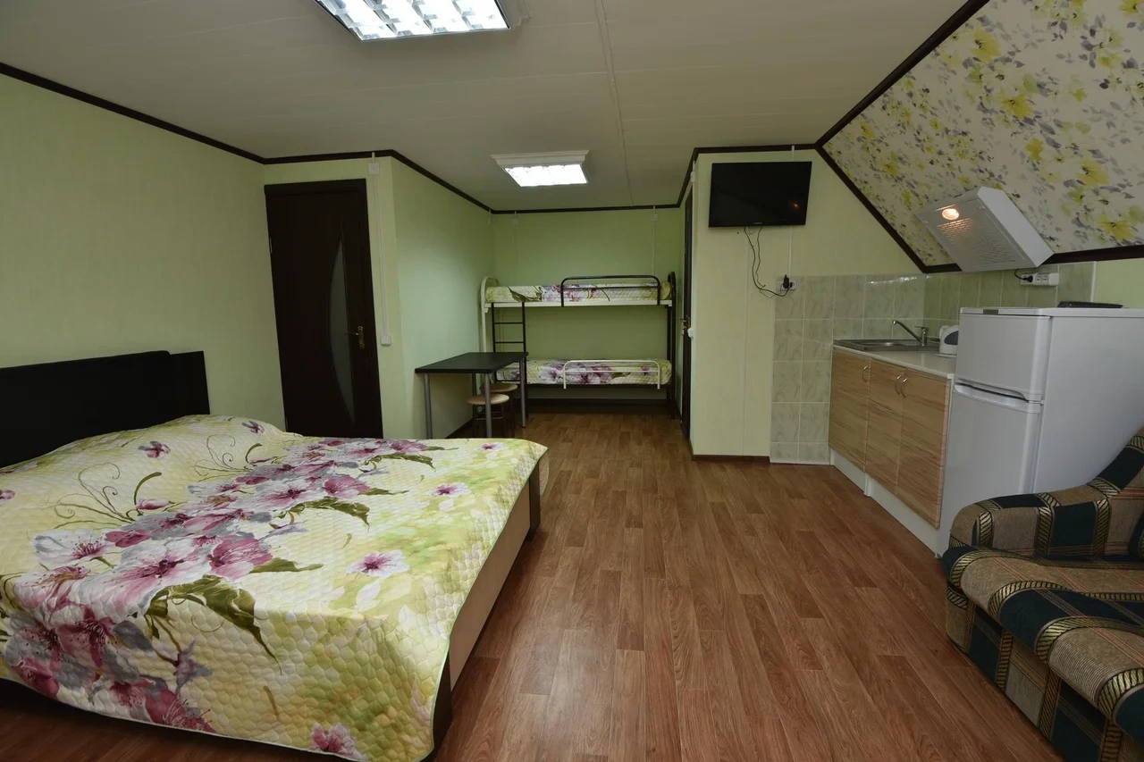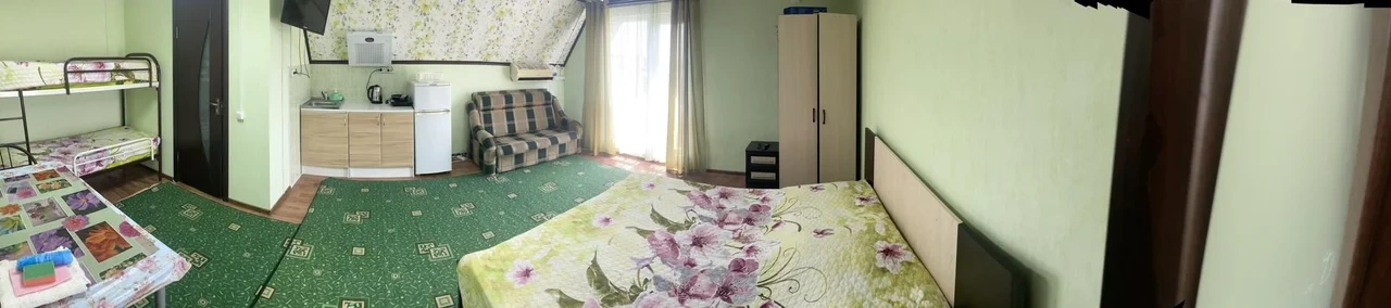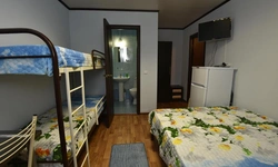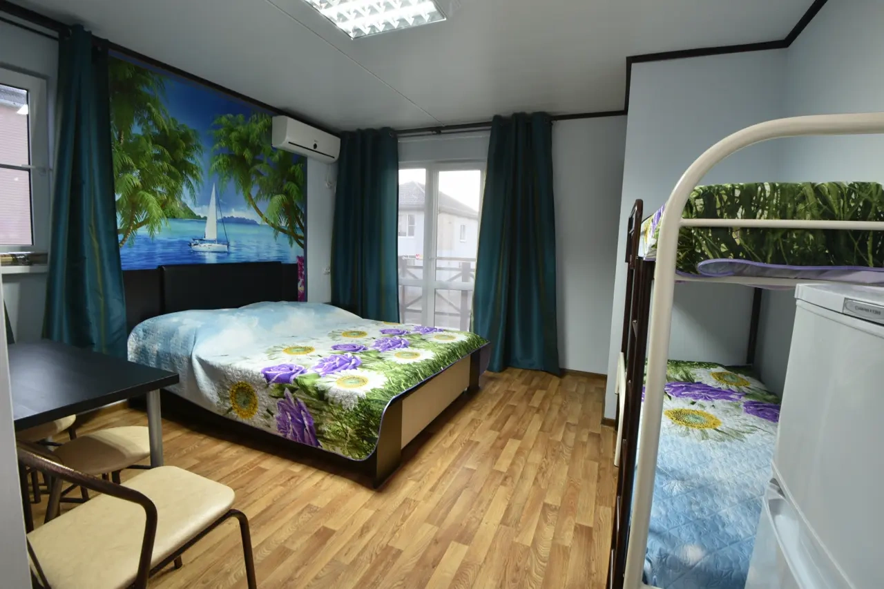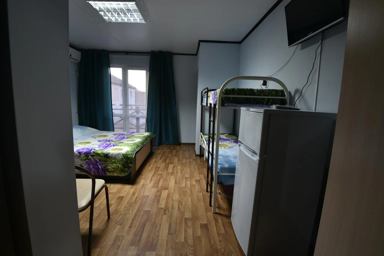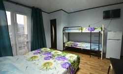 Одна двуспальная кровать, одна двухъярусная кровать, шкаф, тумбочка, телевизор, холодильник, санузел с душем, сплит-система, кухня в номере, стол, балкон.